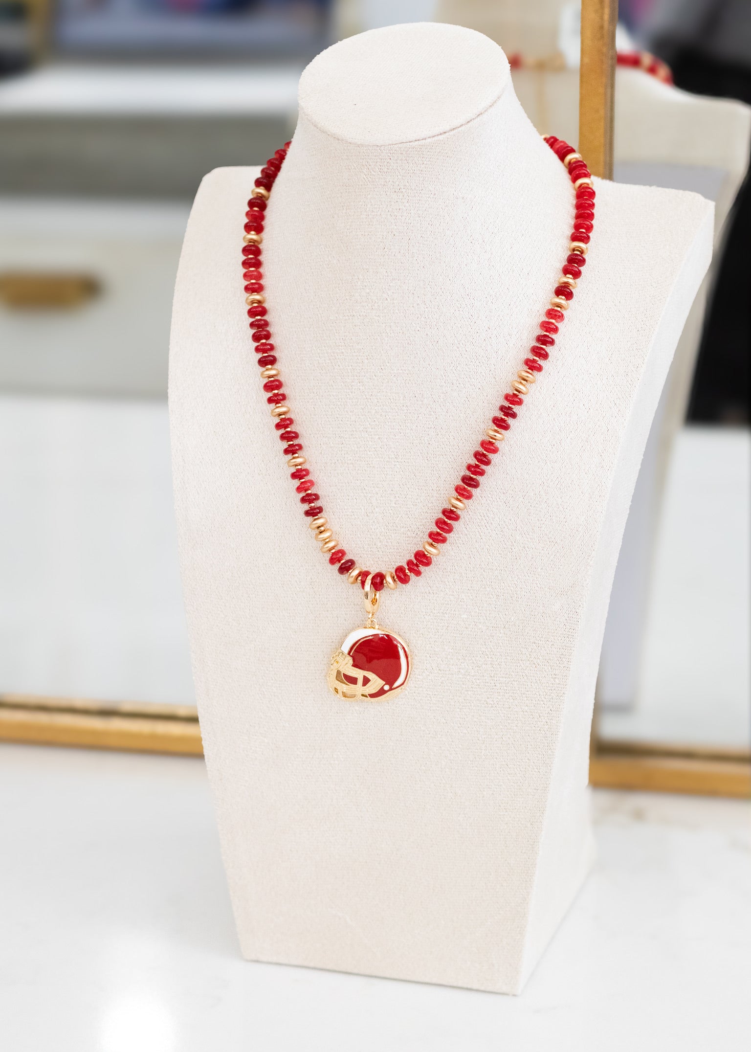 Show your game day spirit with this bold red beaded necklace featuring a gold football helmet pendant. The glossy red beads add the perfect pop of color, while the helmet charm brings a sporty-chic touch to any outfit. Perfect for tailgates, touchdowns, and team pride all season long.