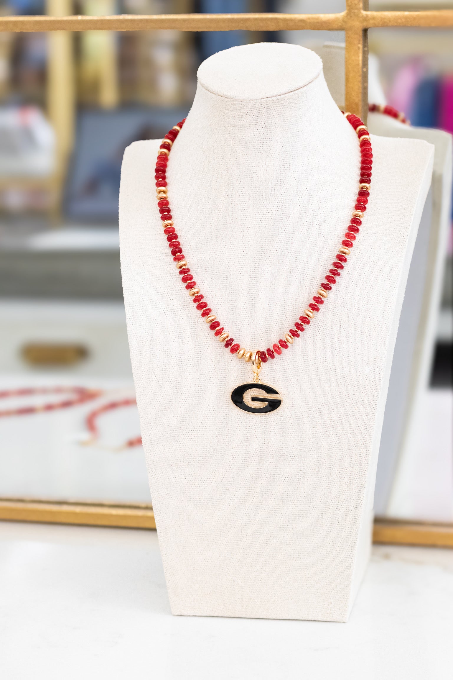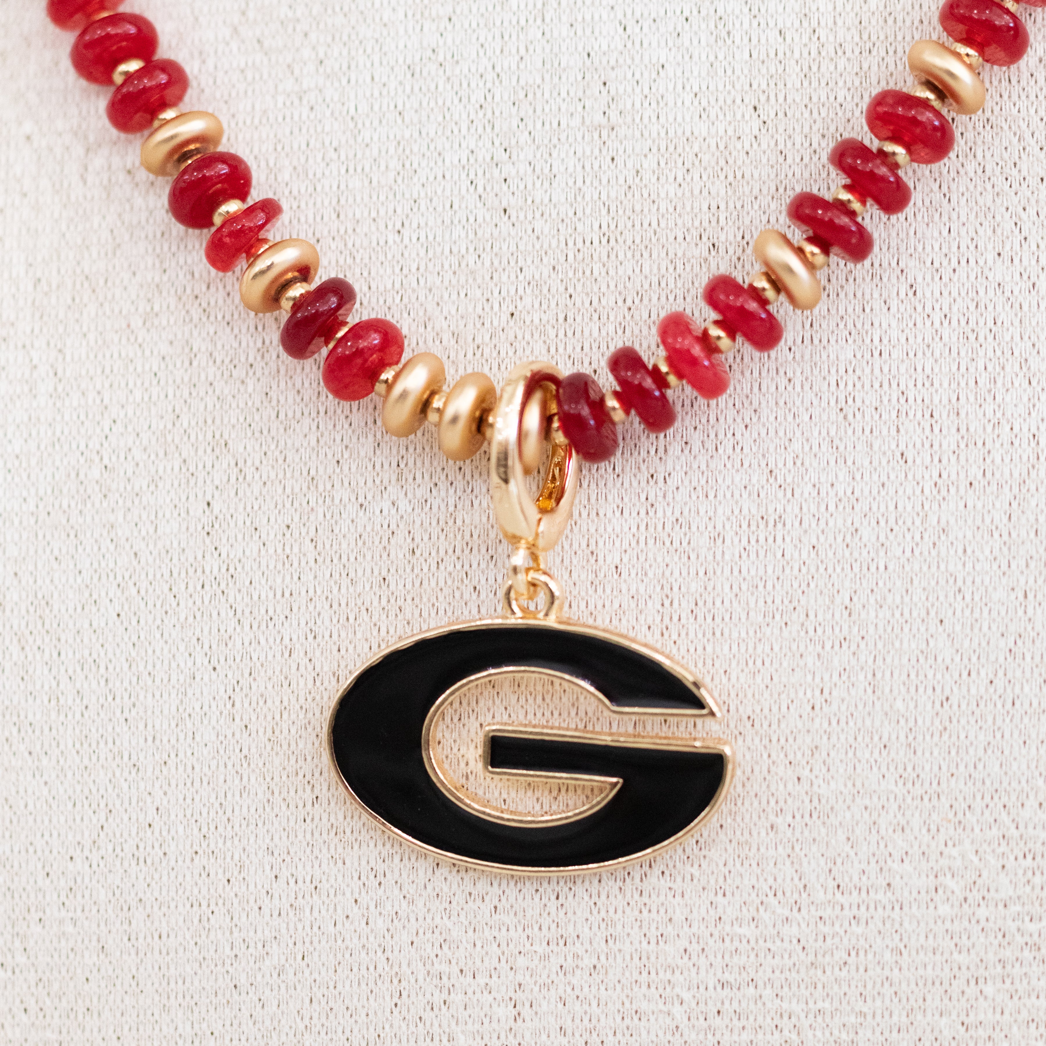 Show your Bulldog pride in style with this bold red beaded necklace featuring a gold-plated Georgia pendant. Hand-strung with vibrant beads that catch the light, this necklace adds the perfect pop of color for game day or everyday wear. Whether you're cheering from the stands or styling it with your favorite outfit, it’s the ultimate accessory for any Georgia fan.