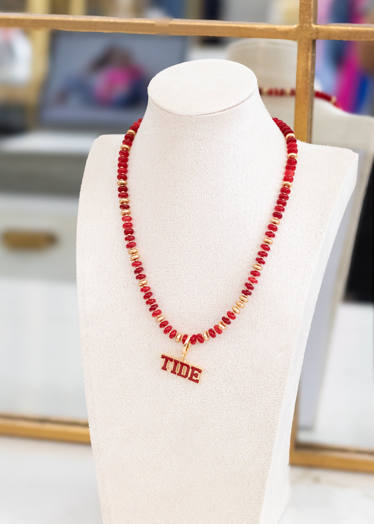 Show your Alabama pride with our red beaded necklace featuring a TIDE pendant. Designed for Crimson Tide fans, this necklace blends vibrant red beads and a polished gold charm for a spirited yet stylish look.