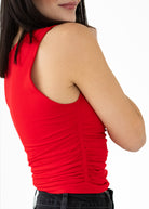 This vibrant red tank top features a playful double-layered design with charming shirred details on the side, adding a flirty twist to your casual look. Perfect for sunny days or layering up, it combines comfort and style effortlessly!