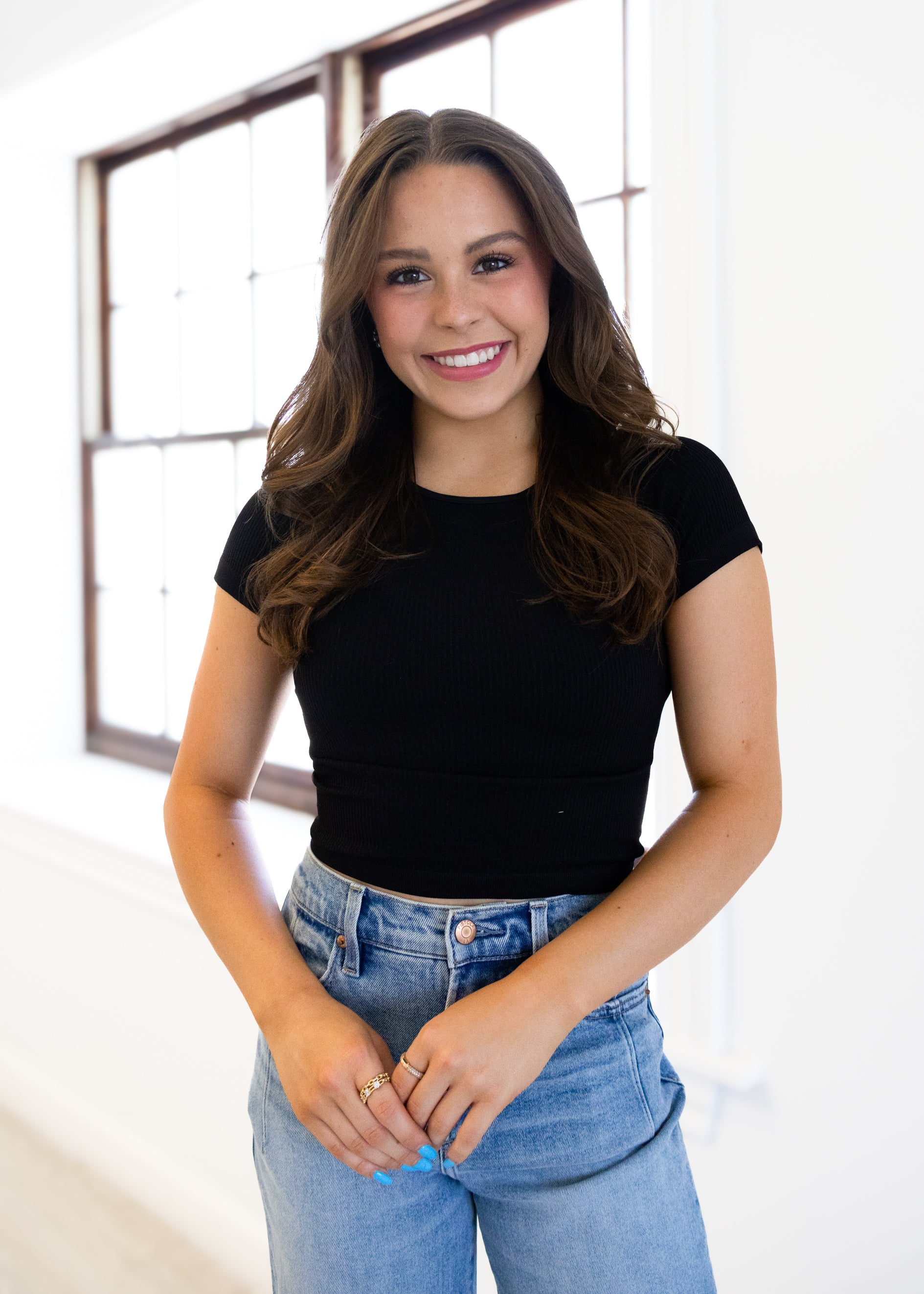 This black ribbed baby tee with cute cap sleeves is designed in a comfy one-size fit. Its soft, stretchy fabric makes it perfect for playful layering or wearing on its own, adding a fun and flirty touch to any outfit!