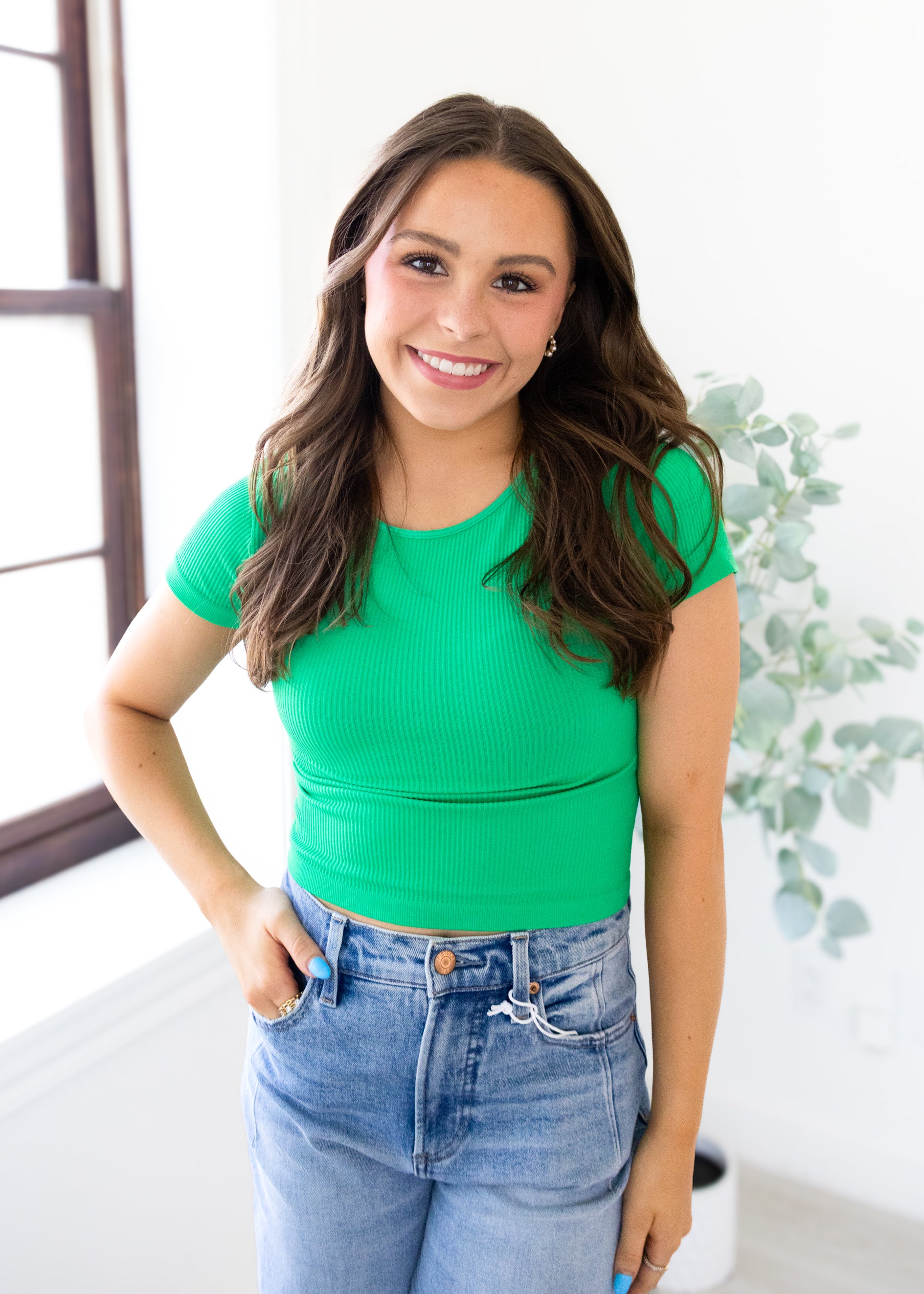 This playful ribbed baby tee in vibrant Kelly Green features trendy cropped cap sleeves, perfect for adding a fun pop of color to your casual wardrobe. Its soft, stretchy fabric hugs comfortably while keeping your look fresh and flirty all day long!