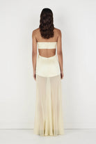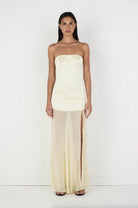 The Hansen & Gretel Cara Dress is a timeless, elevated silhouette designed to make a statement with effortless sophistication. Featuring a strapless neckline and a structured, form-fitting bodice, this piece beautifully contours the body while offering a sleek and minimal aesthetic. The dress flows into a sheer, lightweight maxi skirt with a striking thigh-high slit, adding movement and a subtle hint of allure. Crafted in a soft, buttery cream hue, it’s perfect for bridal events, special occasions, or any moment that calls for a refined yet modern look. Style it with delicate heels and minimal jewelry for an effortlessly chic finish.