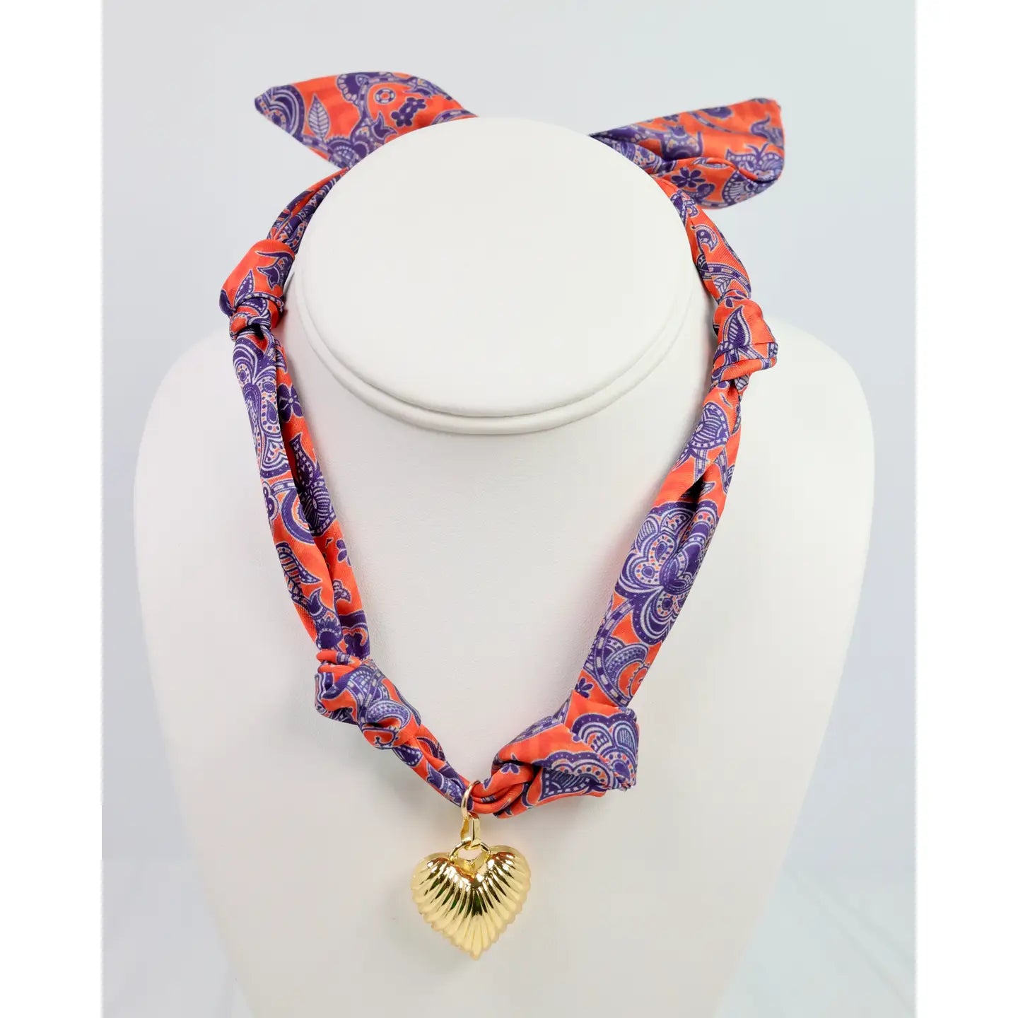 Elevate your look with the Dahlia Scarf Charm Necklace featuring a fun Blue and Orange print. This satin-feel scarf is accented by a ribbed puff heart charm pendant, adding a playful yet chic touch. Designed with two stylish knots and a tie-back closure, it offers adjustable comfort and a perfect fit for any outfit.