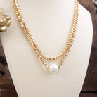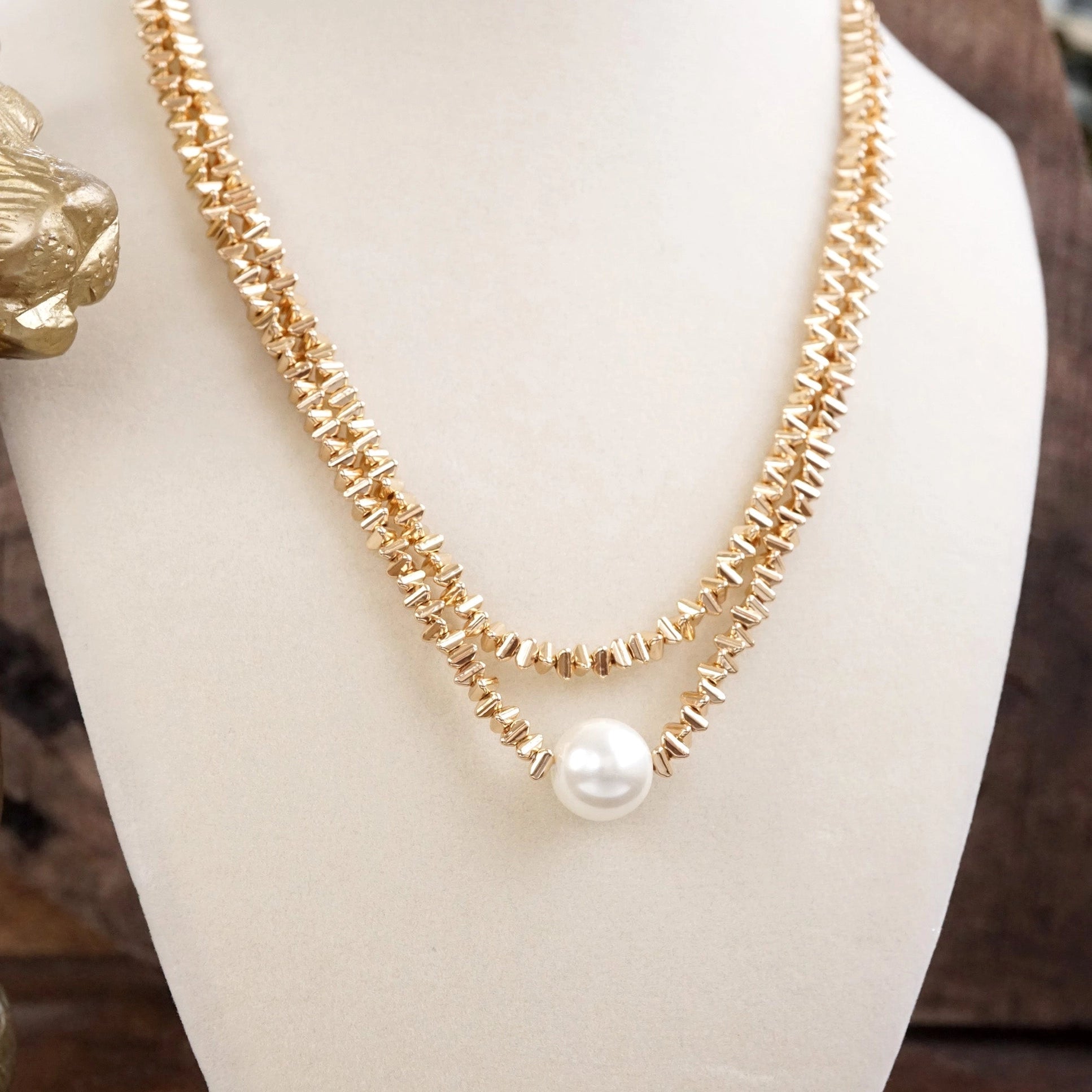 A timeless touch of elegance, this double-layer necklace combines warm golden tones with luminous simplicity. Two delicate strands of faceted 3D triangle beads reflect light beautifully, while a single pearlized bead at the center offers a soft, classic finish.
