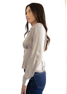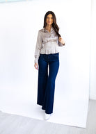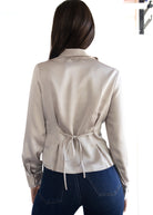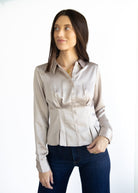 The Anastasia Blouse is a silky satin, long-sleeve blouse designed with a sharp collar, pearl button front, and pleated waistline for a figure-flattering, tailored silhouette. Subtle sheen and structured cuffs elevate this timeless style, making it the perfect blend of elegance and versatility for both day and evening wear.