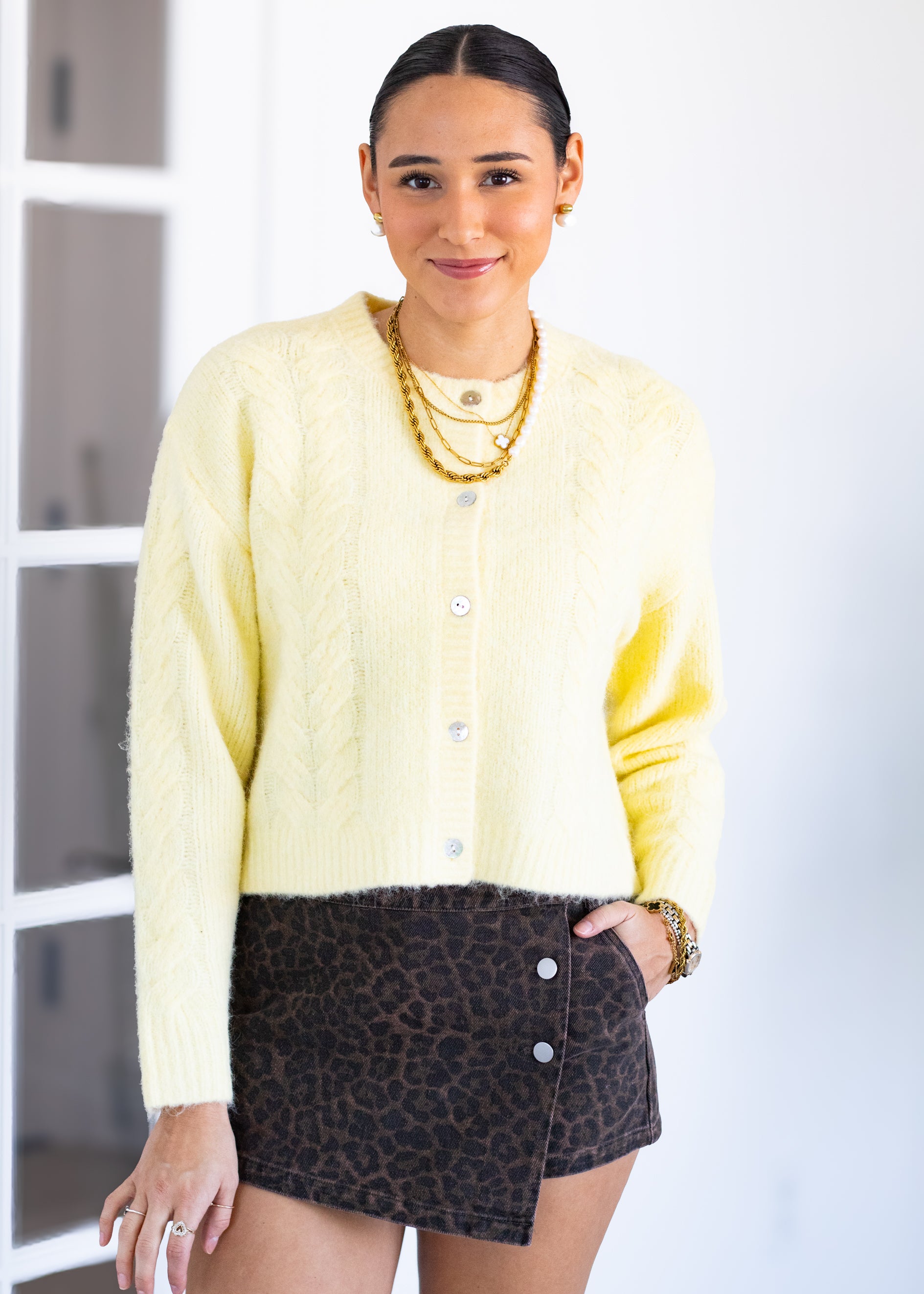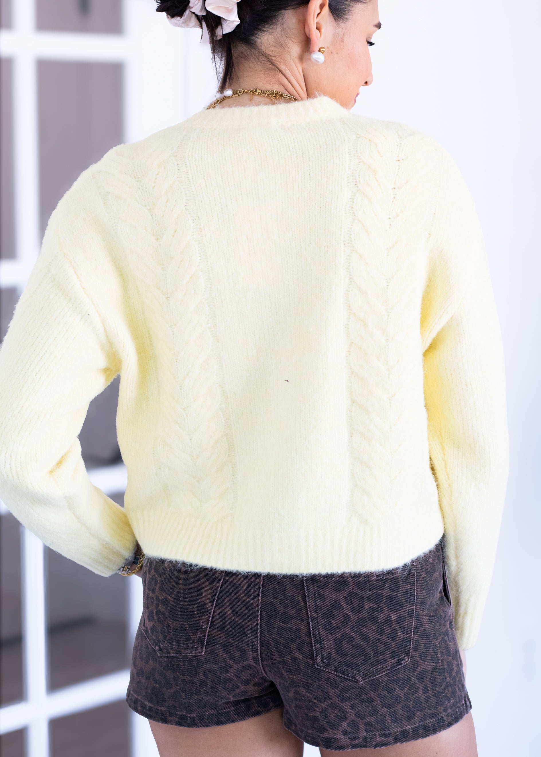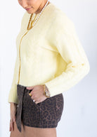 This soft yellow cardigan is the ultimate cozy-cute layering piece for every season. Designed in a fuzzy knit with a cropped, relaxed fit, this cardigan features classic button-front styling and a subtly textured knit that adds dimension and charm. The lightweight feel makes it perfect for wearing solo as a top or layered over tanks and tees. Finished in a dreamy pastel yellow, it pairs effortlessly with denim, trousers, or skirts for an easy everyday look.