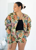 These floral tapestry shorts are the perfect match to the Cambria Top and Cambria Jacket, designed for an elevated yet effortless look. Crafted from a mid-weight, non-stretch tapestry fabric, they feature a flattering tailored fit with a zip fly, hidden hook-and-bar closure, and on-seam side pockets for everyday ease. Unlined for a lightweight feel, these shorts are ideal for warm-weather events, vacations, or styled as a chic matching set.