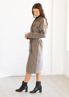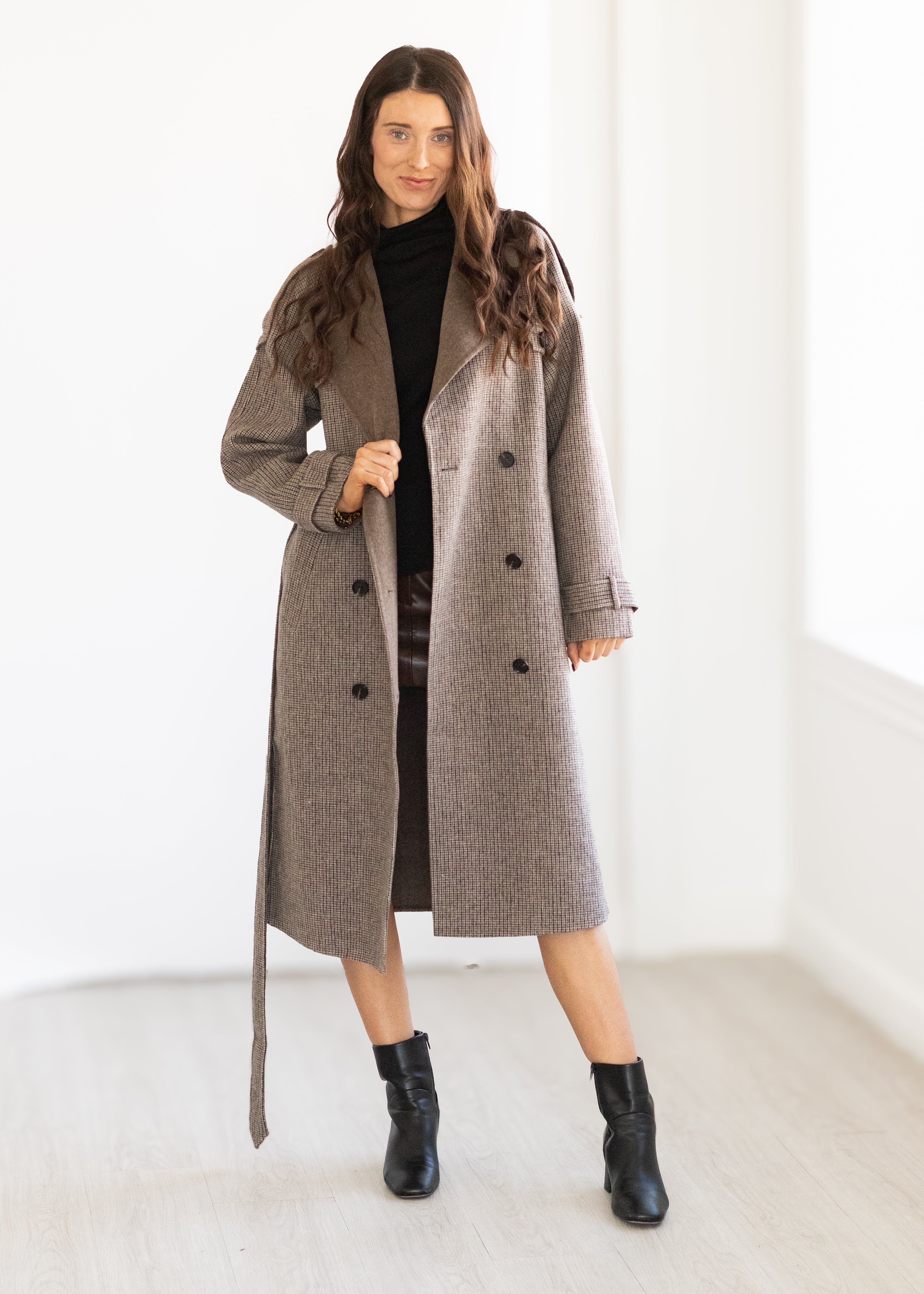 Timeless sophistication meets modern tailoring in this wool blend trench coat. Crafted from a heavyweight, non-stretch felt fabric, it features a notched collar, long sleeves, and a double-breasted silhouette with button placket. The contrast fold-over lapel and front welt pocket add elevated detail, while the self-tie belt cinches the waist for a flattering fit. A statement outerwear piece that brings warmth and polish to every fall and winter look.