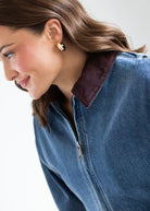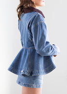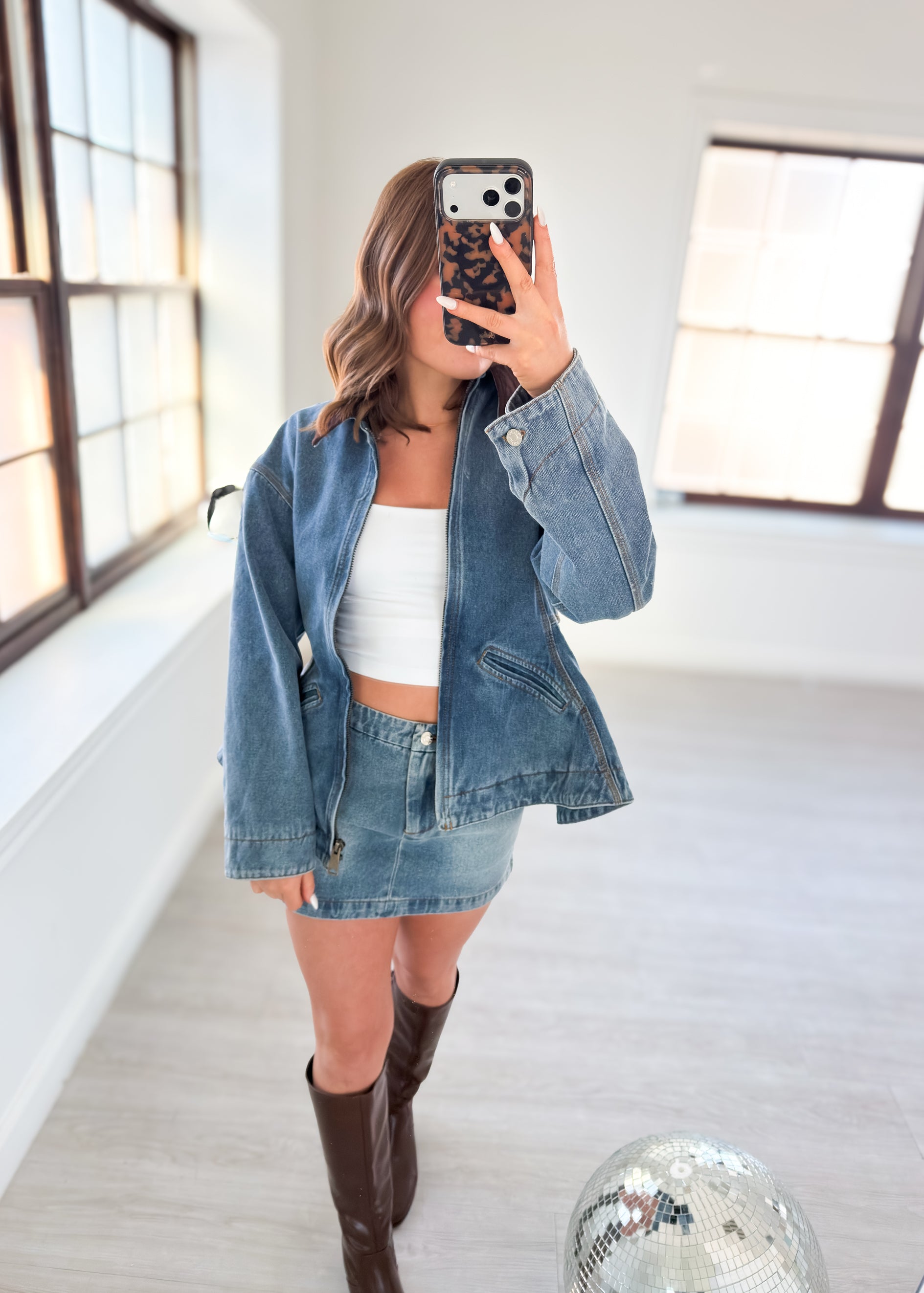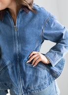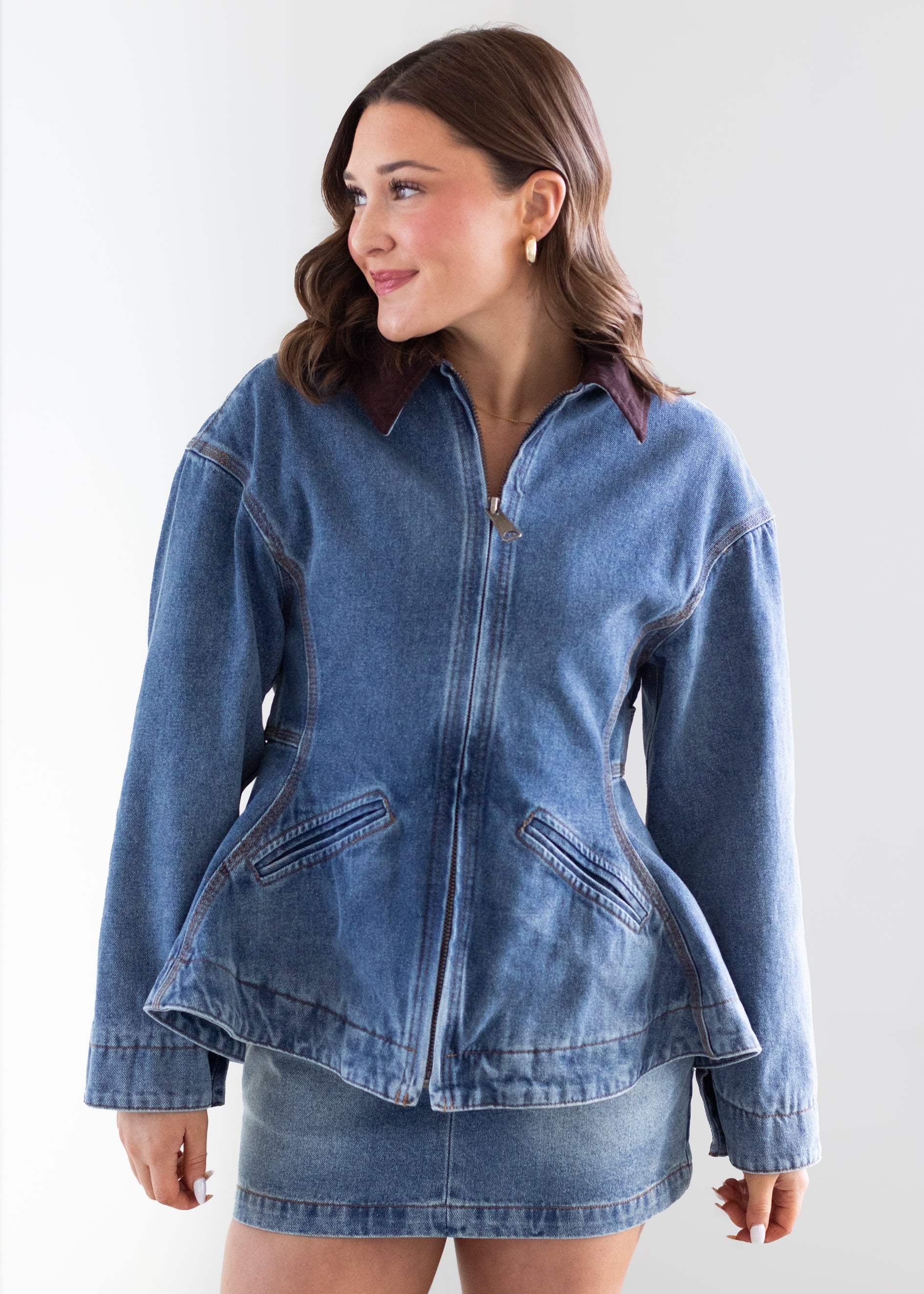 This denim jacket is a cool, elevated layer designed to pair perfectly with the Line + Dot Mottle Mini Skirt. Featuring a structured yet relaxed fit, it’s crafted from mid-weight denim and finished with a zip-front closure and contrast collar for a modern touch. Easy to style as a matching set or worn on its own, this jacket adds effortless polish to everyday looks.