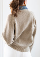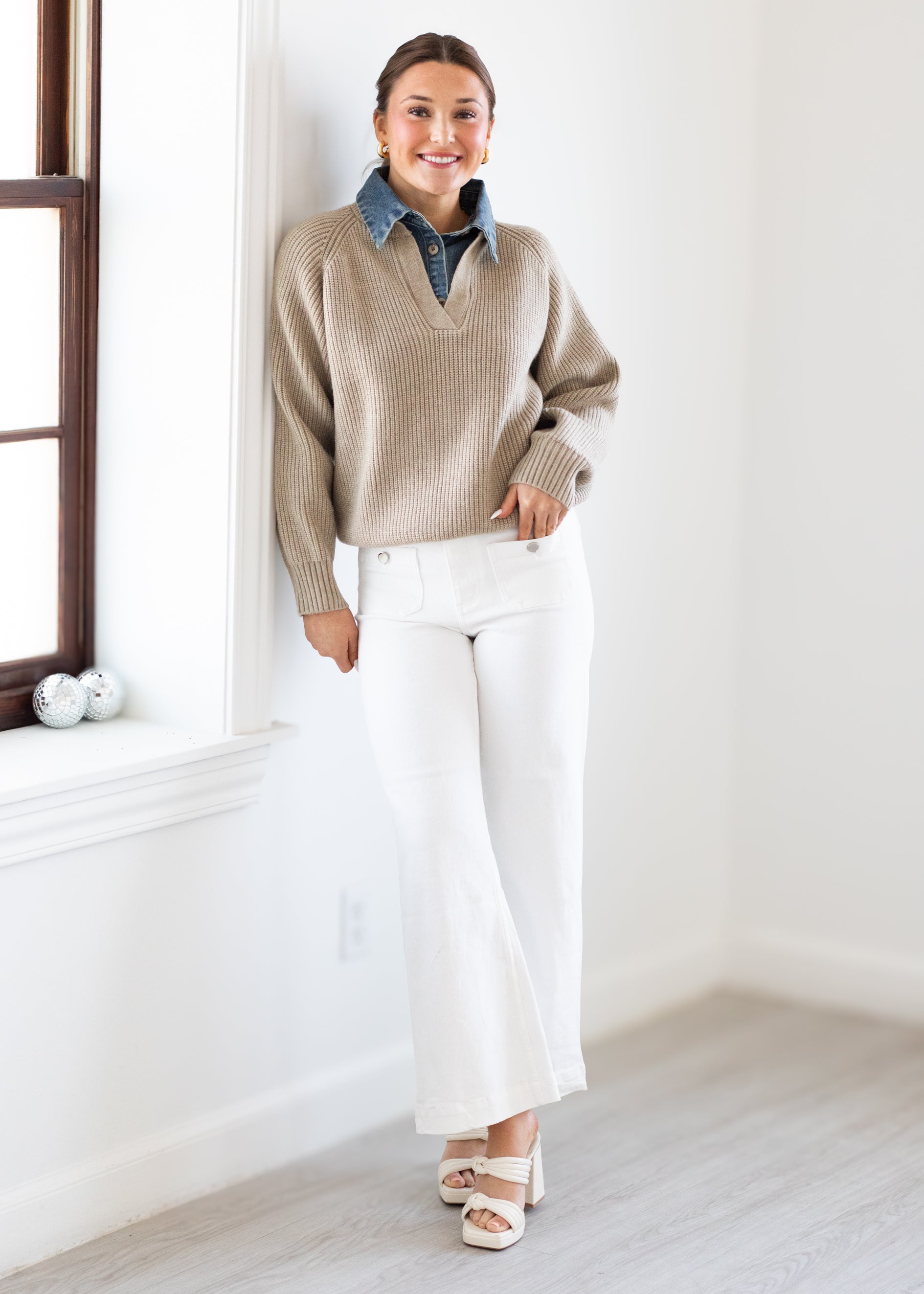 This ribbed knit sweater delivers a perfectly layered look with an attached denim collar for effortless styling. Designed with a flattering V-neckline and classic button placket detail, the denim collar creates the illusion of a layered shirt without the bulk. Crafted from a cozy yet lightweight ribbed knit, this sweater is polished enough for everyday wear and easy to dress up or down with your favorite denim or trousers.
