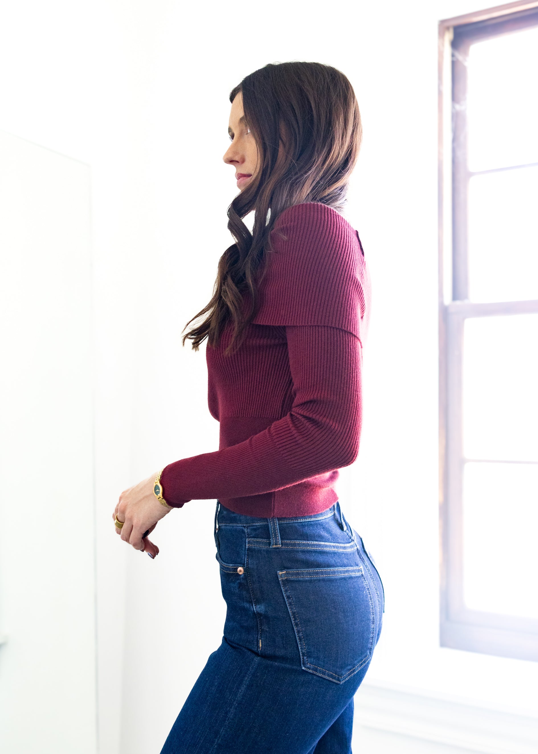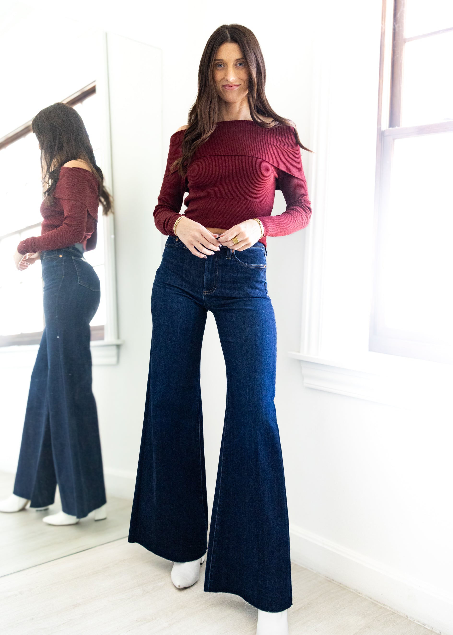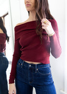 The Wine Down Sweater is a rich burgundy off-the-shoulder knit designed to bring cozy comfort and effortless allure to your wardrobe. Featuring a slouchy neckline, soft ribbed detailing, and a relaxed fit, this versatile women’s sweater is perfect for fall and winter layering. Pair it with jeans for a casual weekend outfit, or elevate your look by styling it with leather pants and heels for a chic night out. A must-have knitwear staple for anyone looking to blend comfort and style.