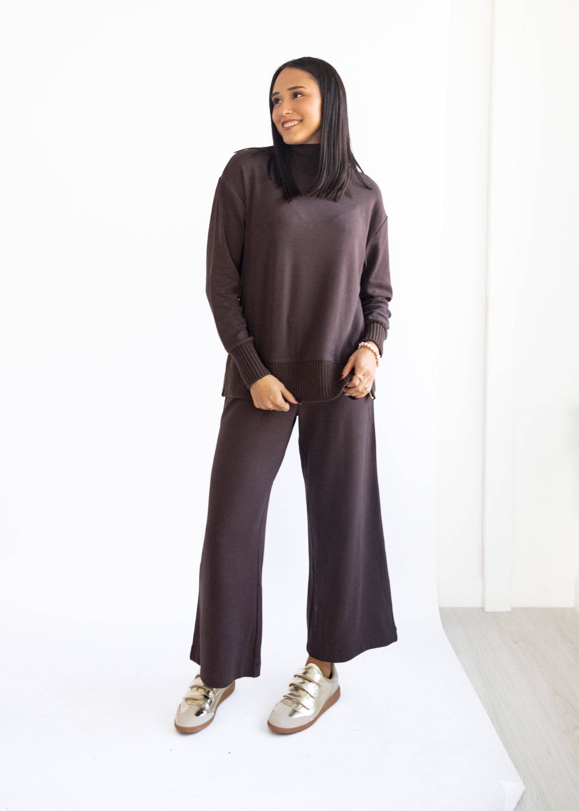 Effortless style meets ultimate comfort with our Z supply Scout Set - Chocolate Cherry. This two-piece matching set features a relaxed-fit top with ribbed detailing at the mock neck, cuffs, and hem for a refined touch. Gold zipper accents at the side add a modern edge, making it easy to customize your fit and style. The wide-leg pants drape beautifully, offering a flattering yet laid-back silhouette perfect for lounging at home or stepping out in casual elegance. Pair it with sneakers for an easy daytime look or elevate with boots and accessories for a chic street-style vibe.