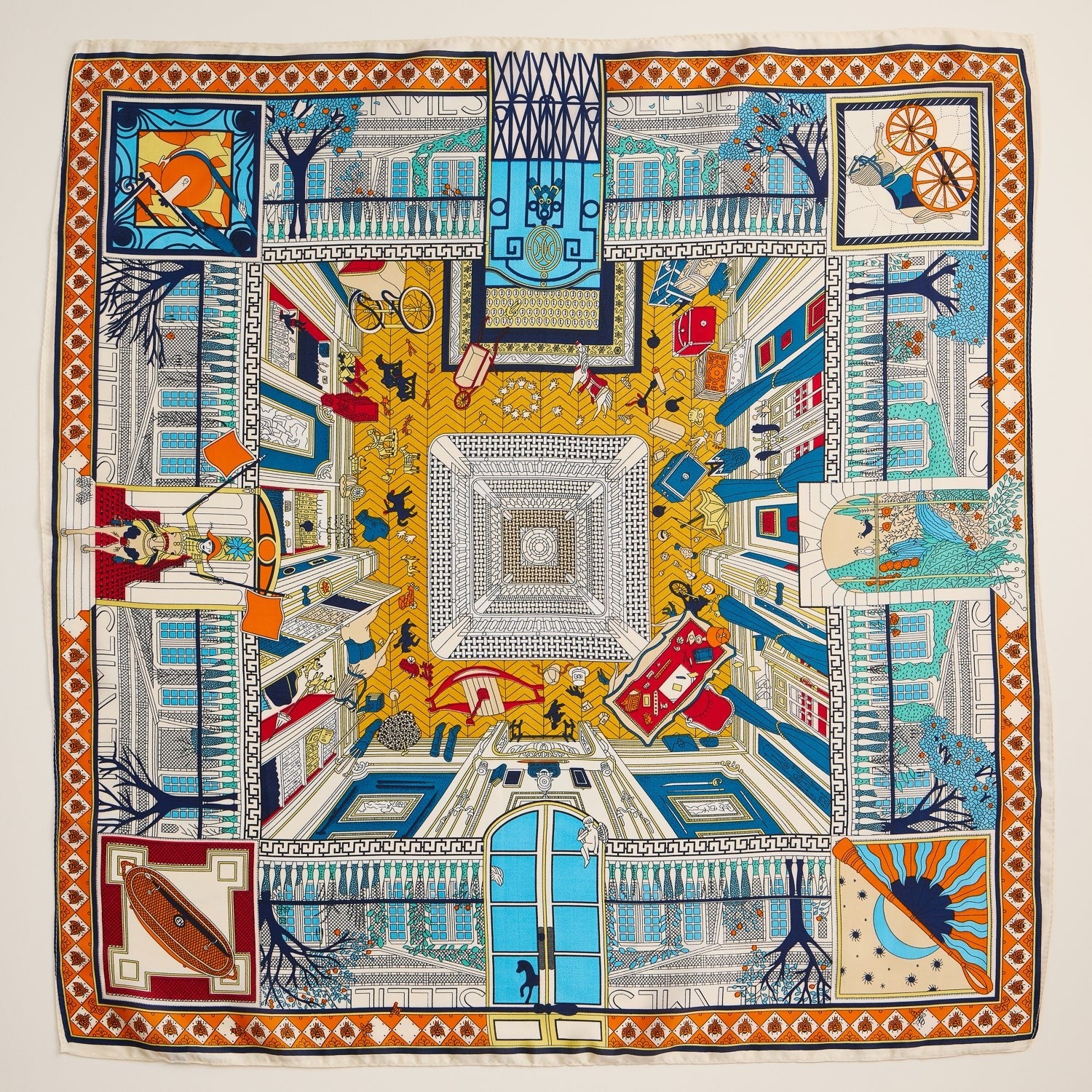 Step into a world of elegance and imagination with this intricately illustrated silk scarf. Featuring a whimsical architectural motif inspired by grand Parisian courtyards, it combines shades of rich gold, cobalt blue, and warm orange to create a mesmerizing visual story. Each corner reveals charming vignettes—from bicycles and books to playful pets and ornate balconies—making this piece a wearable work of art.