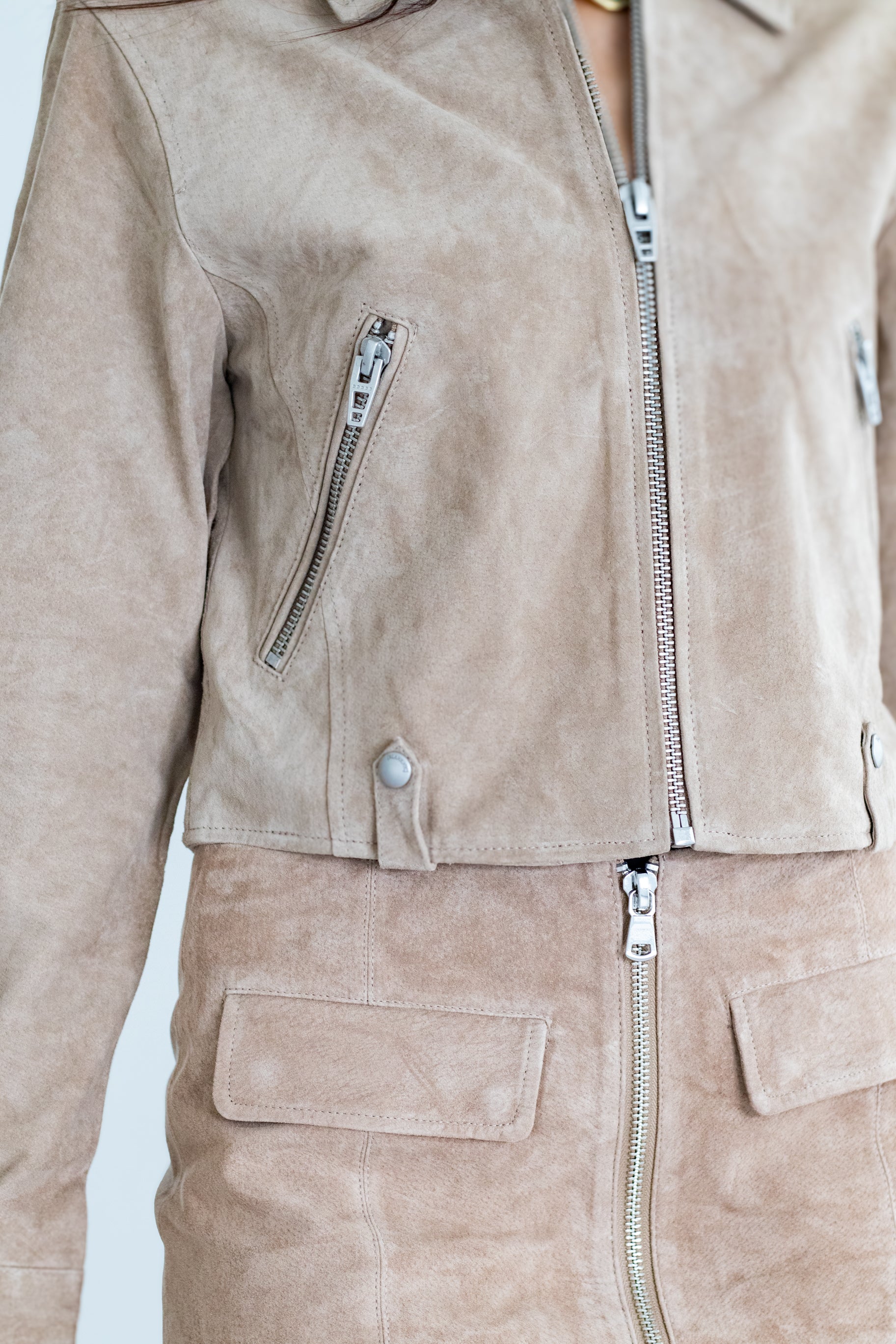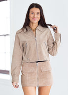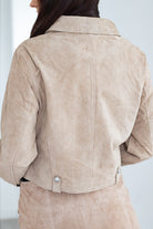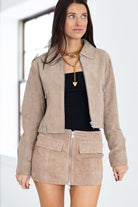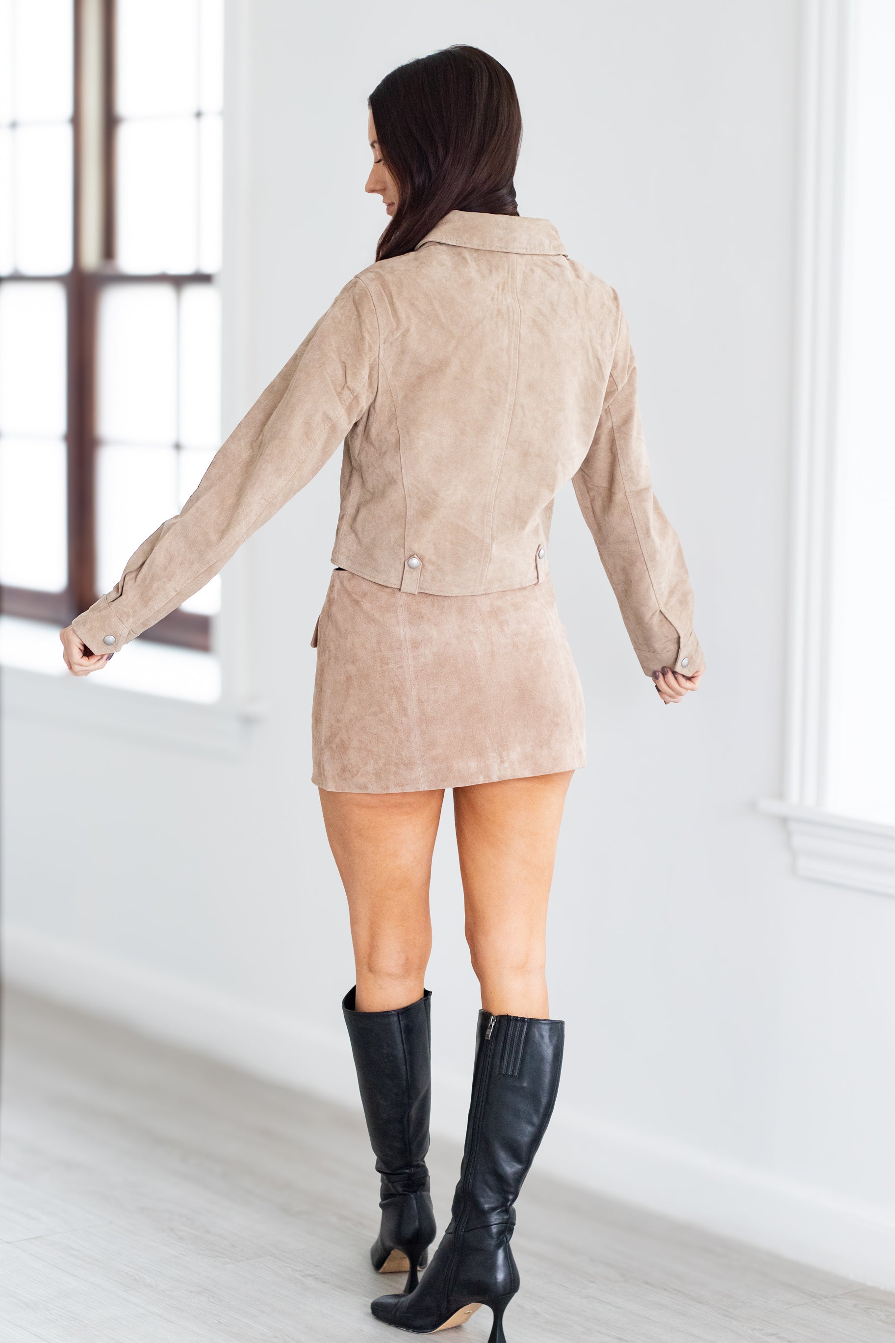 Meet the Latte Frappe Jacket—your new neutral staple with a luxe twist. Crafted from soft tan faux suede, this jacket blends cozy texture with a tailored, modern silhouette. Silver hardware on the buttons and zippers adds a cool, polished contrast, giving the piece an elevated edge that’s perfect for dressing up or down.