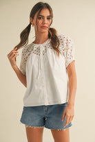 This playful Lace Trim Eyelet Top features charming puff sleeves and delicate eyelet detailing for a fresh, airy look. Its babydoll silhouette adds a flirty, feminine touch, making it perfect for sunny days and casual outings. The crisp white fabric keeps it light and versatile, effortlessly pairing with your favorite jeans or skirts. Embrace a fun, breezy style with this standout piece!