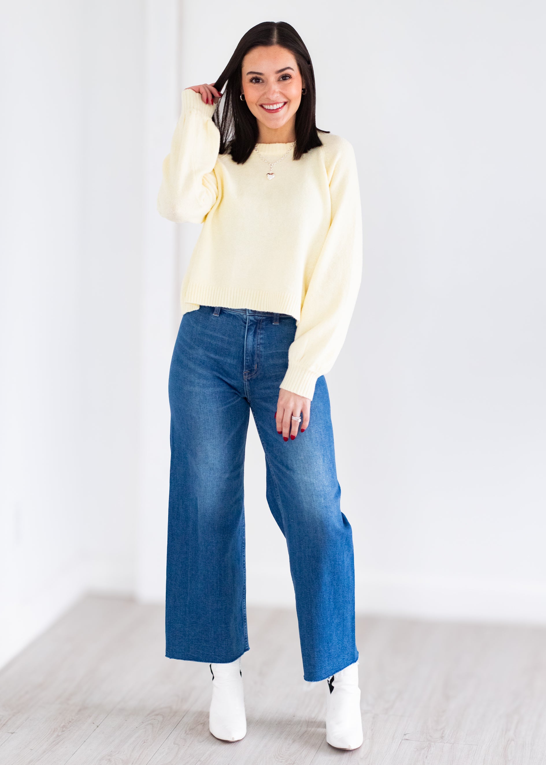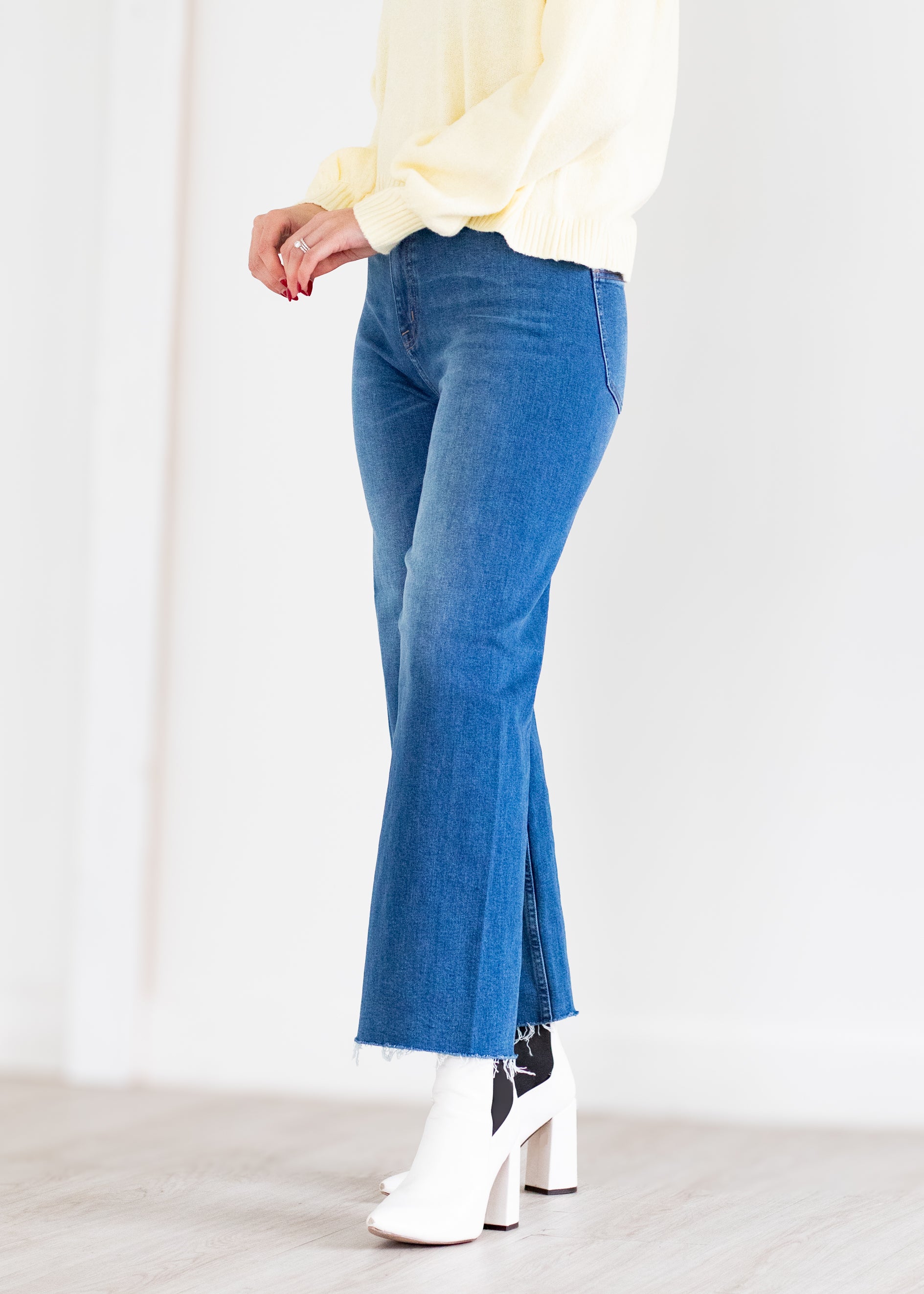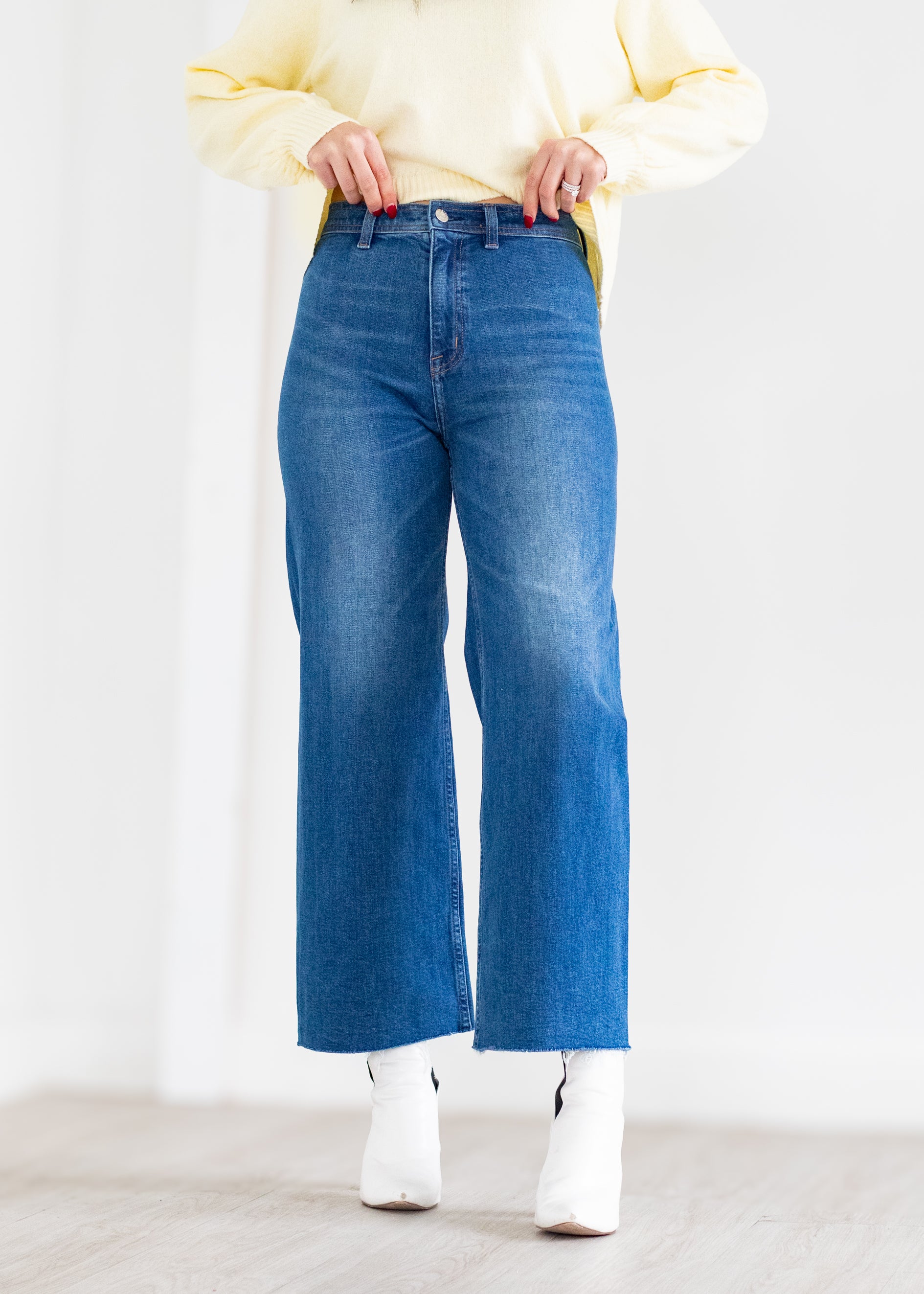 A signature silhouette with timeless appeal, Penny sits high at the waist with an ultra-wide leg and full-length 28" inseam that creates effortless balance and movement. The relaxed shape flows with ease, while the structured rise keeps proportions clean and refined. Crafted from comfort stretch fabric in Rooftop, a medium blue wash with soft fading for an easy, lived-in feel.