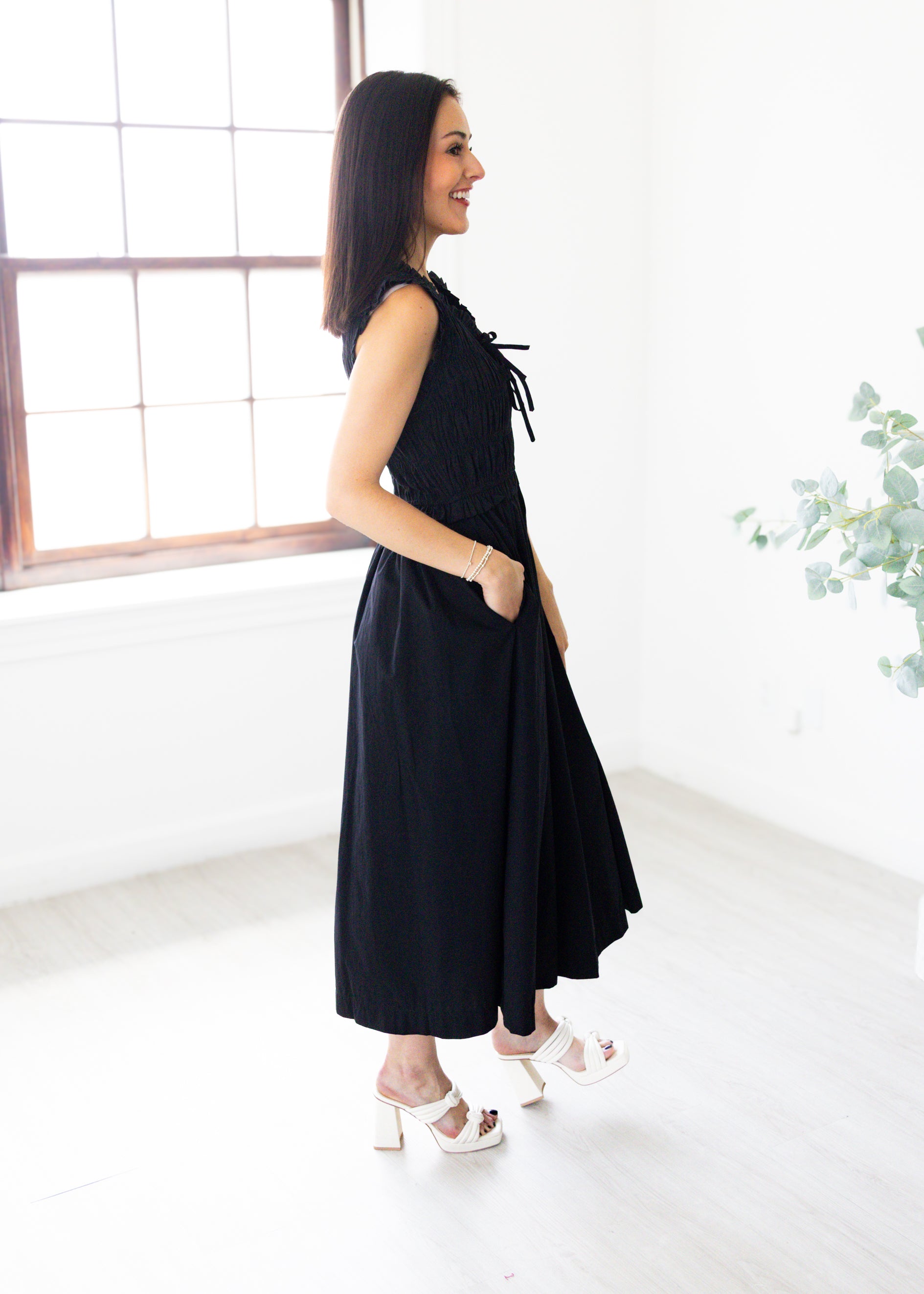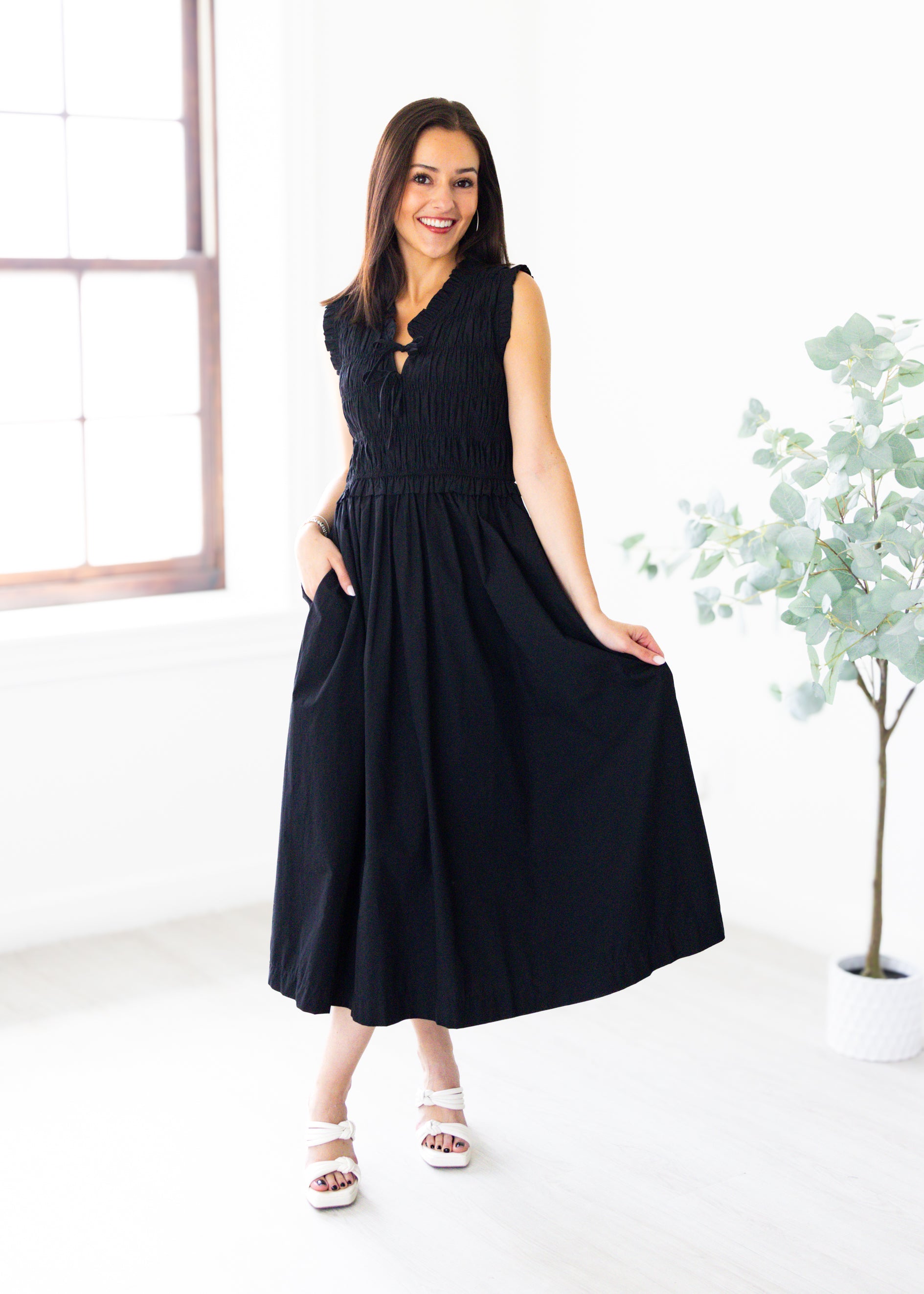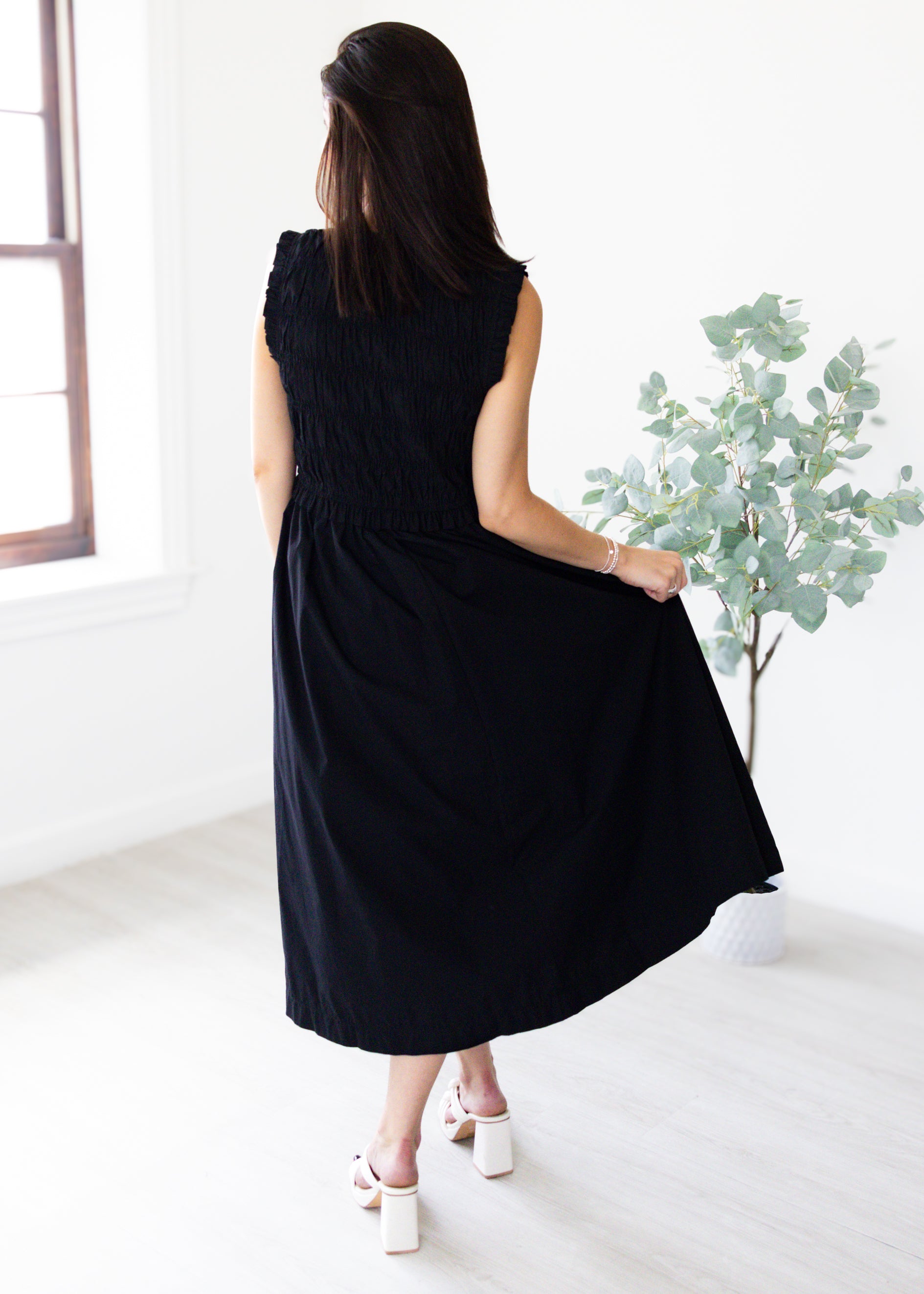 Step into effortless charm with the Sophia Smocked Midi Dress. Its playful smocked bodice and flowing midi skirt create a flattering silhouette that moves with you. Perfect for sunny days or casual nights out, this black dress adds a touch of fun sophistication to your wardrobe.
