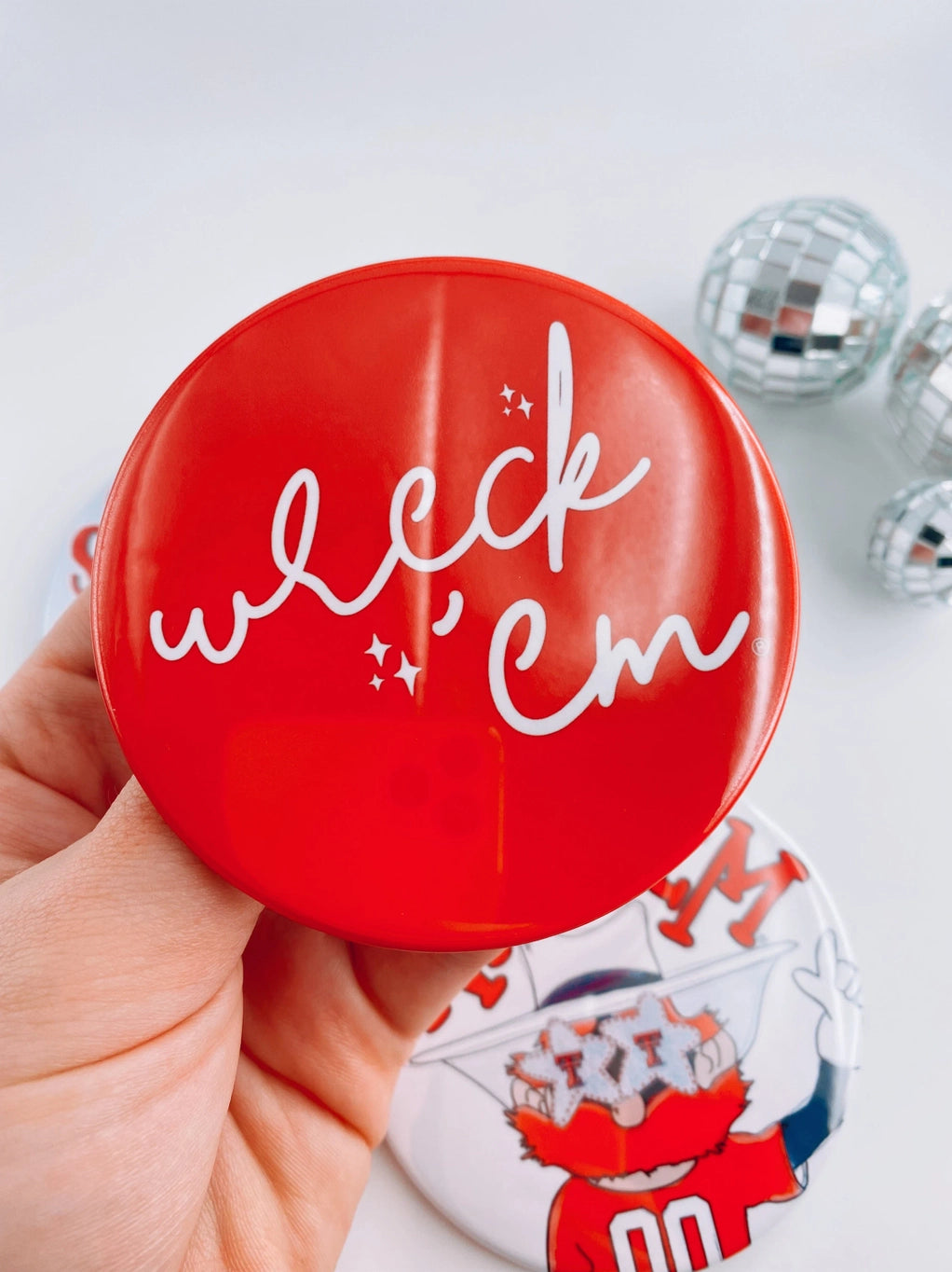 Cheer on Texas Tech with the Wreck Em Game Day Button! Featuring a crisp white background, bold red letters, and a star detail, this playful button is the perfect way to show your team spirit. Lightweight and easy to wear, it’s a fun accessory for every Red Raider ready to rally in style.