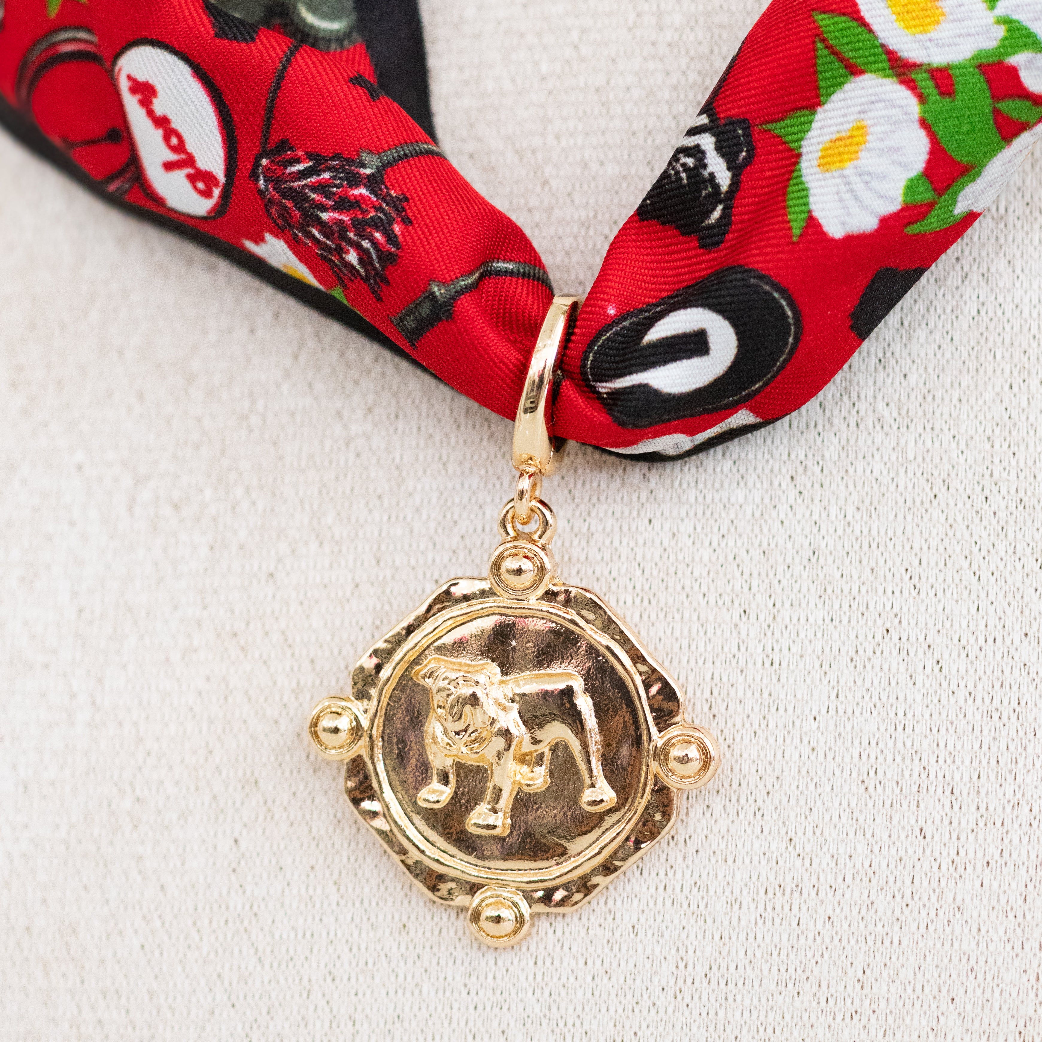 Bring a touch of team spirit and sophistication to your look with our Gold Bulldog Coin Pendant. Featuring a detailed bulldog emblem embossed on a shiny gold coin, this pendant adds timeless charm to any necklace, scarf, or accessory chain. Perfect for Georgia fans who love a little luxe with their game day style.