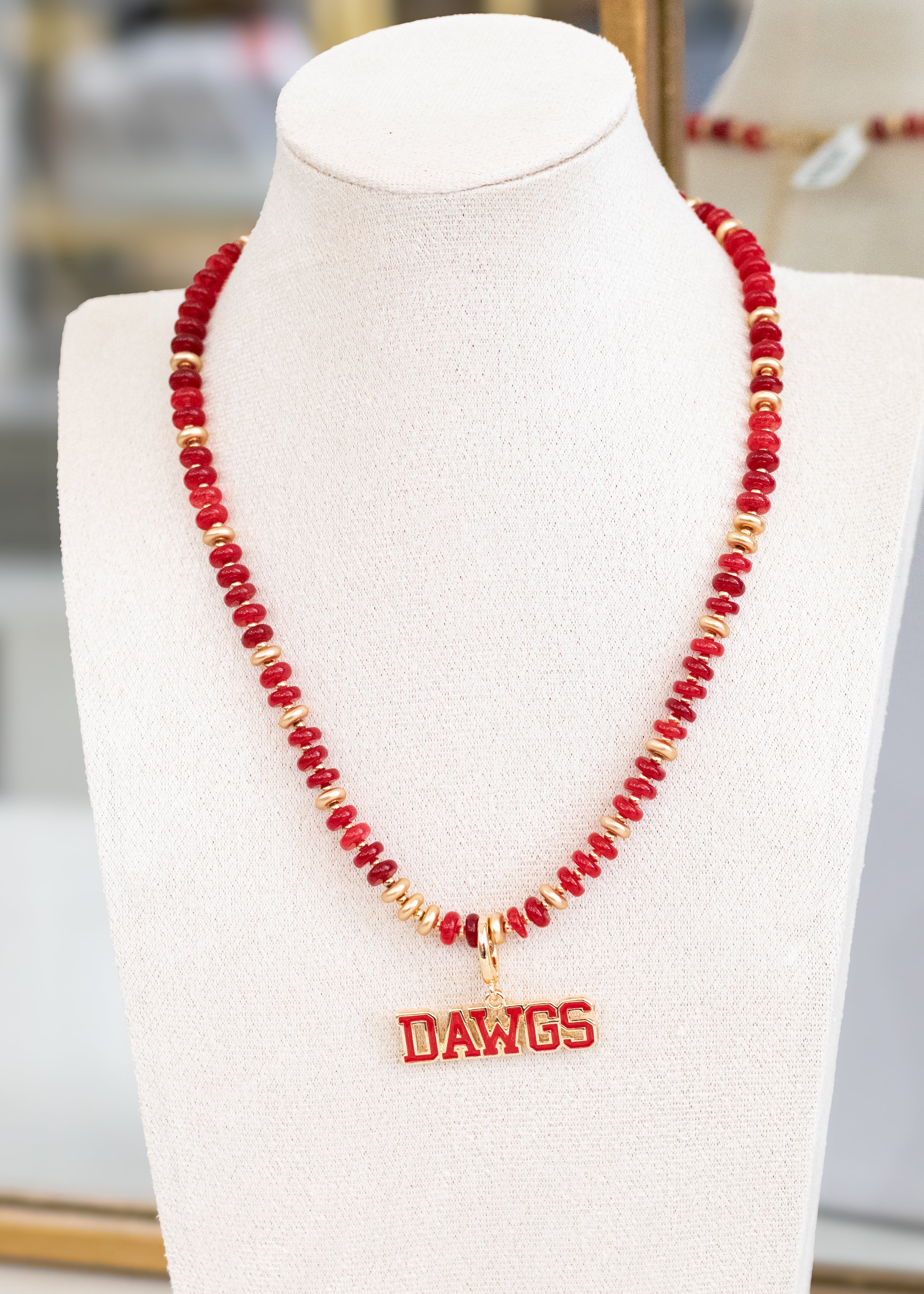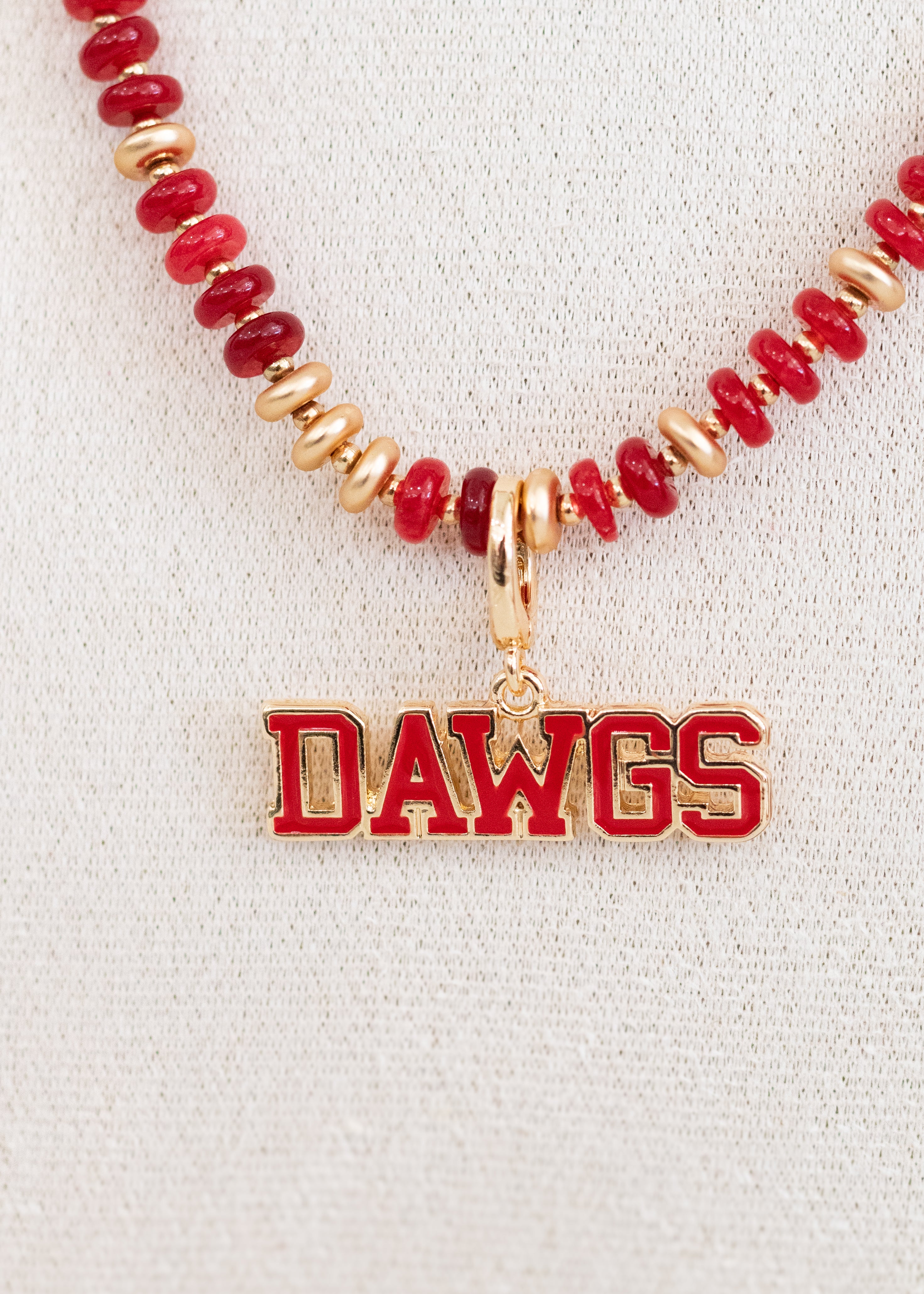 Show your Georgia pride with our DAWGS red enamel pendant — the ultimate game day accessory. With its bold red shine and gold-plated trim, this pendant adds a spirited pop to any necklace, scarf, or even your favorite pair of sneakers. Perfect for cheering on your team in style.