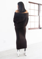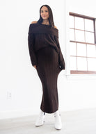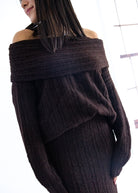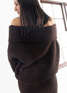 Wrap yourself in cozy elegance with our Line & Dot Ophelie Sweater. Crafted in a rich chocolate brown hue, this piece features a wide fold-over neckline that gracefully drapes off the shoulders for a subtly sultry, feminine silhouette. The ultra-soft ribbed knit texture adds warmth and dimension, while the relaxed fit ensures effortless comfort. Perfect for layering or making a statement on its own, this sweater transitions seamlessly from day to night during the cooler seasons.