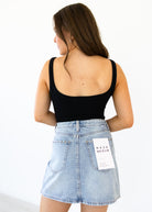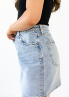 The Let's Dance Stash Mini Skirt combines a high-rise light wash denim look with metallic studs along the side seams, adding a fun twist to a timeless style. It’s the perfect mix of classic charm and trendy vibes!