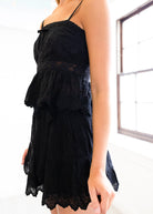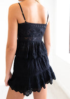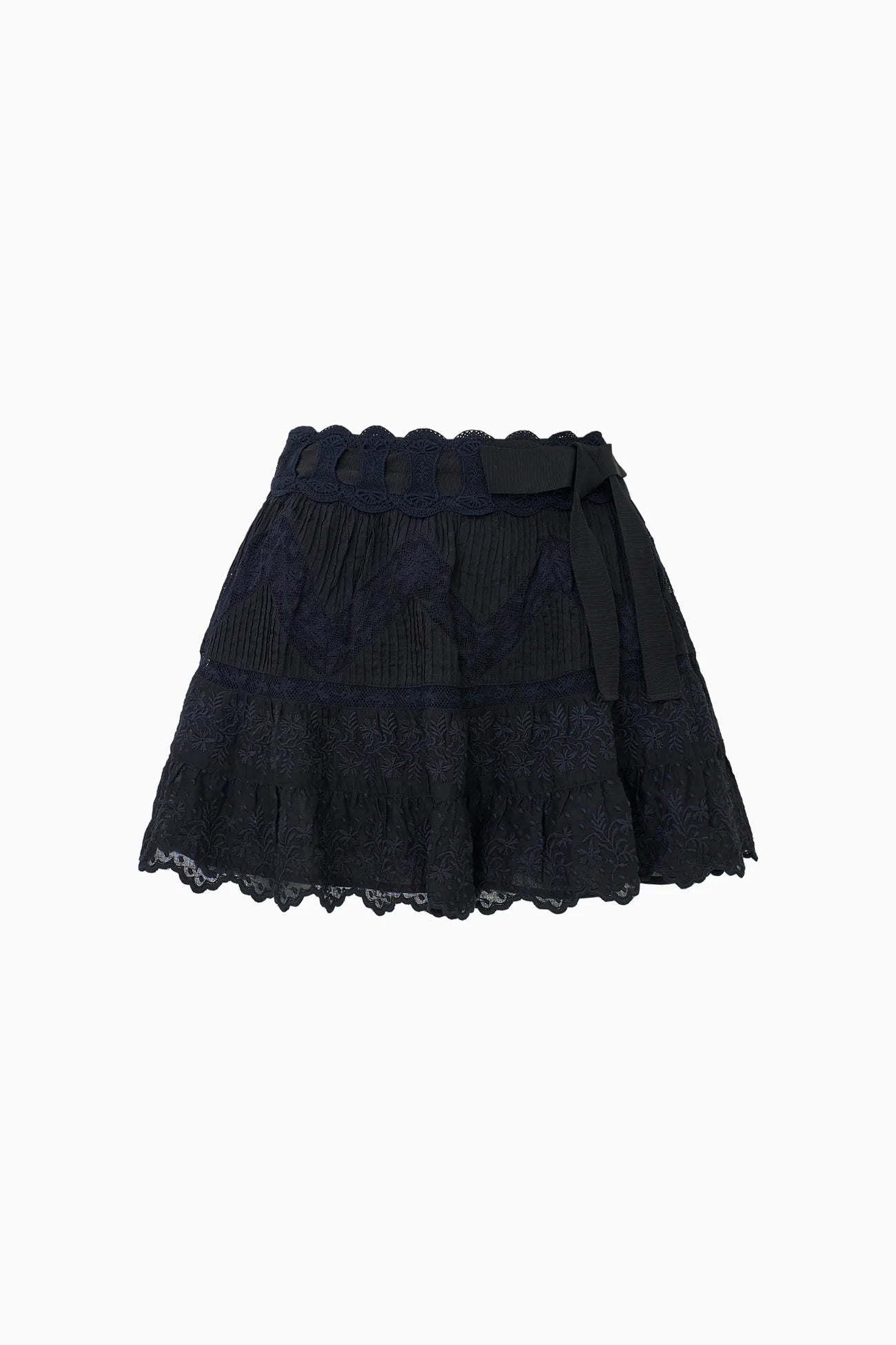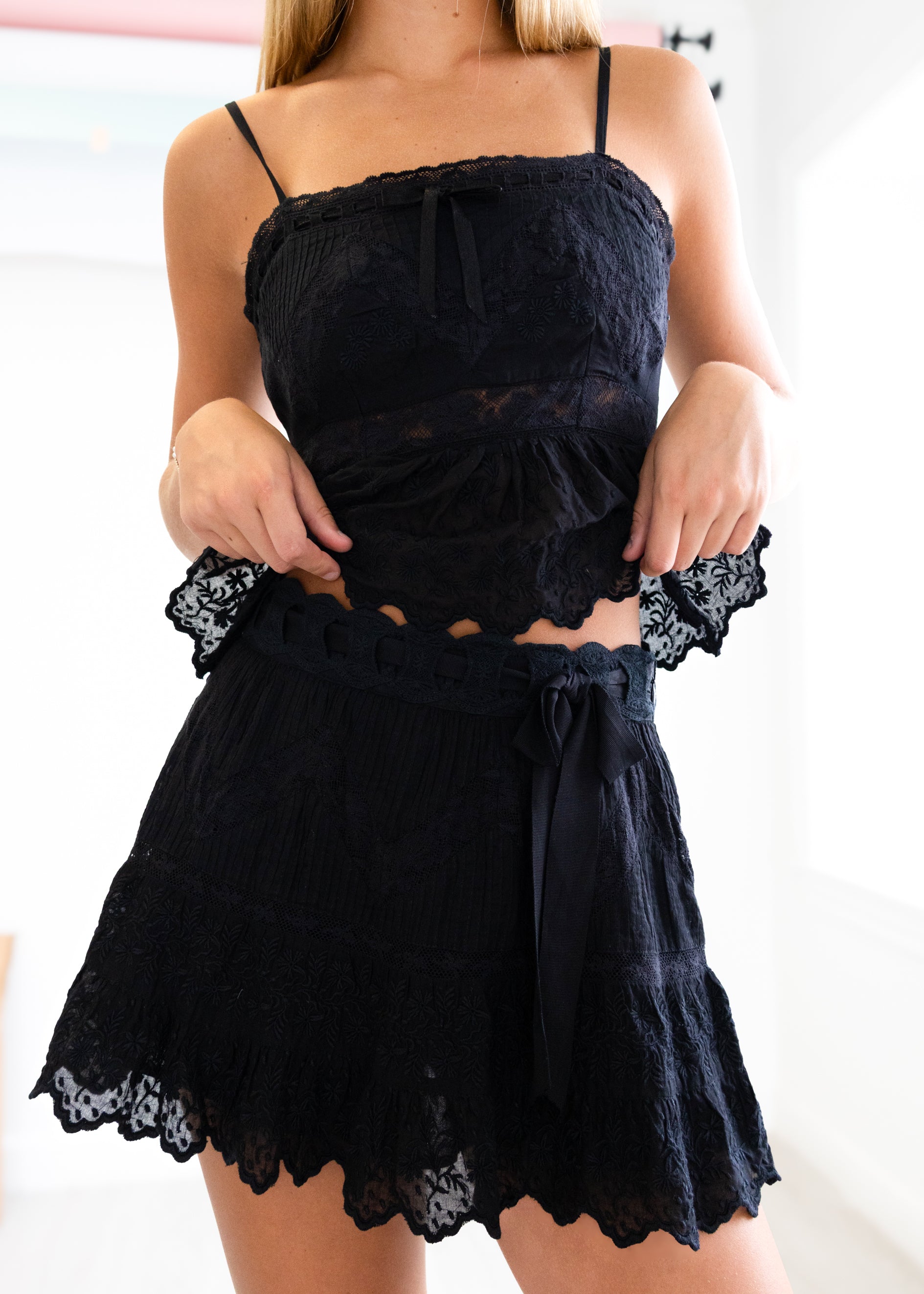 The Nerina Skirt in classic black is here! This charming mini features a stretchy, ultra-light cotton voile fabric adorned with wide vintage-style zigzag laces, tucks, scalloped embroidery, and a sweet threaded ribbon at the waist for a flirty finish. Pair with the LoveShackFancy Rowina Top for a full set!