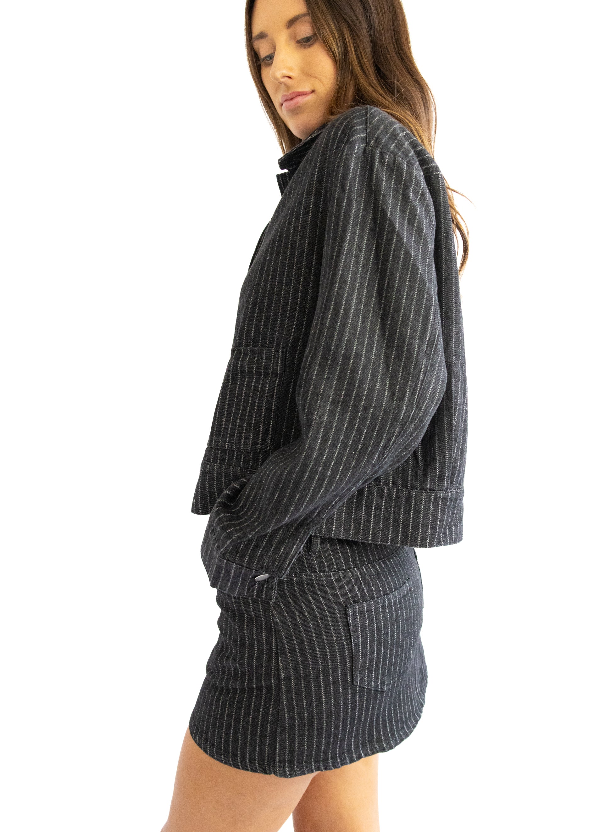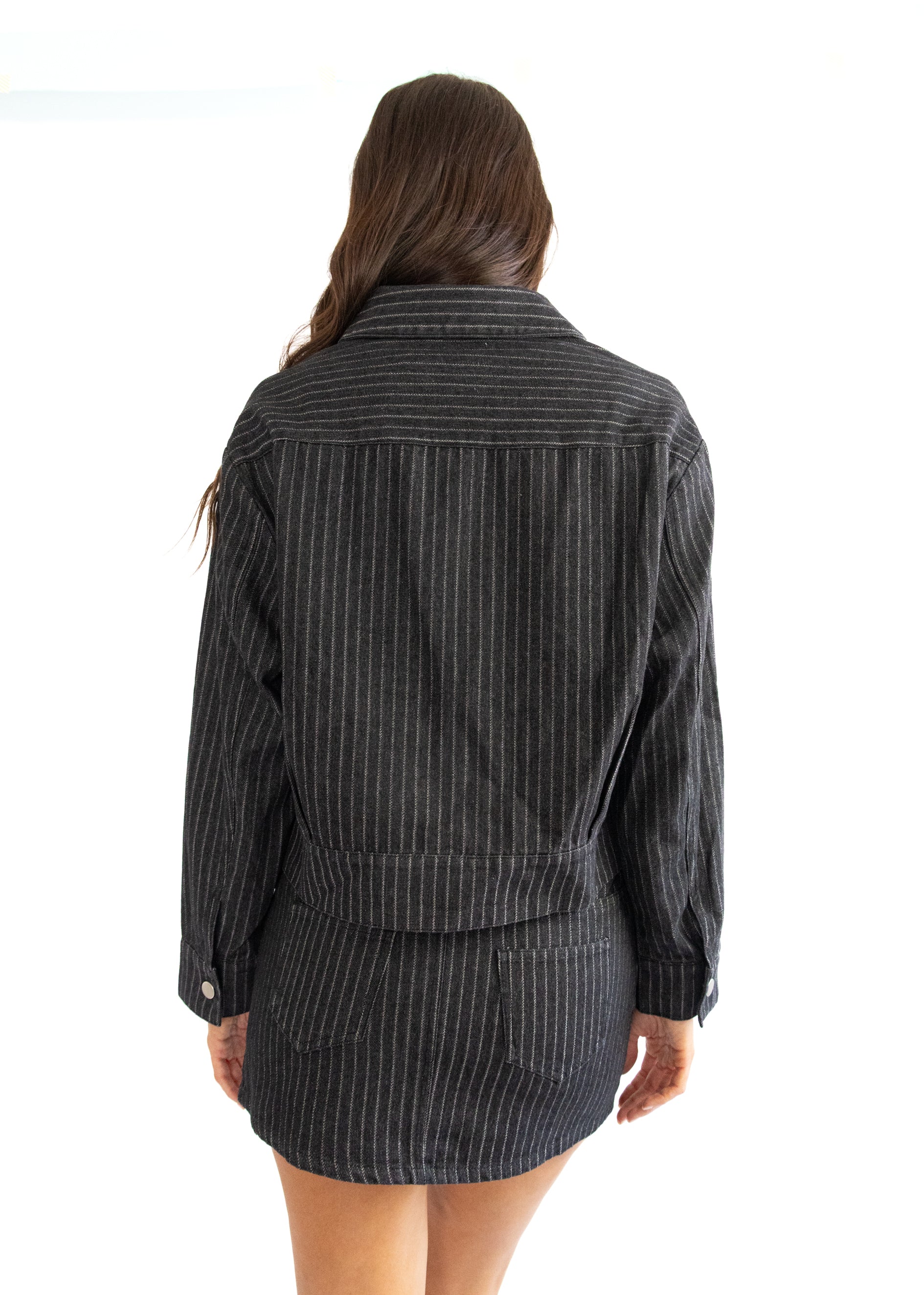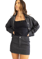 Elevate your style with the Onyx Stripe Denim Skirt, featuring bold charcoal and white stripes and a flattering mid-rise fit. Designed to complement our Onyx Stripe Denim Jacket, this skirt creates a striking coordinated look that's both trendy and versatile. Perfect for casual outings or dressed-up occasions, it offers effortless style with a confident edge.