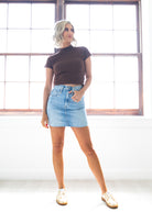 Get ready to elevate your style with the Pistola Skye High Rise Mini Skirt! Featuring the eye-catching Apollo wash and playful mini length, this skirt is embellished with silver studs for that extra edge. Perfect for any occasion, this skirt is both cute and trendy while maintaining a classic silhouette.