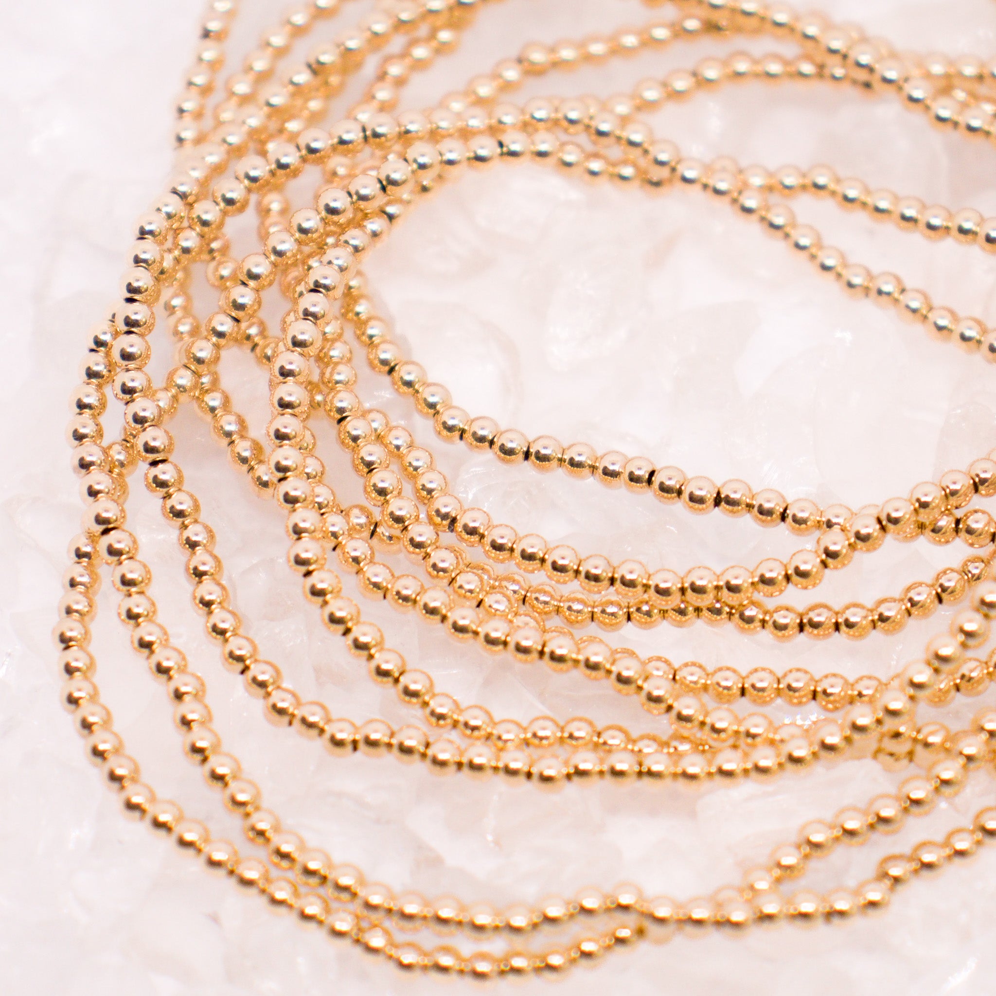 Our Stacked By MAC Bracelets are made of hollow gold filled beads, so they keep their color while at the same time are comfortable and lightweight. They are also waterproof and sweat proof, and come with a lifetime warranty.