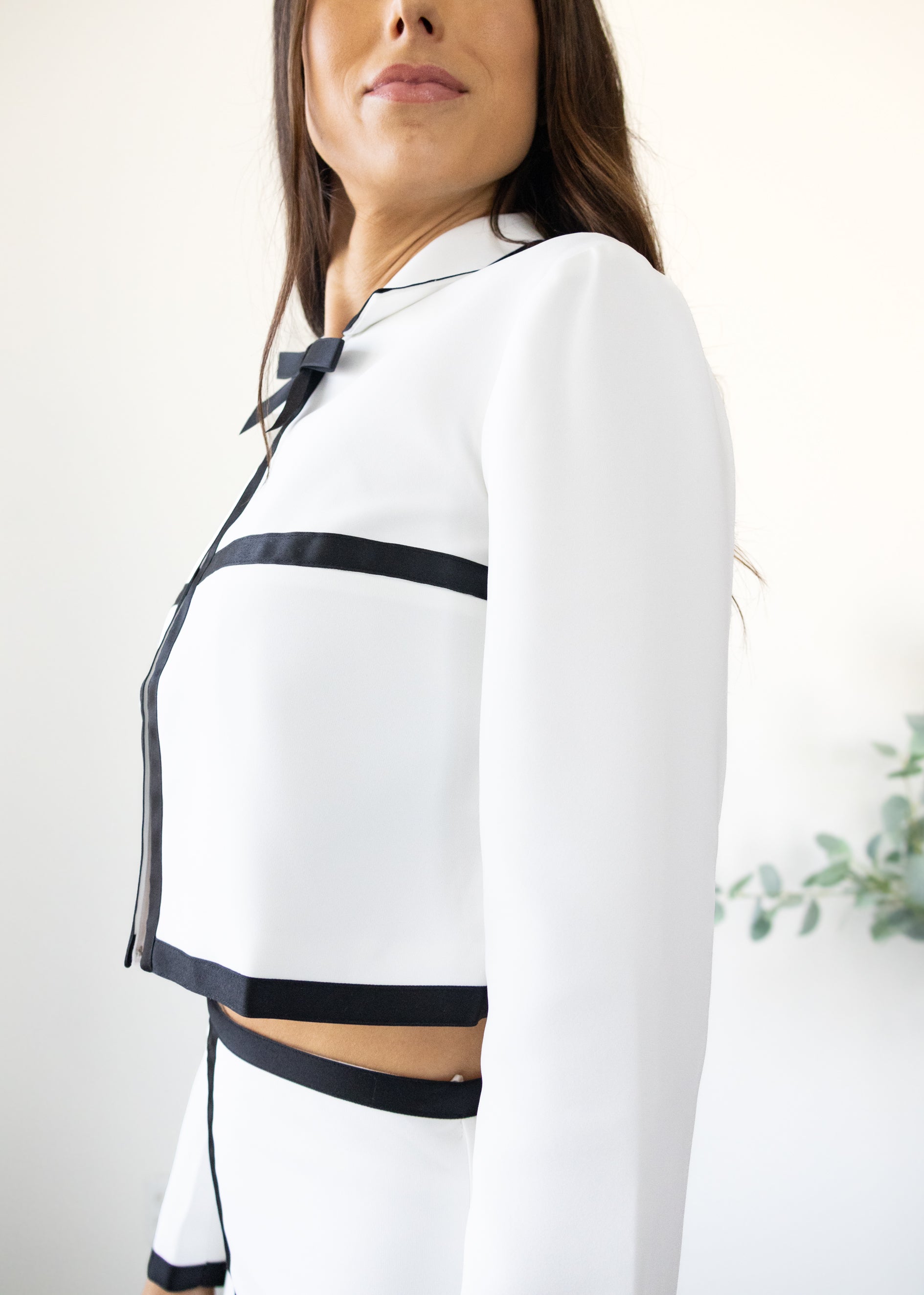 The Amanda Uprichard Trey Jacket redefines modern femininity with timeless elegance. Crafted from luxurious midweight crepe, this cropped jacket features a chic boxy silhouette and a statement bow detail at the front. The crisp white fabric, outlined with contrasting black trim, adds a sophisticated edge that’s both classic and contemporary. Pair it with the matching Trey Skort — sold separately — for a coordinated look that exudes polished perfection.