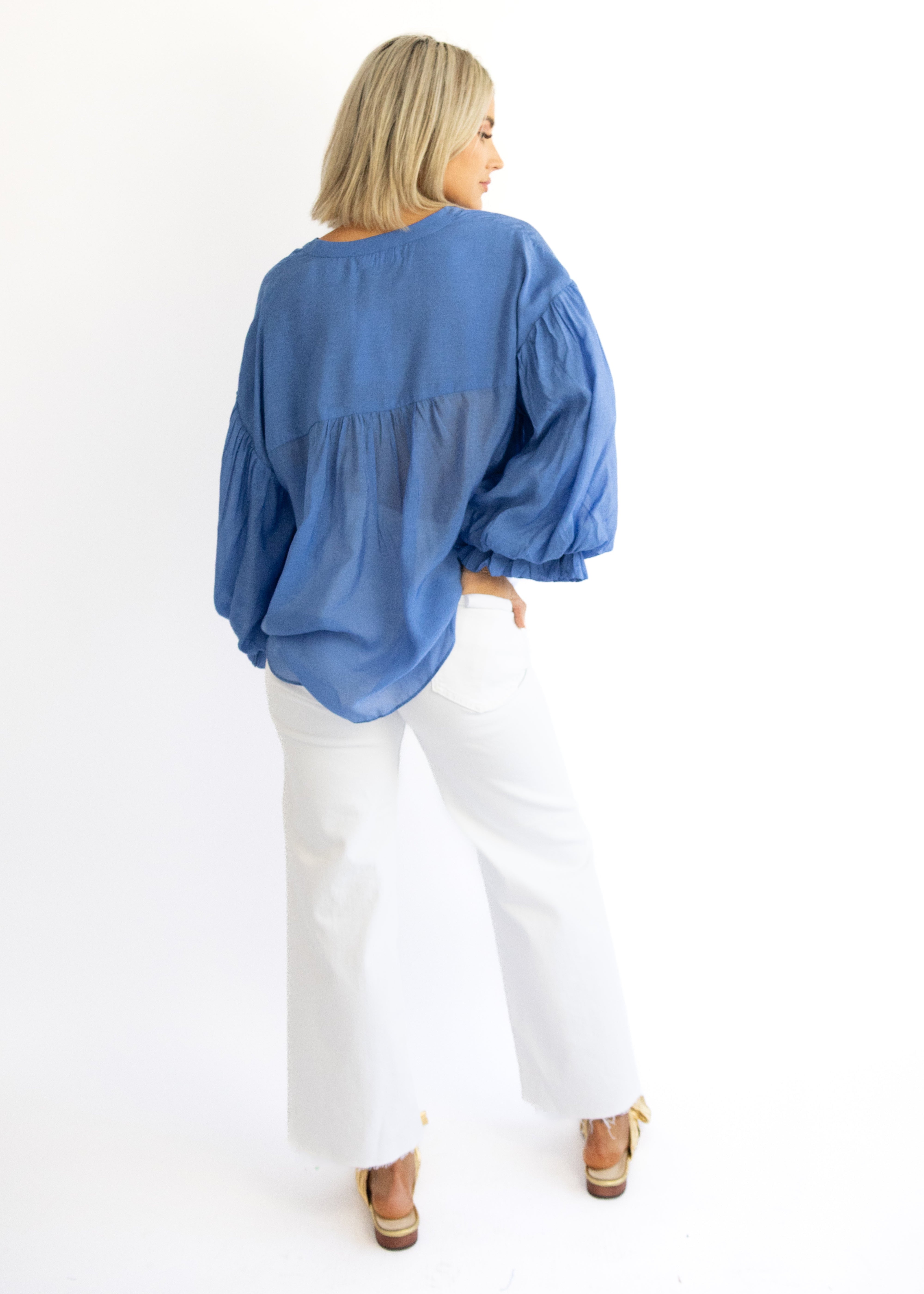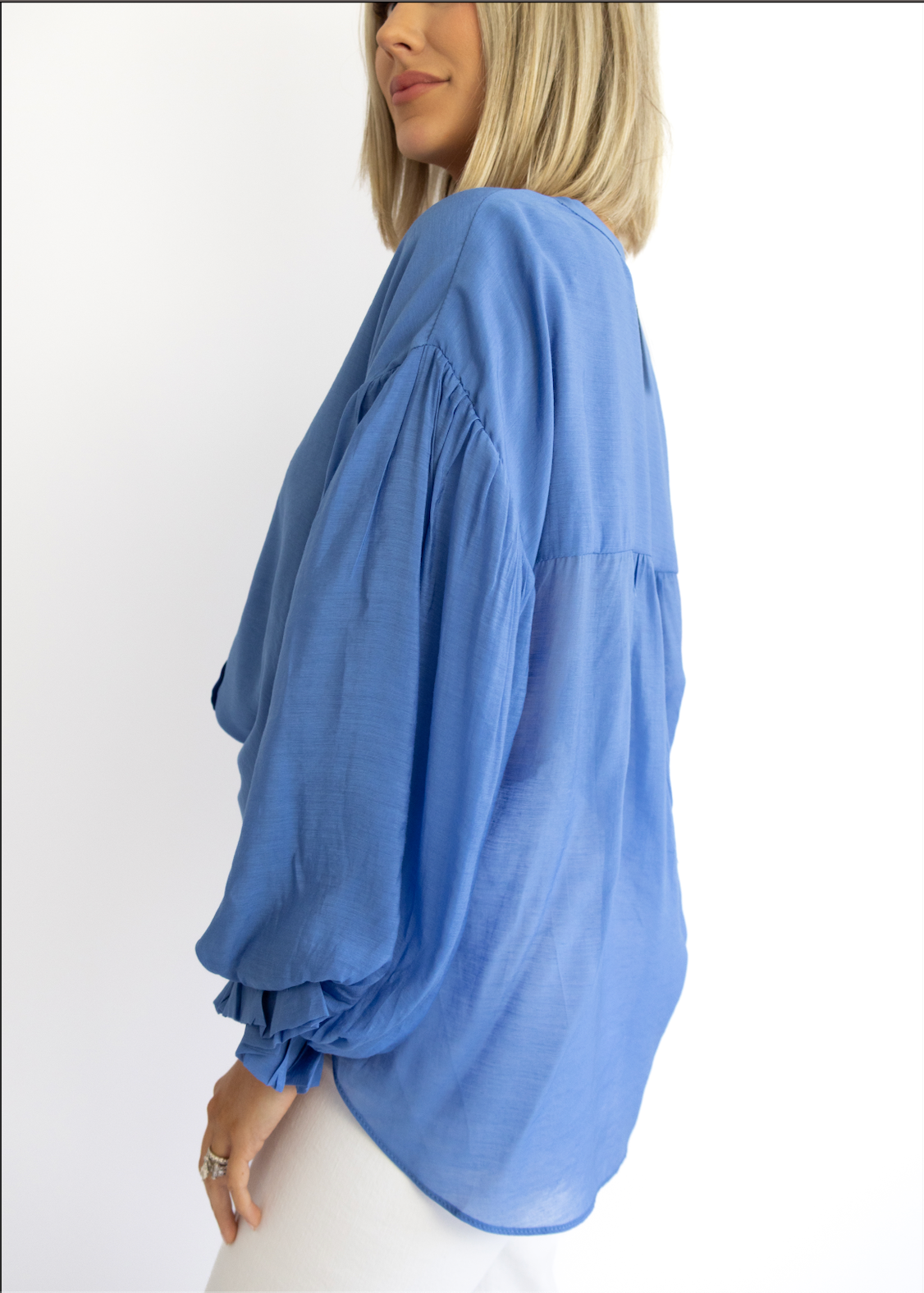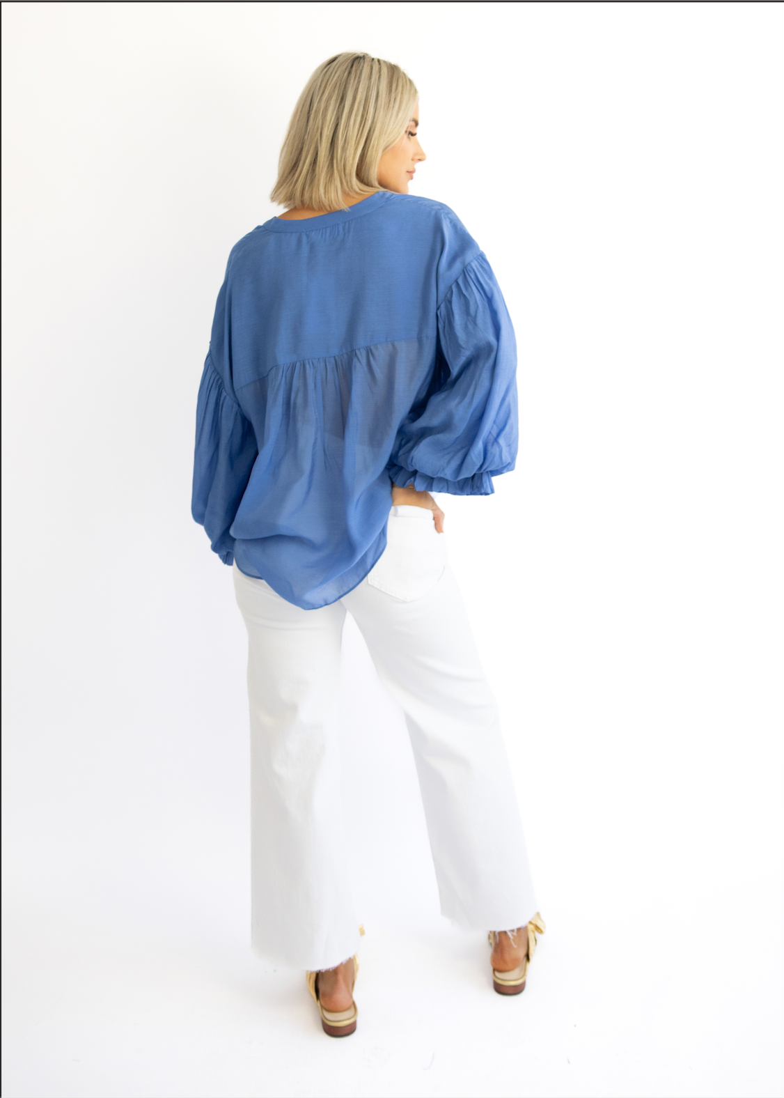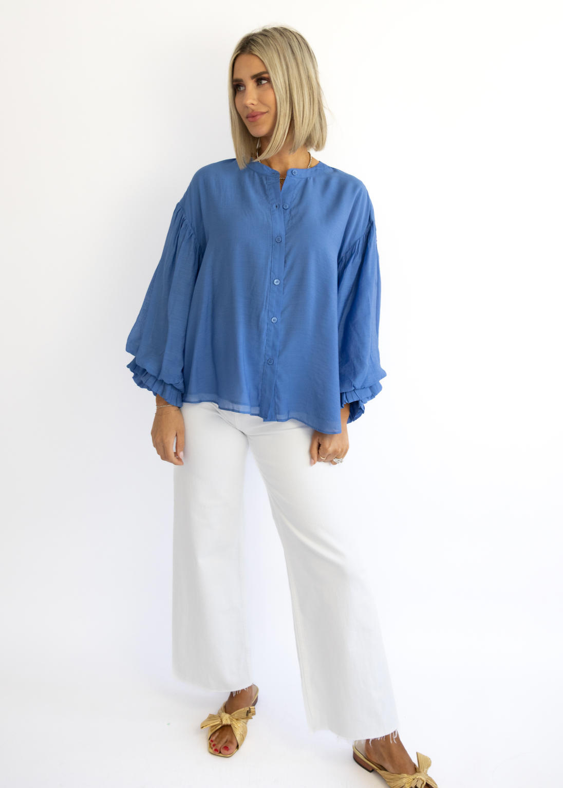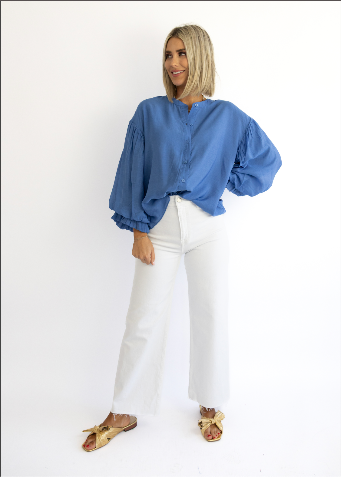 This dusty blue button-down features charming balloon sleeves that add a fun, flirty flair to your look. Fully lined for comfort and a smooth fit, it’s perfect for dressing up or down with a playful twist. Embrace effortless style with this fresh take on a classic favorite!