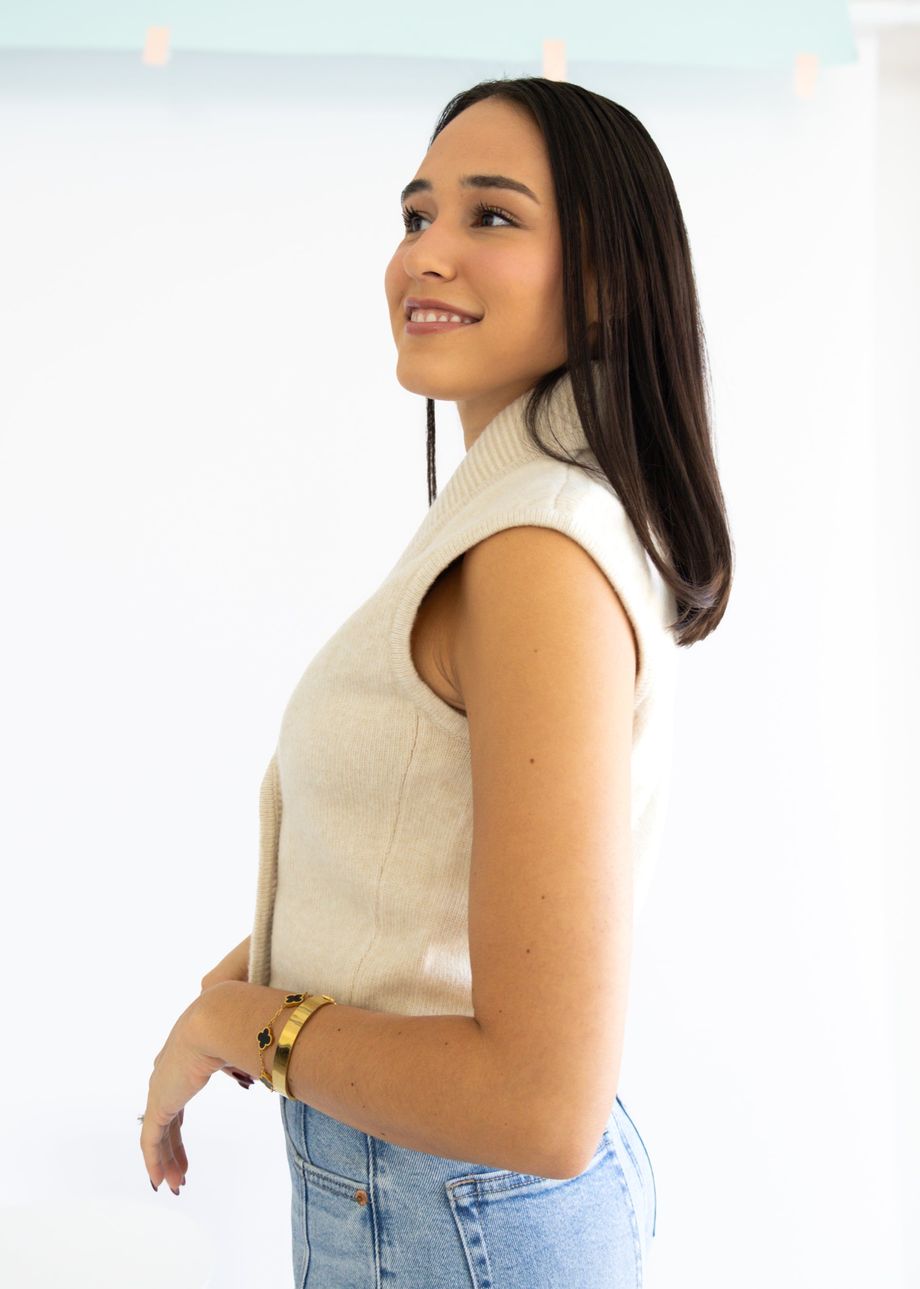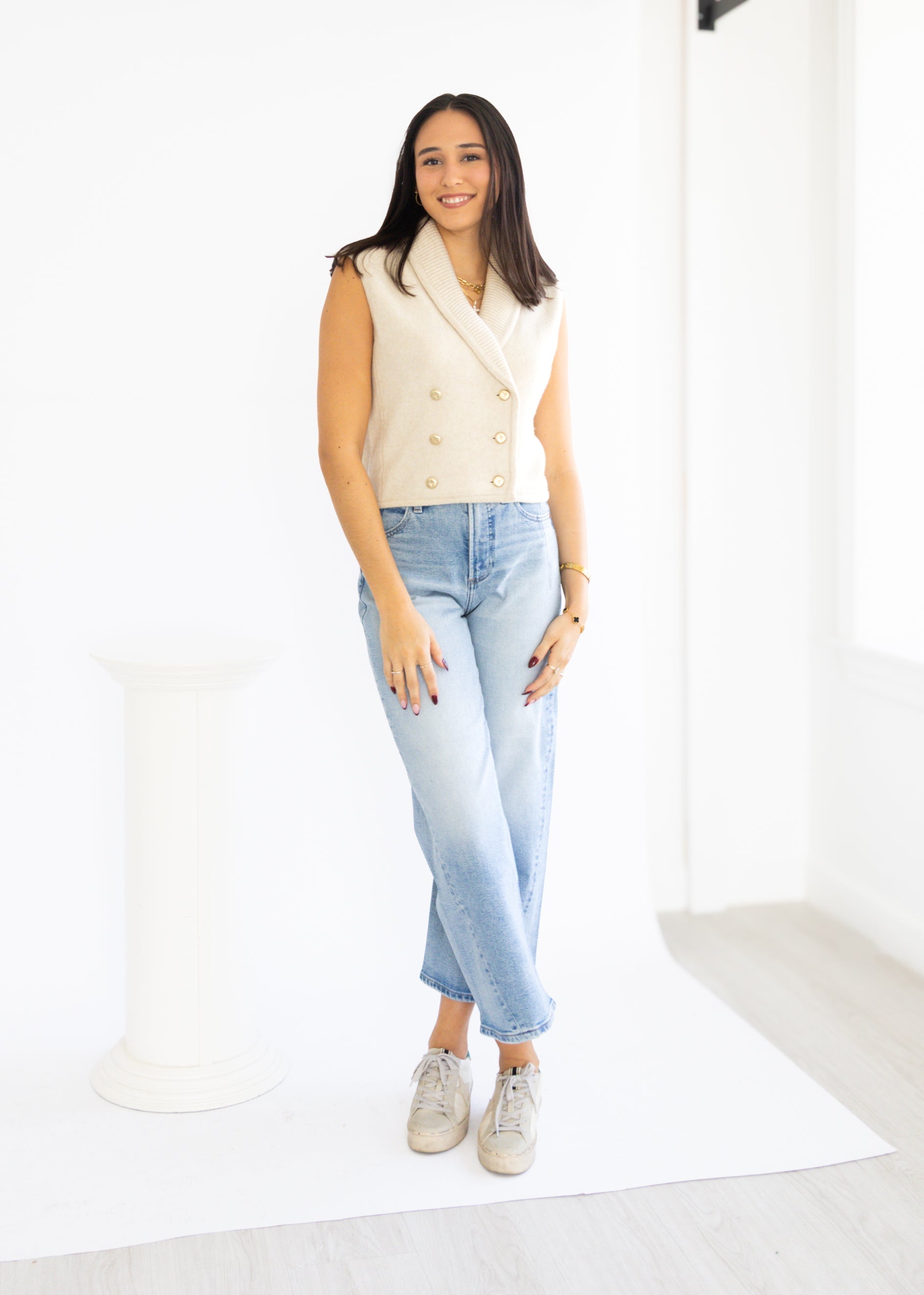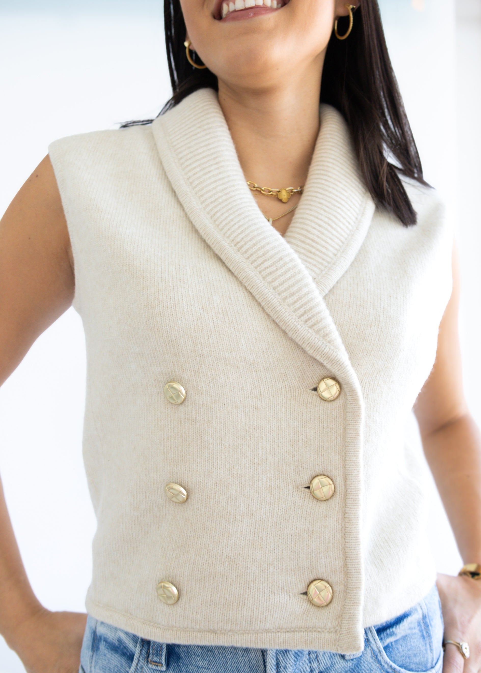 Elevate your style with the new DH New York Amber Vest. Designed with a flattering cropped fit that pairs effortlessly with high waisted denim or skirts. The soft knit fabric gives it a cozy yet polished feel while the gold button-front detail adds just the right touch of chic sophistication.