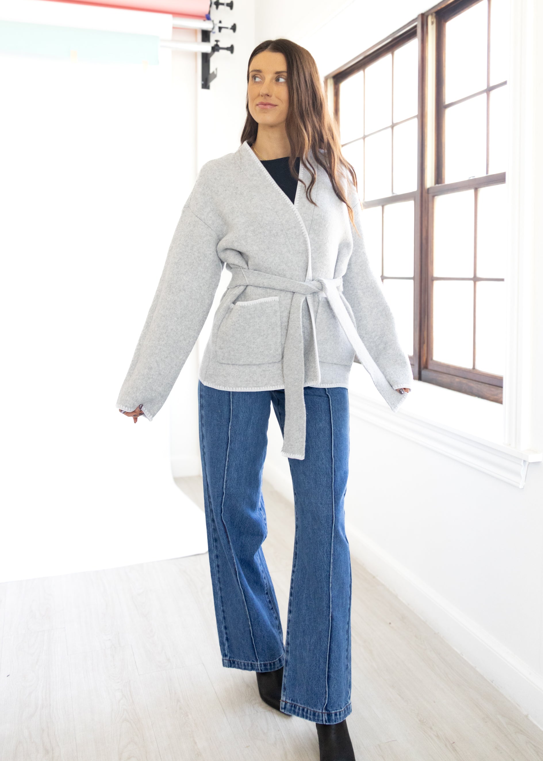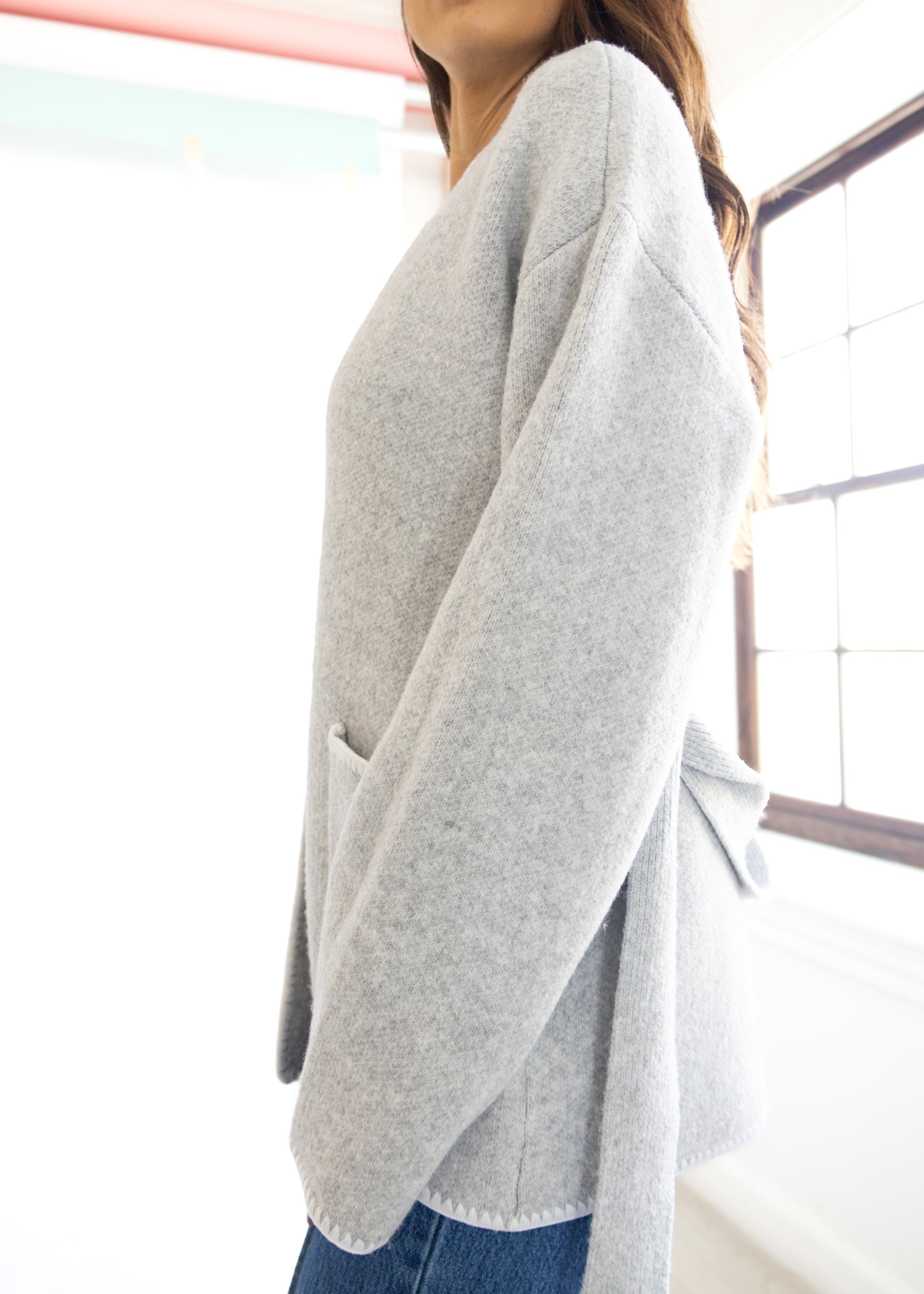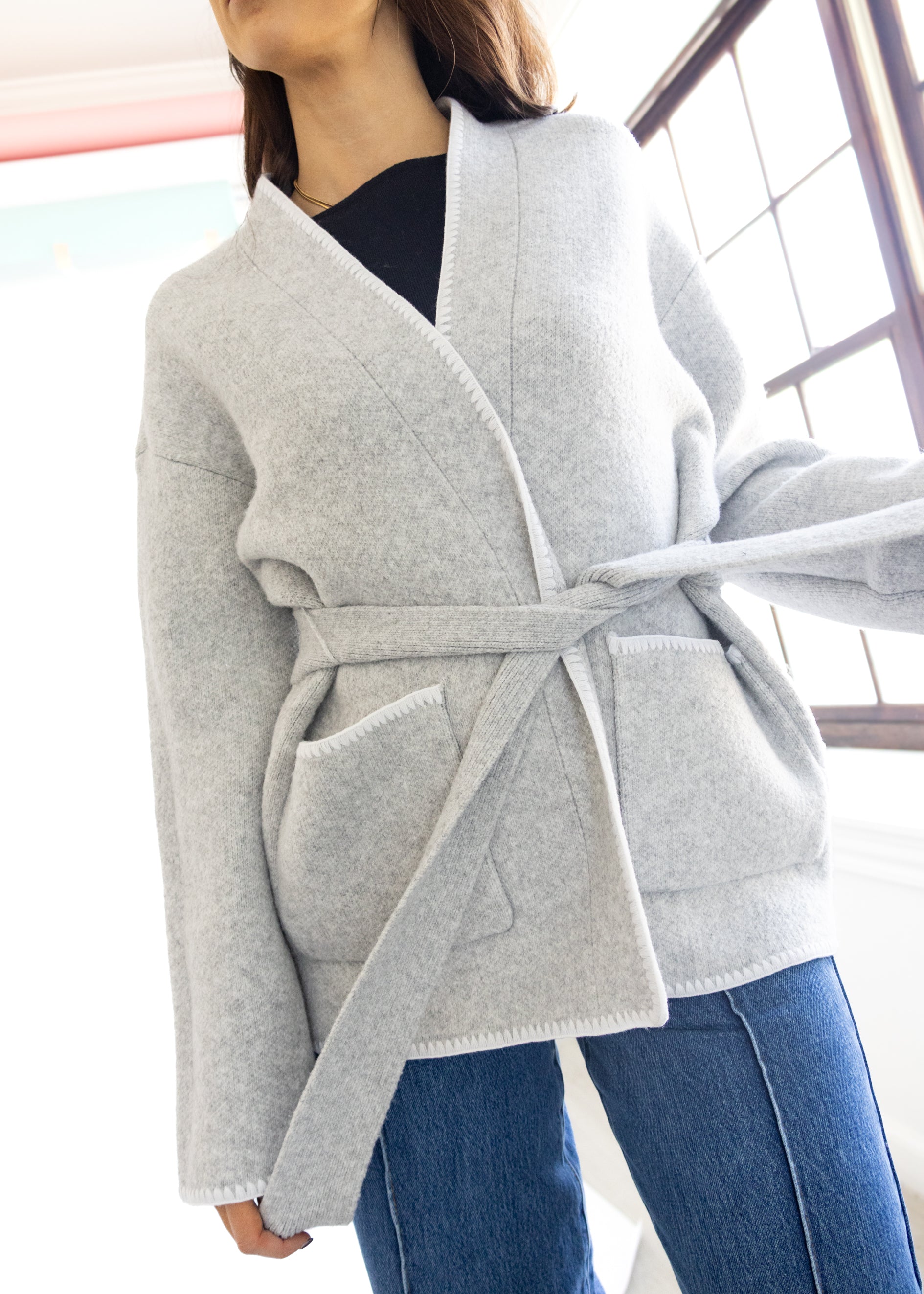 Wrap yourself in comfort with our DH New York Tie Front Cardigan This ultra-soft piece brings effortless sophistication to your everyday look. Designed in a neutral heather-gray tone, it features an open front with a self-tie belt for a flattering, adjustable fit. The wide sleeves and roomy front pockets give it that relaxed, elevated vibe — perfect for layering over your favorite tee or turtleneck. Whether you’re lounging at home or heading out for coffee, this cardigan blends warmth and style with ease.