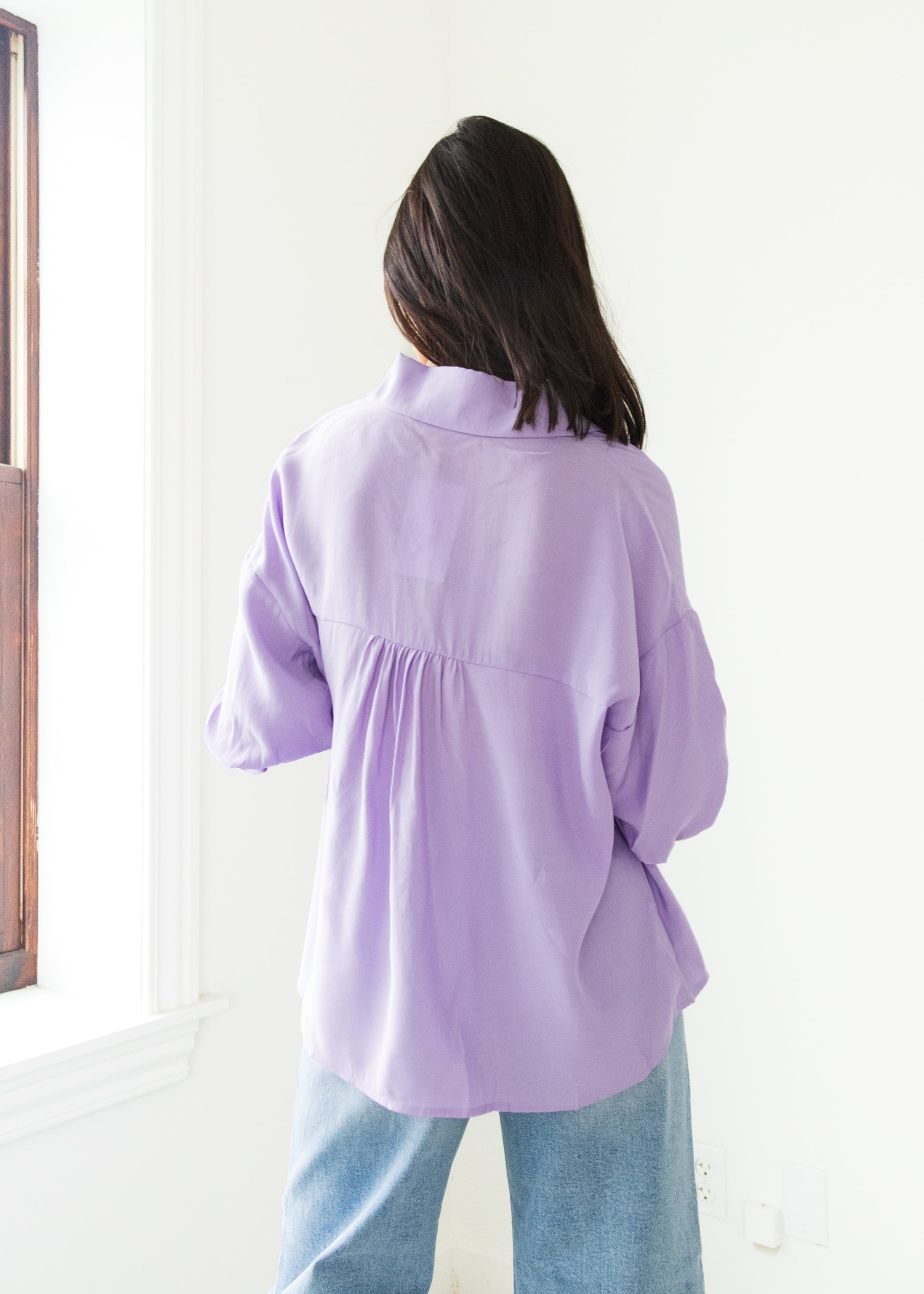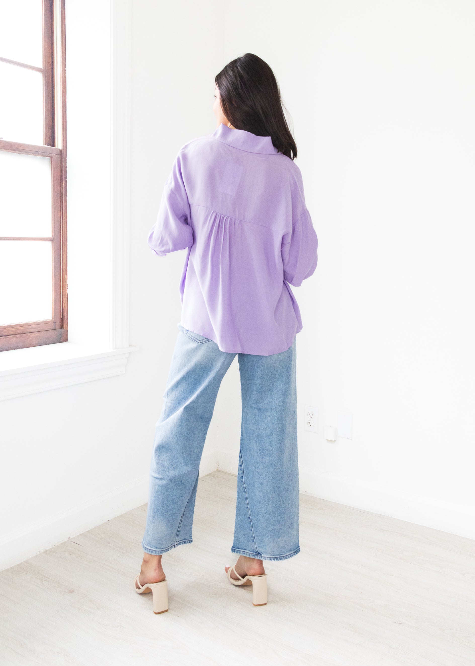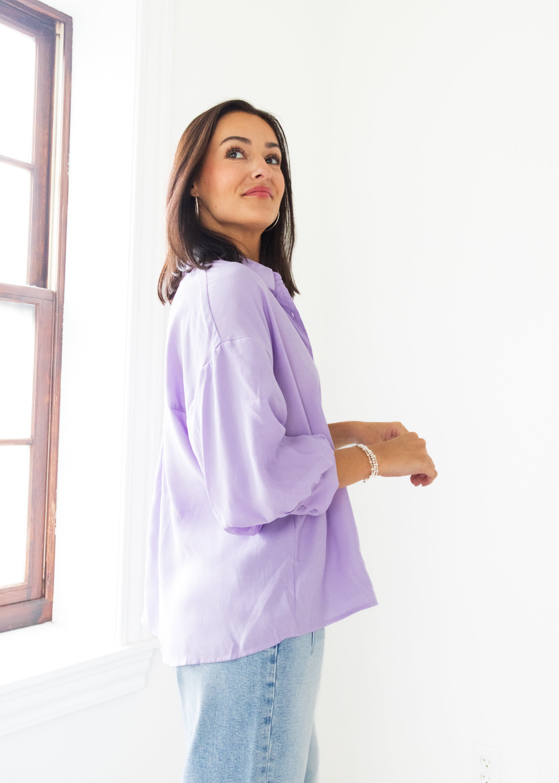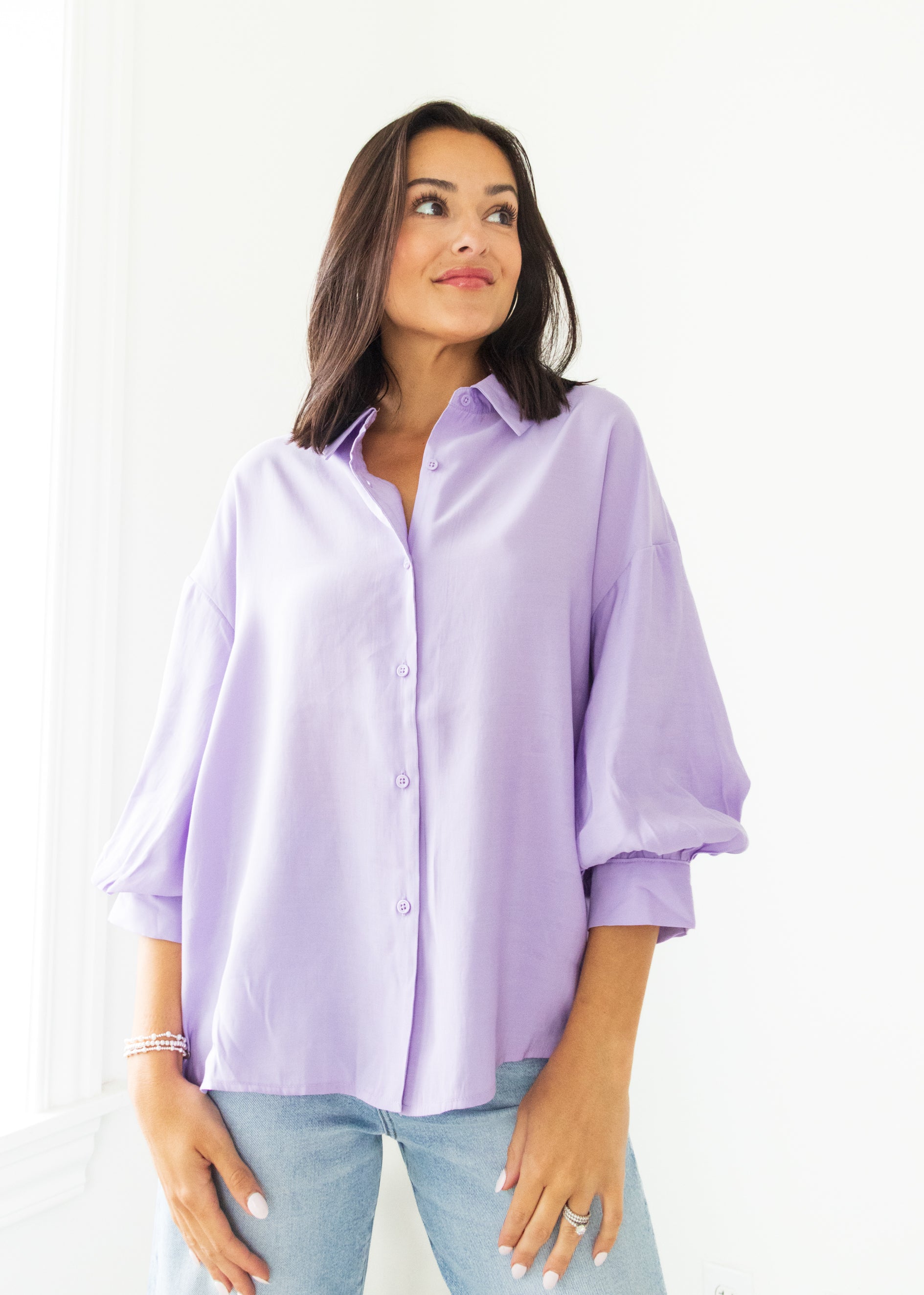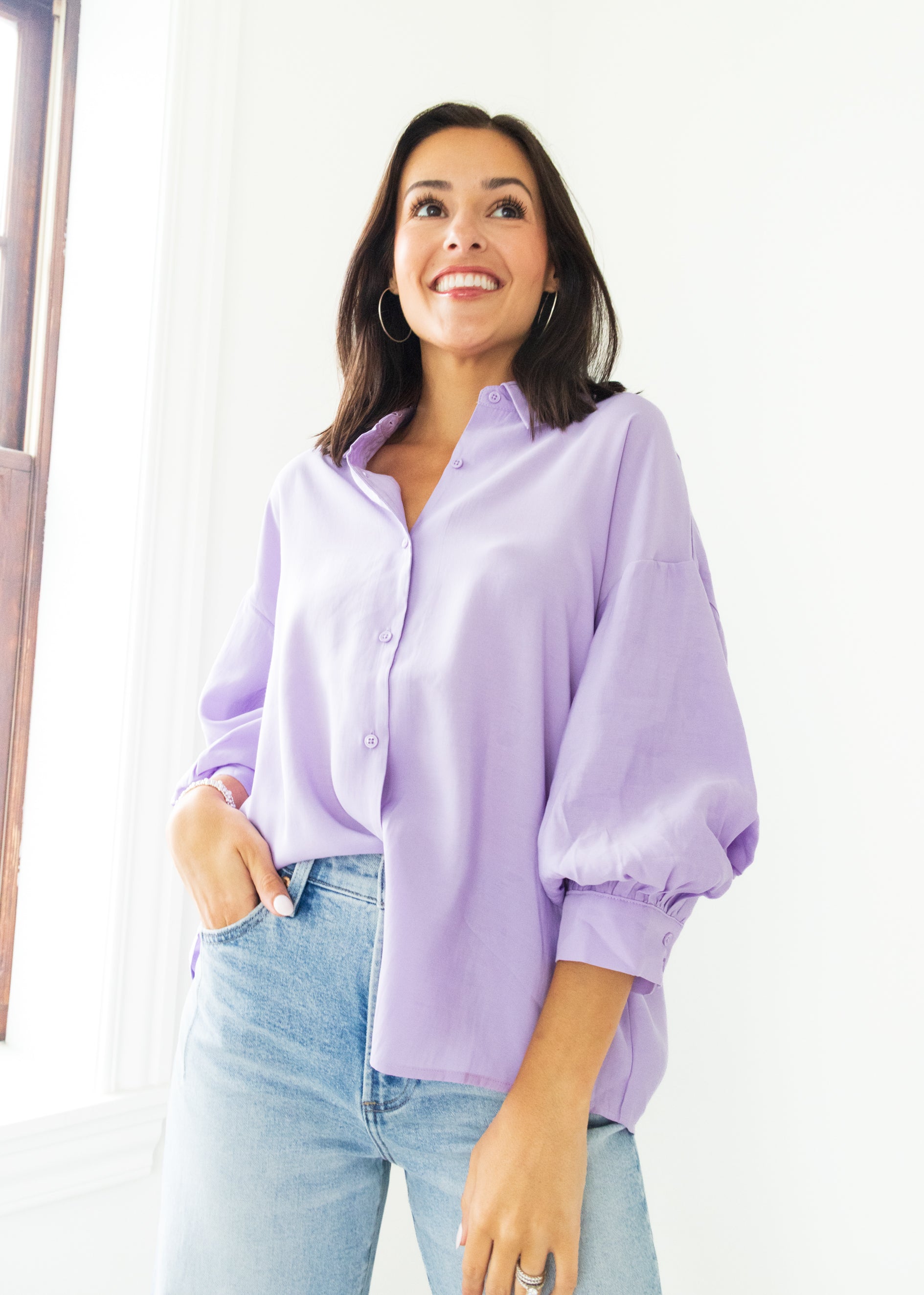 The Lavender Sky Balloon Sleeve Blouse is your new go-to easy top, blending soft lavender tones with fun, voluminous sleeves. Its breezy design keeps you comfortable while adding a playful twist to your everyday style. Perfect for brightening up any outfit with a touch of whimsy.