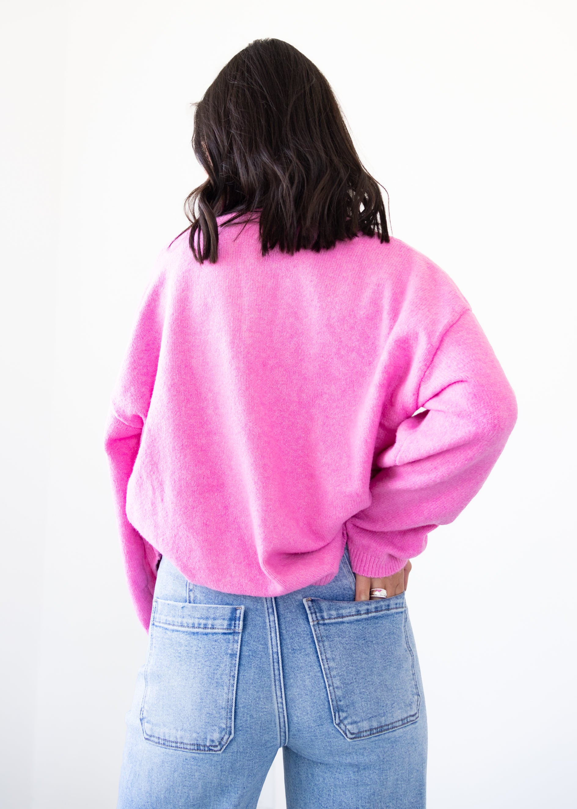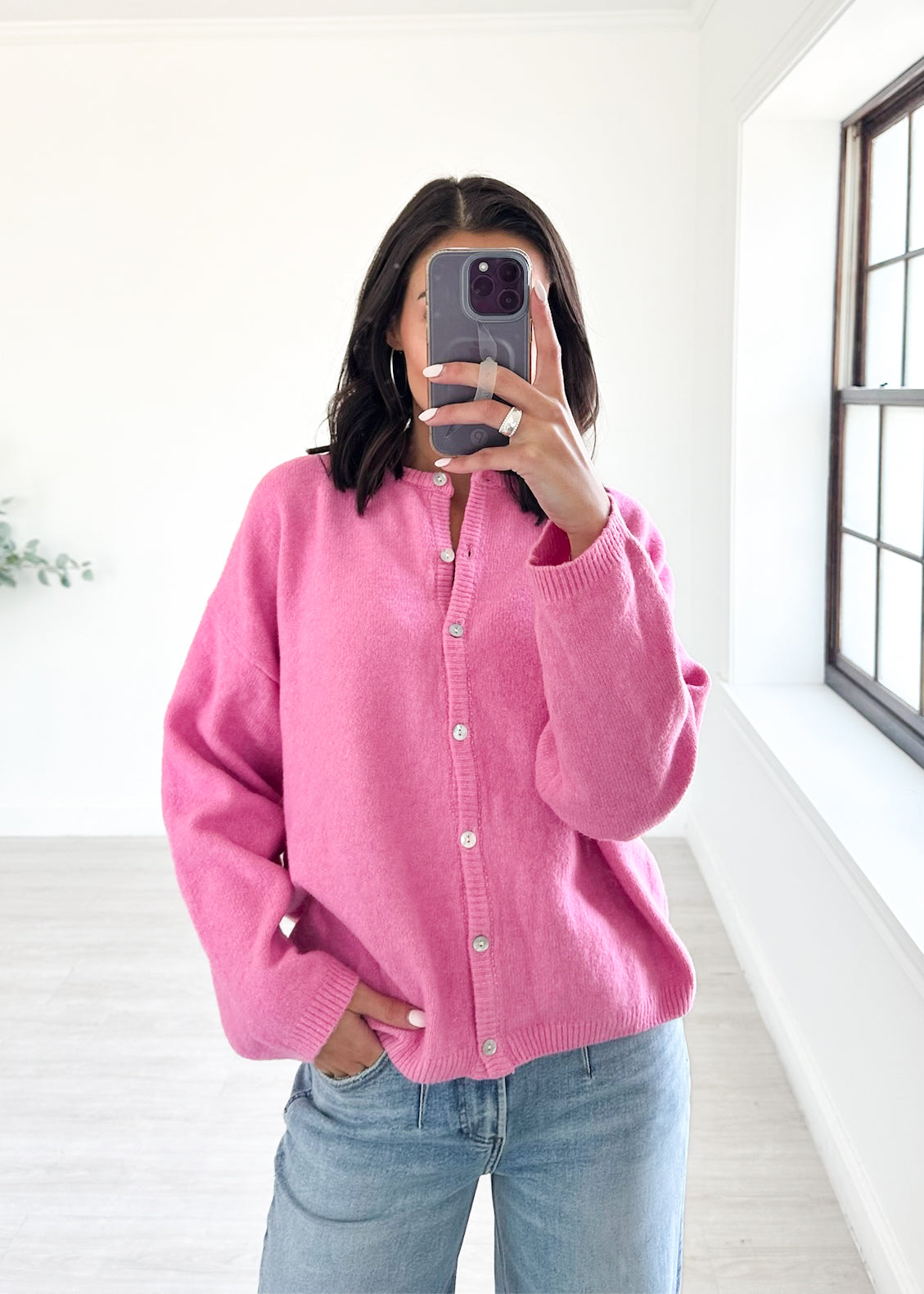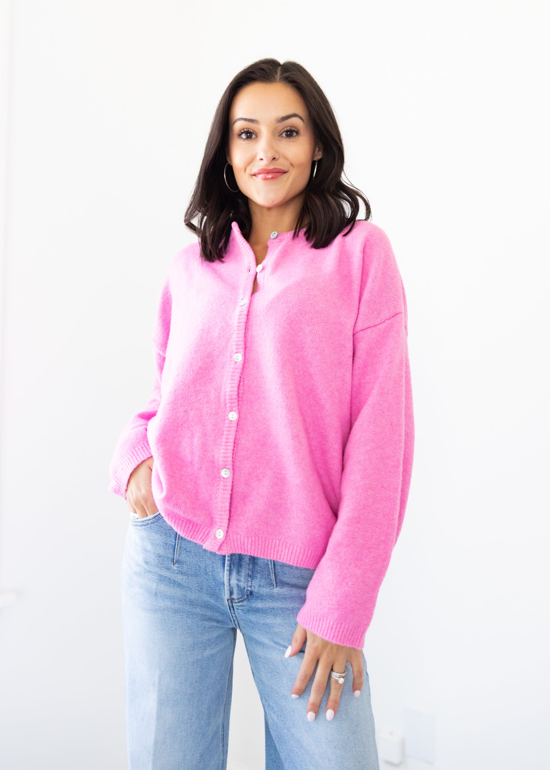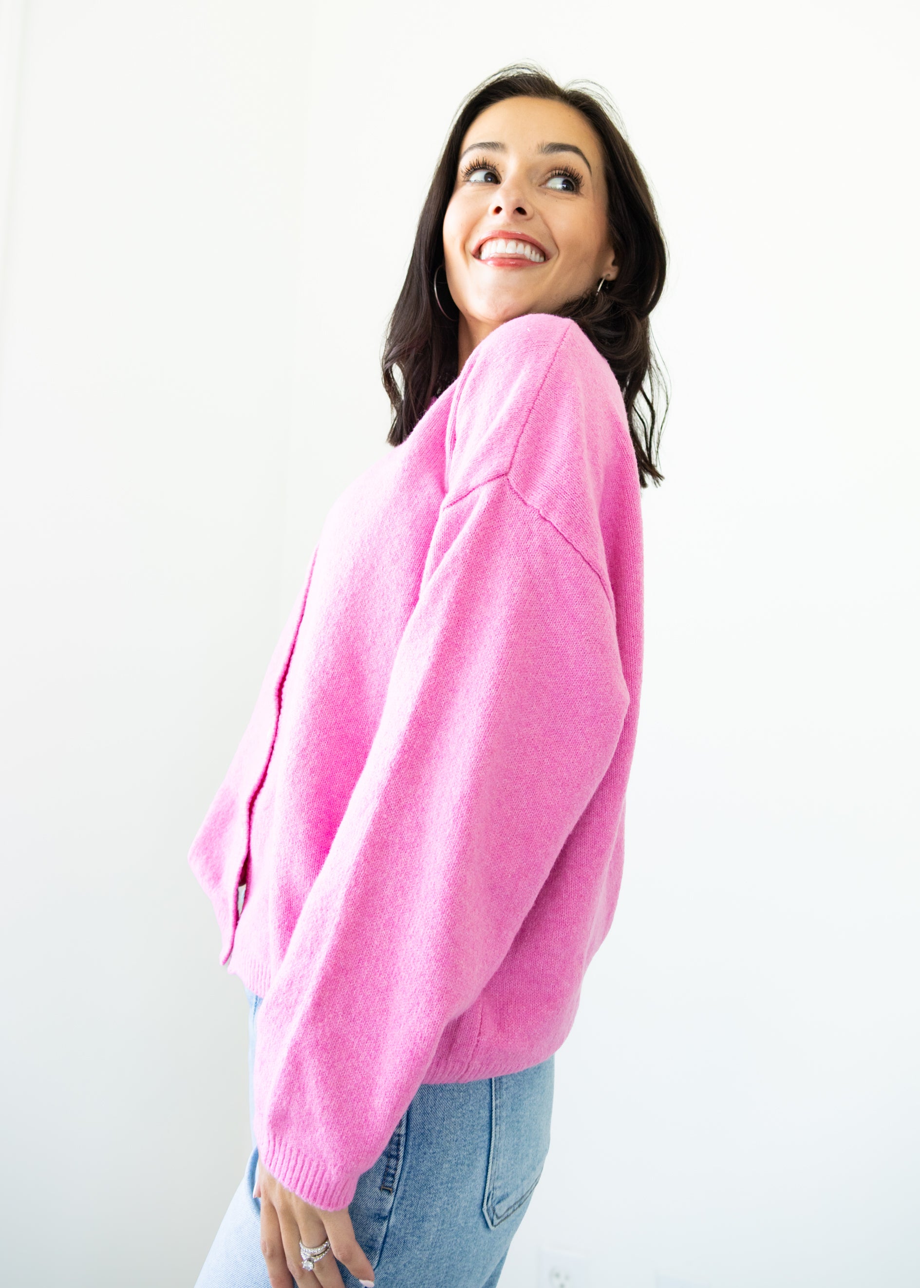 Brighten up any day with the Lola Sweater Cardigan in a cheerful pink knit. This cozy yet lightweight layer adds the perfect pop of color while keeping you warm and stylish. With its playful charm and versatile fit, Lola is your go-to cardigan for casual outings, weekend brunch, or layering over your favorite dresses. A must-have sweater that blends comfort and effortless style in one.