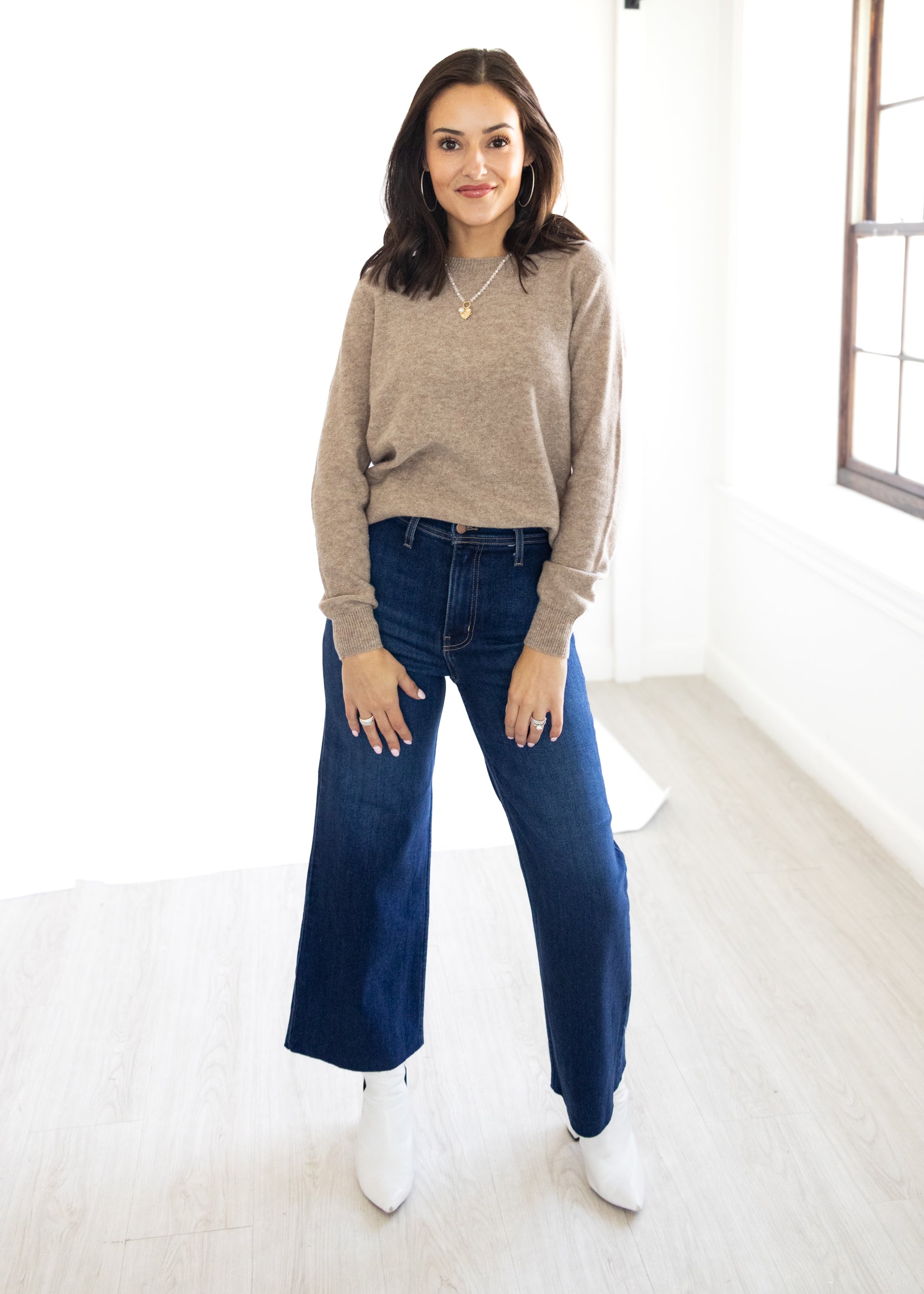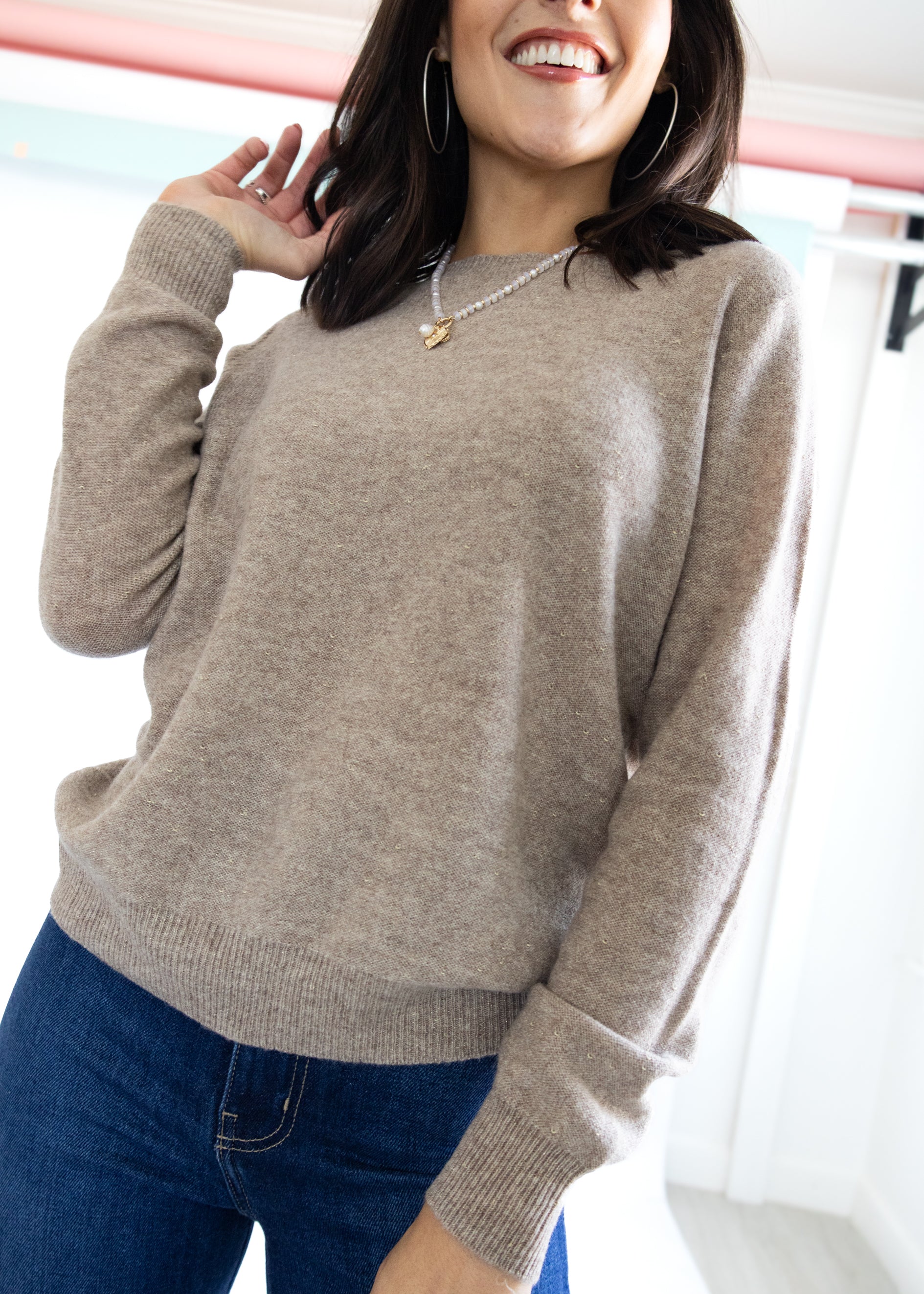 The Mocha Glow Sweater is a rich mocha knit infused with subtle gold sparkle, blending cozy comfort with a hint of shine. Designed with a classic crew neckline and long sleeves, this women’s sweater offers a flattering fit that transitions seamlessly from day to night. Perfect for holiday gatherings, date nights, or everyday chic, it pairs beautifully with denim, skirts, or tailored pants. A versatile knitwear essential that adds warmth, style, and a touch of glow to your wardrobe.