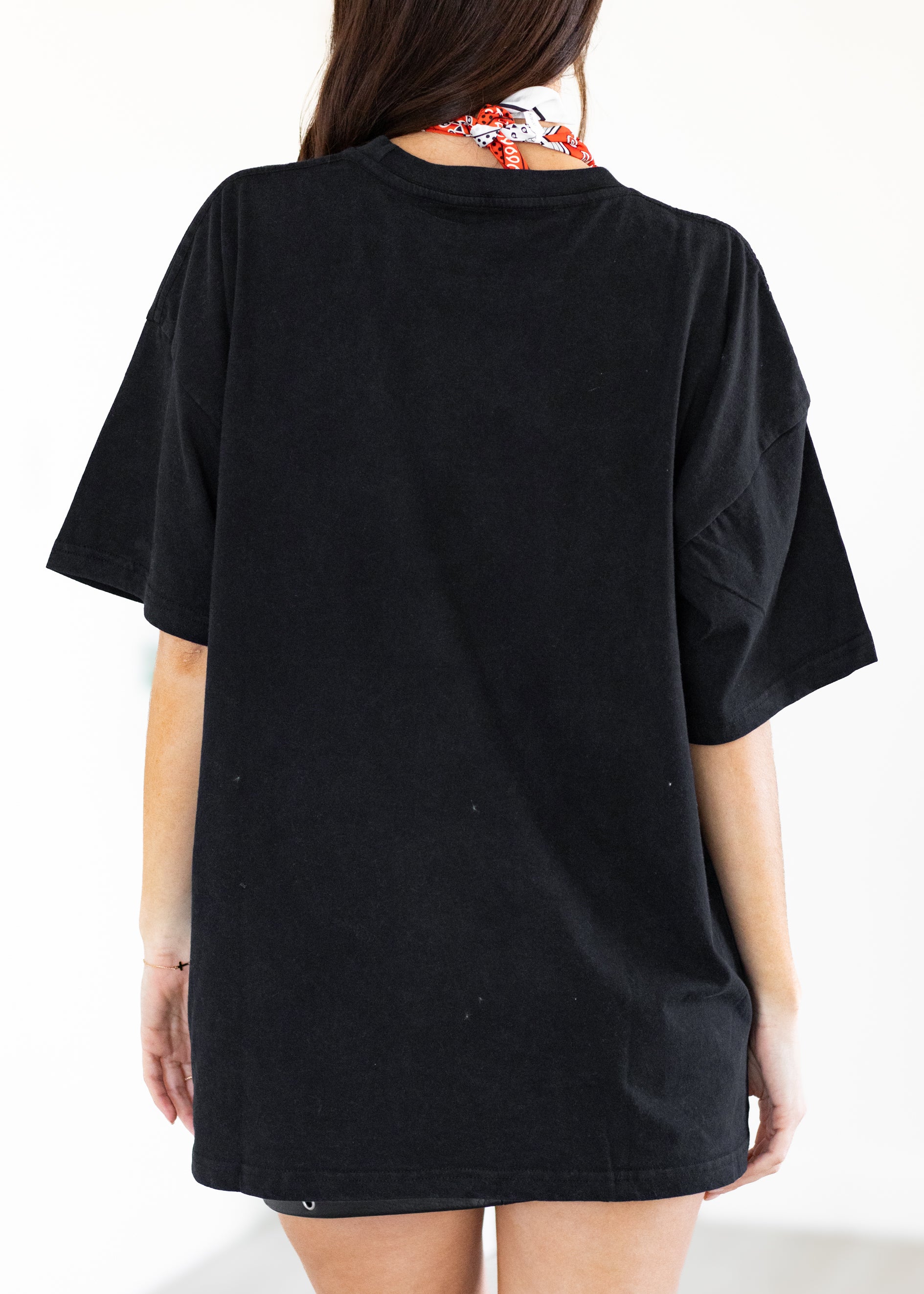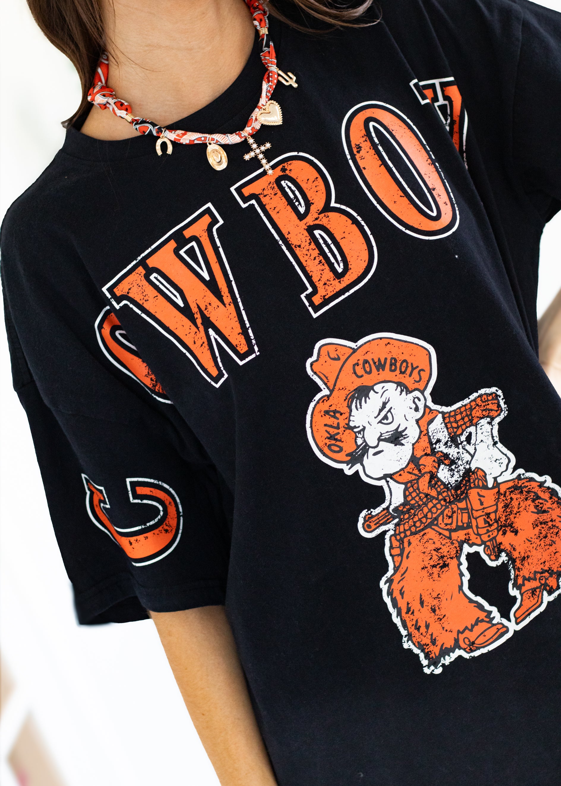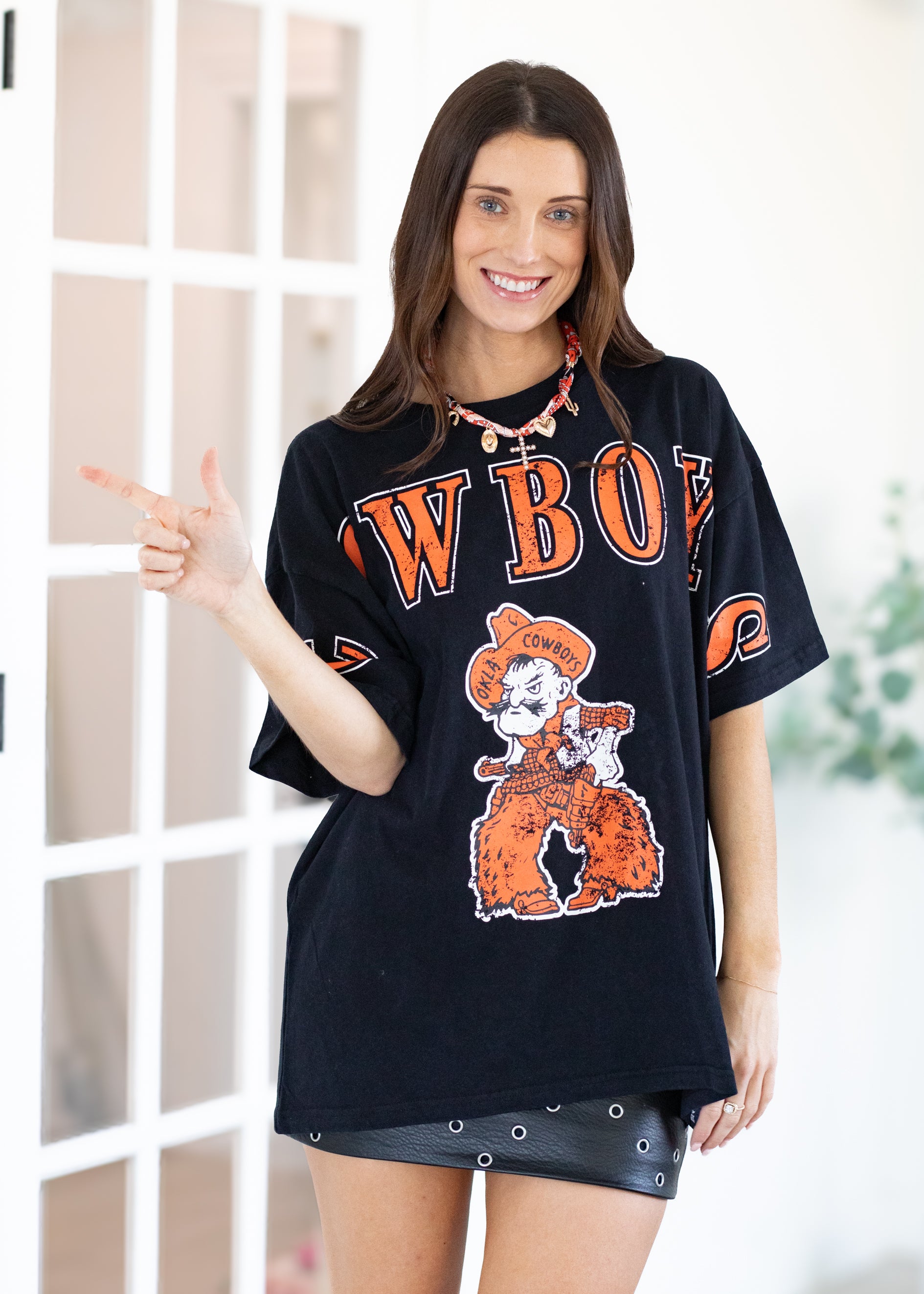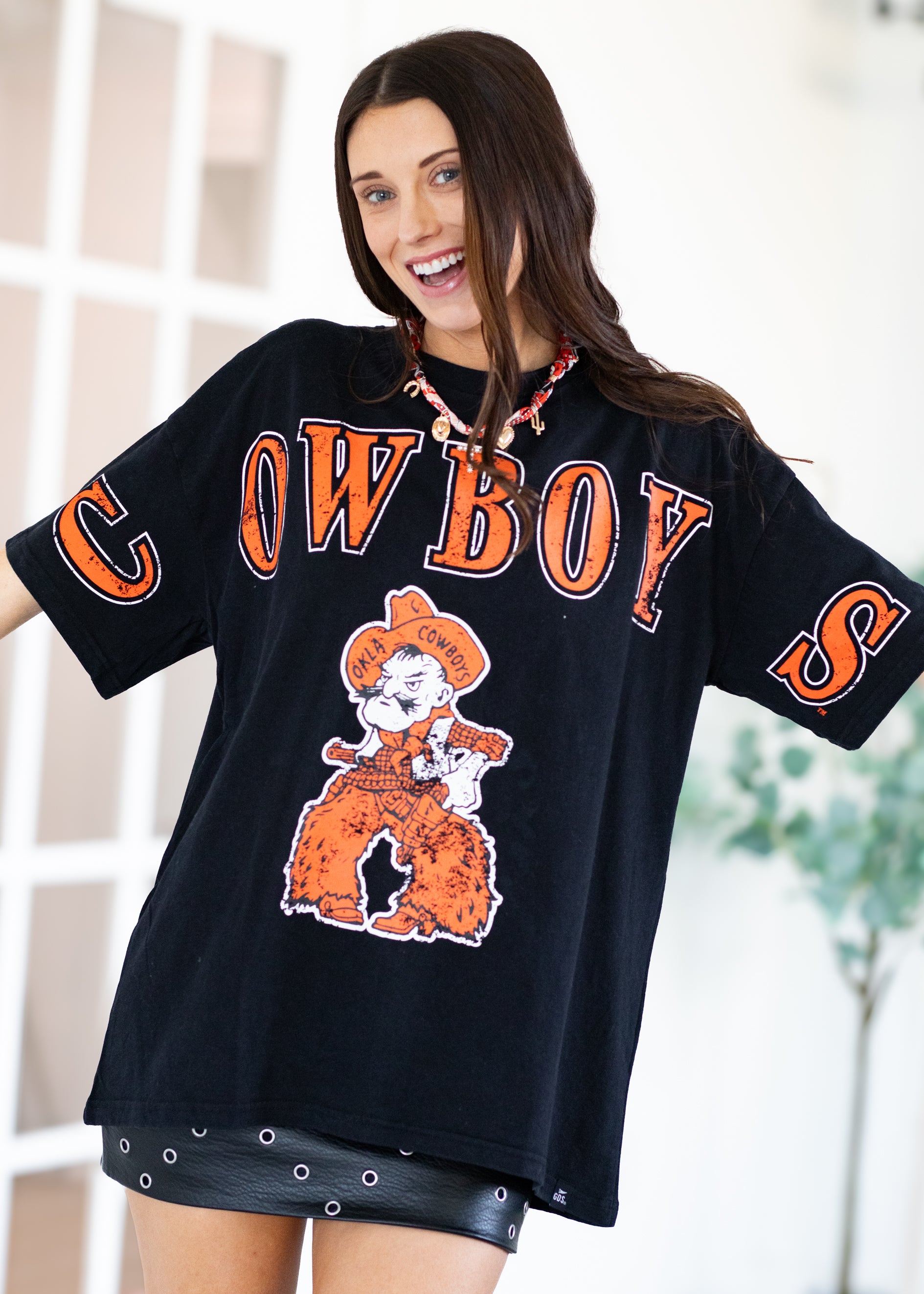 Root for the Pokes in effortless comfort with the Oklahoma State Oversized Tee in washed black. This relaxed, boxy tee features a bold Oklahoma State design that runs the length of both sleeves for immediate gameday impact. Cut from a breathable cotton-jersey (soft, broken-in feel), the oversized silhouette and drop shoulder make it perfect for layering over leggings or tucking into high-rise jeans for a laid-back tailgate look.