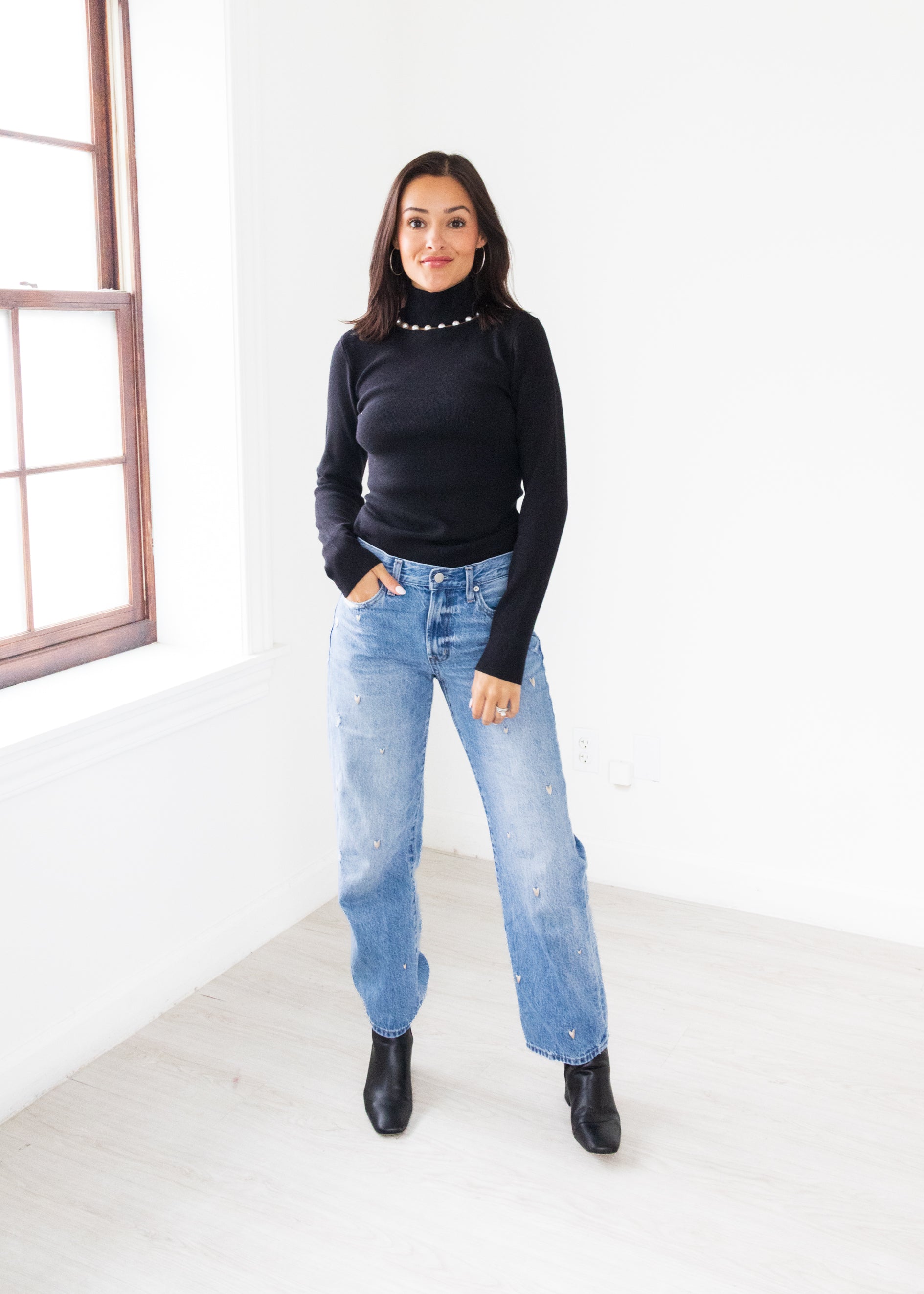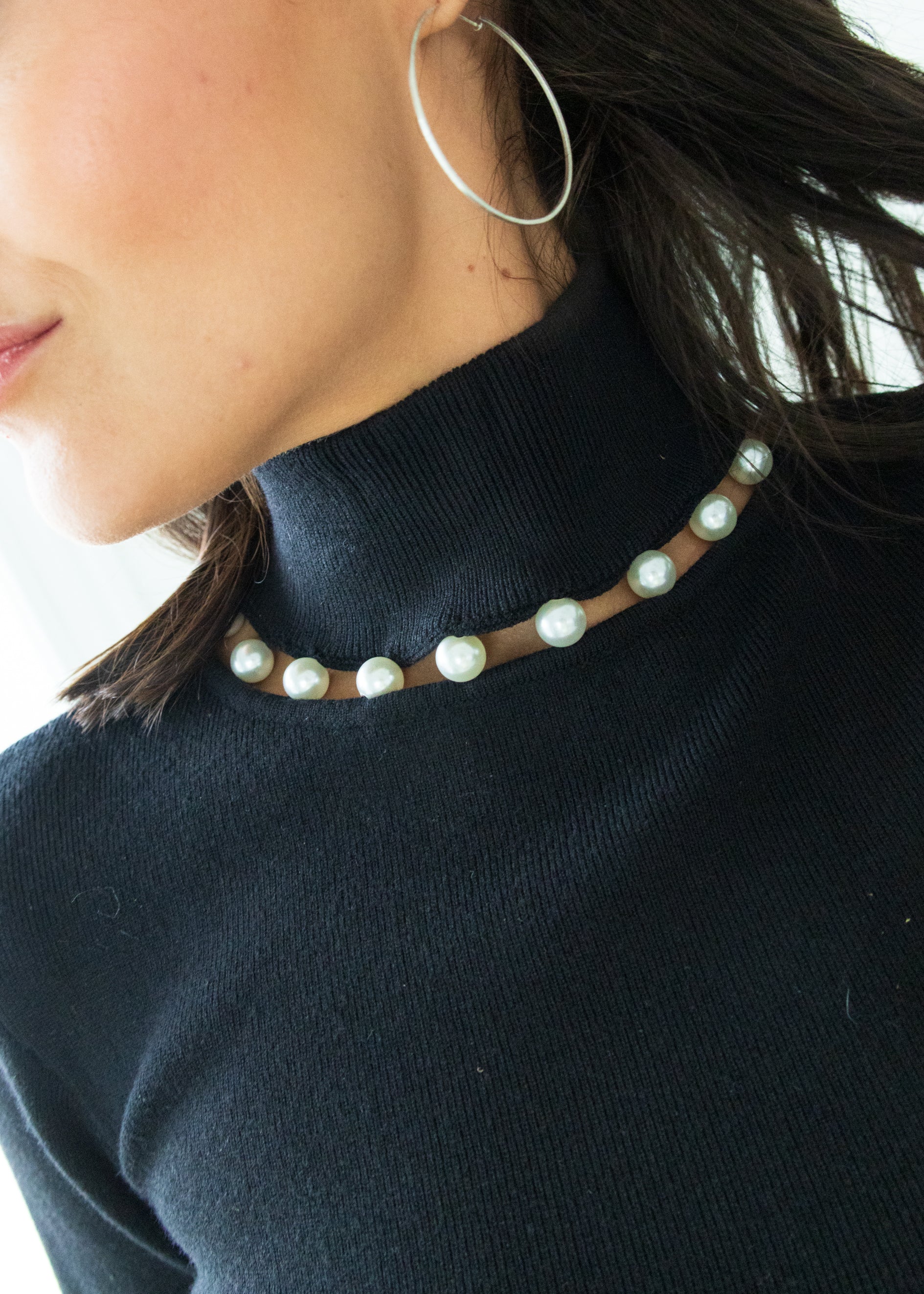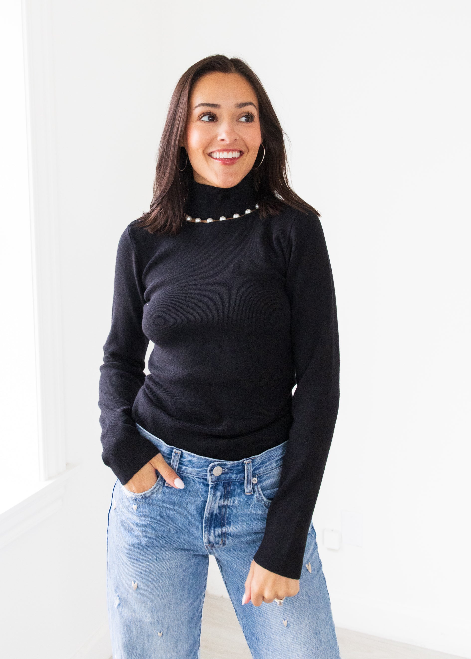 The Sophie Pearl Trim Sweater is your new cozy crush! This chic black sweater pops with a pearl neckline detail, adding a dash of sparkle to your everyday look. Soft, stylish, and totally charming—it's perfect for making cold days a little brighter and outfits effortlessly fabulous.