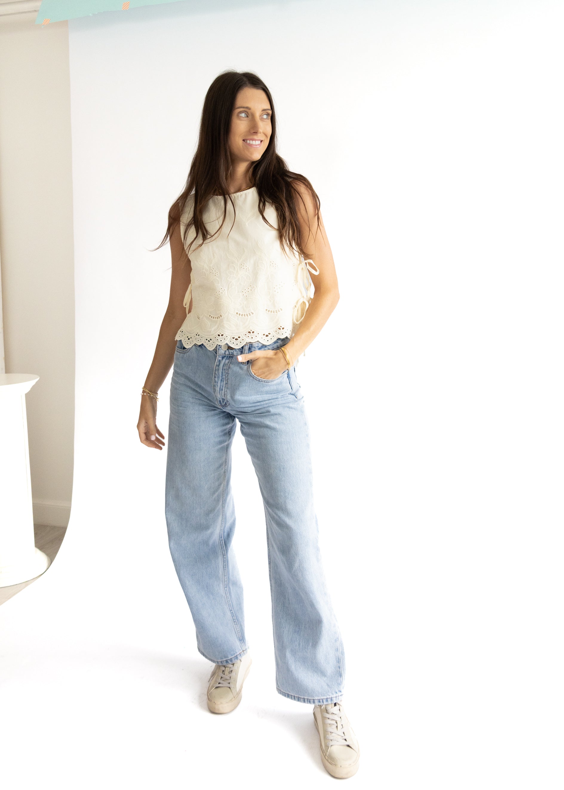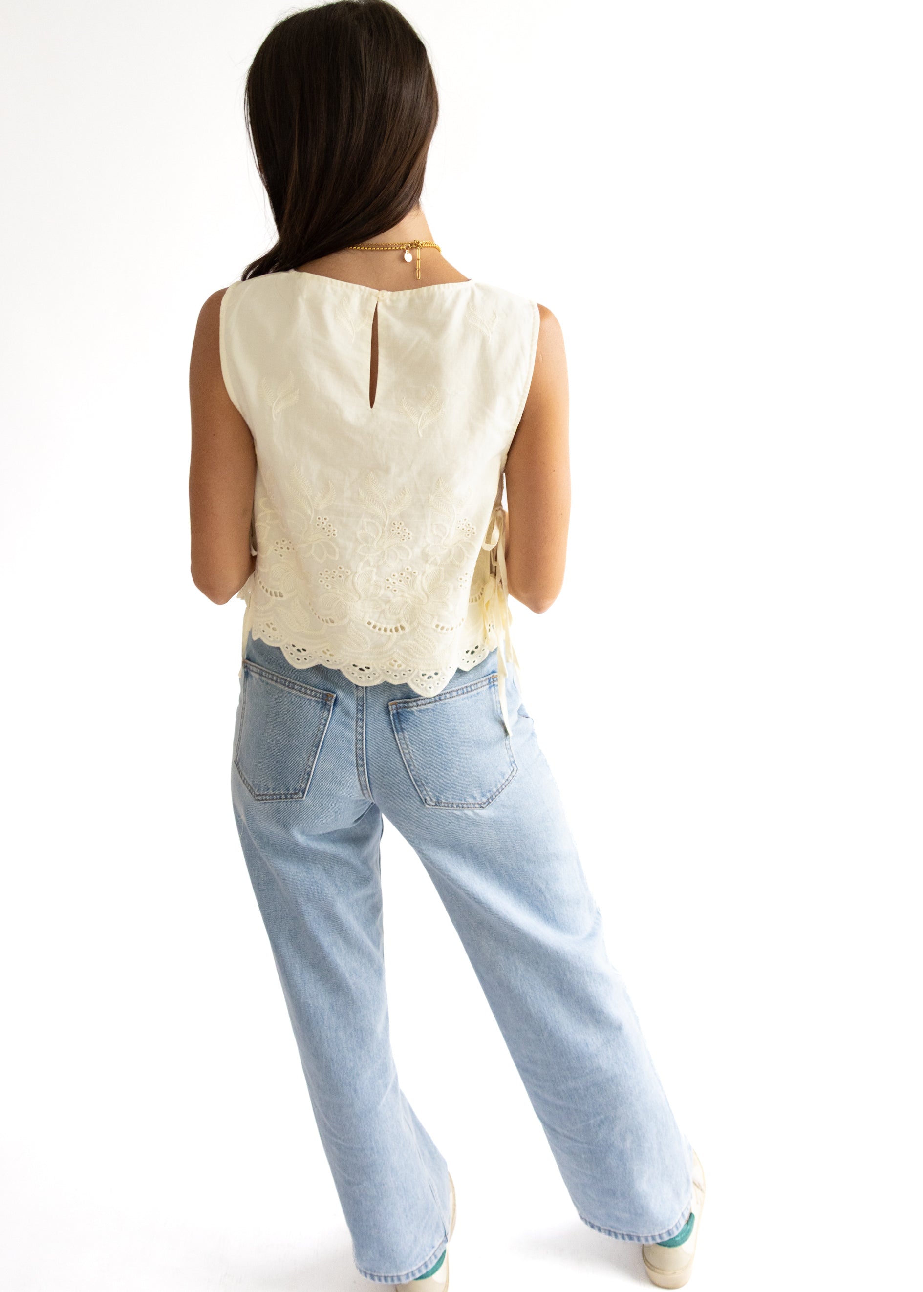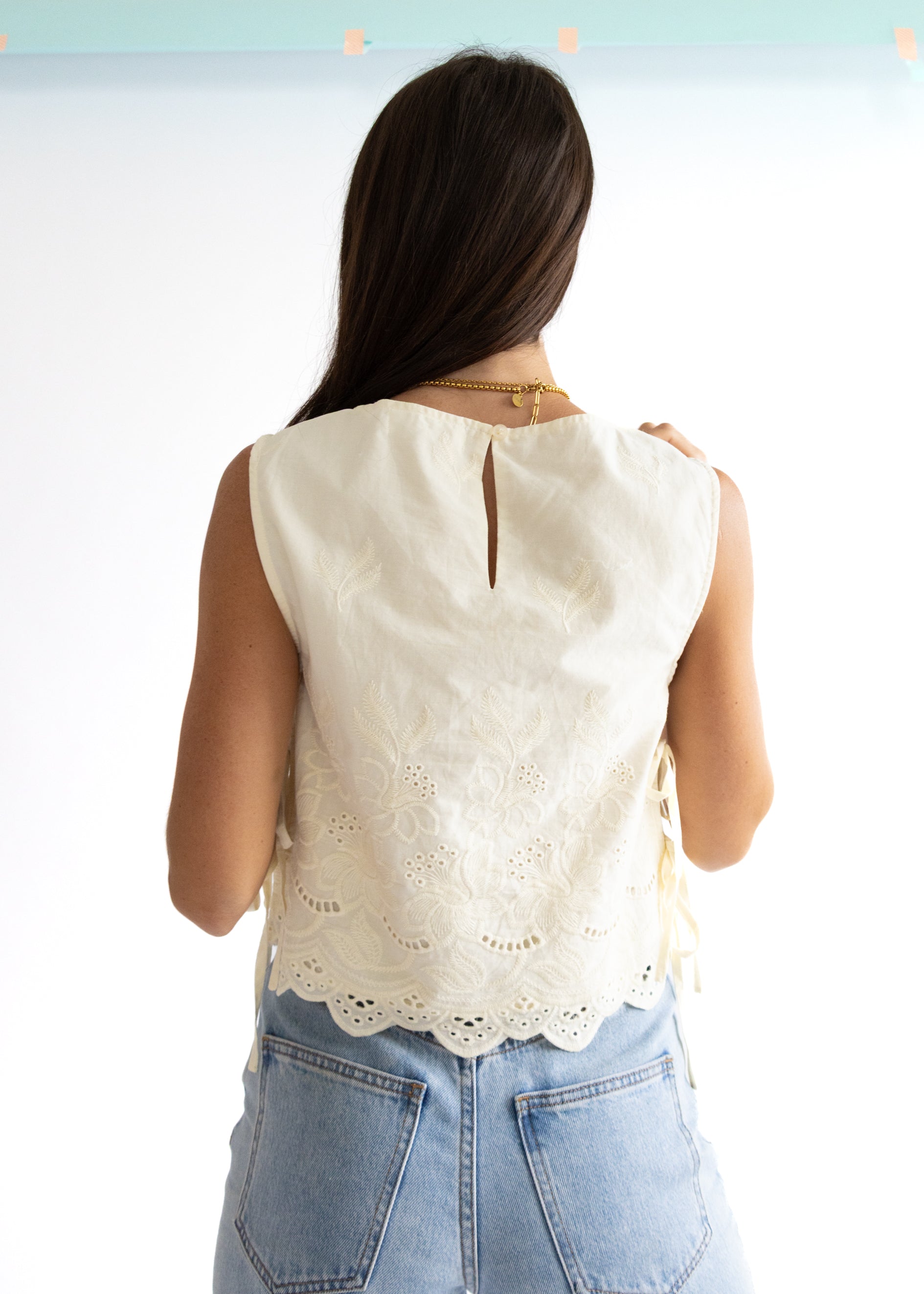 Brighten your wardrobe with this playful oatmeal colored linen tank featuring a scallop hem and a charming side tie. The delicate eyelet fabric adds a breezy, feminine touch, while the adjustable tie ensures a perfect fit. Ideal for sunny days, this top brings effortless style and a fun, flirty vibe to any outfit.
