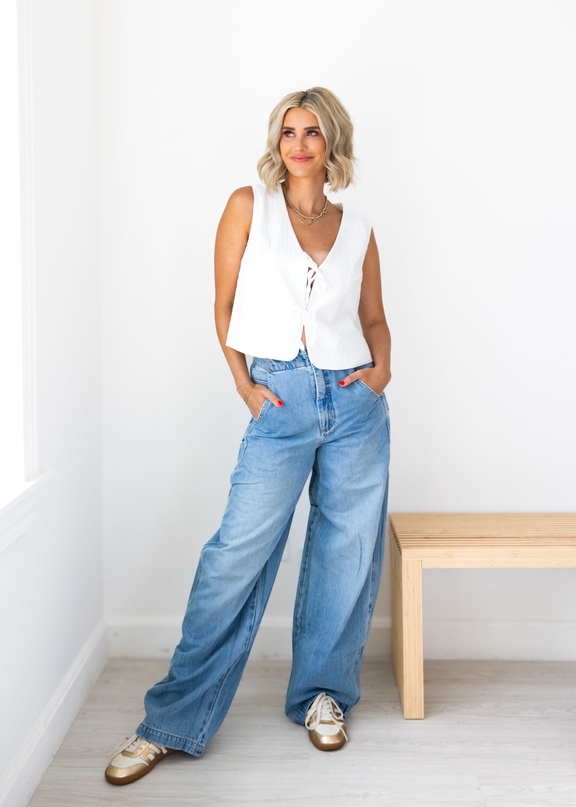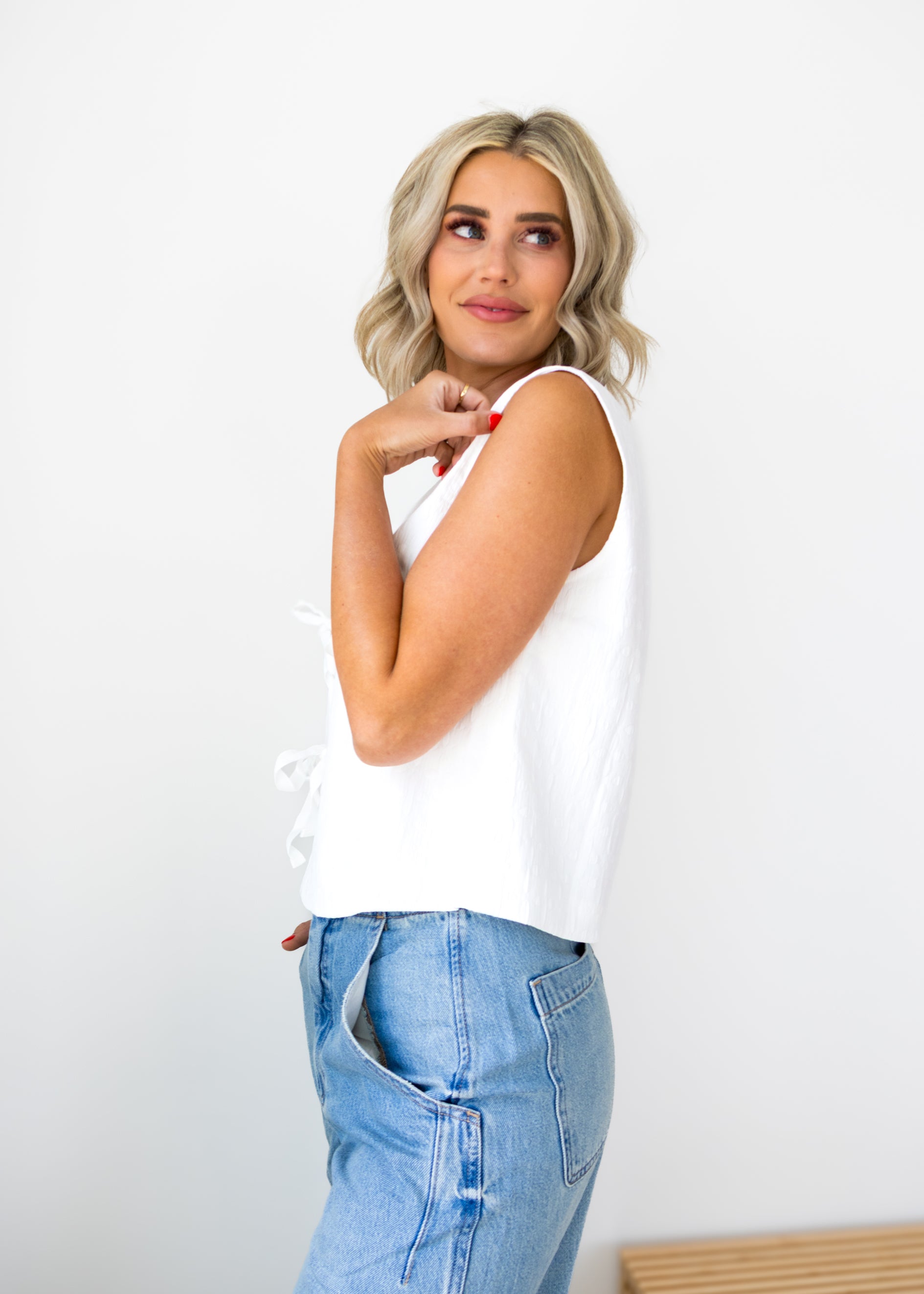 This lightweight white top features a charming front tie that adds a flirty twist to your look. Perfect for sunny days or layering, it brings effortless style and a playful vibe to any outfit.