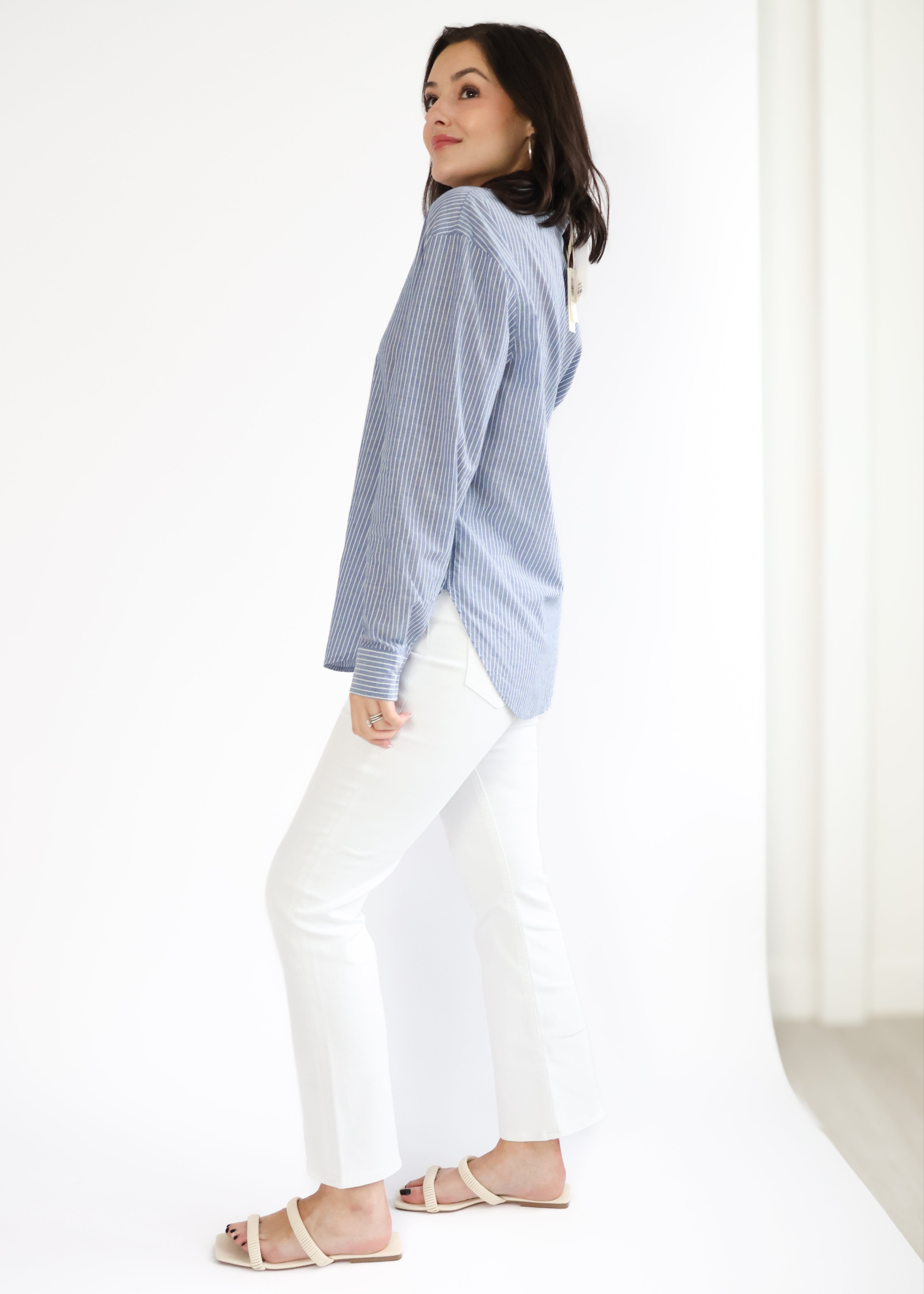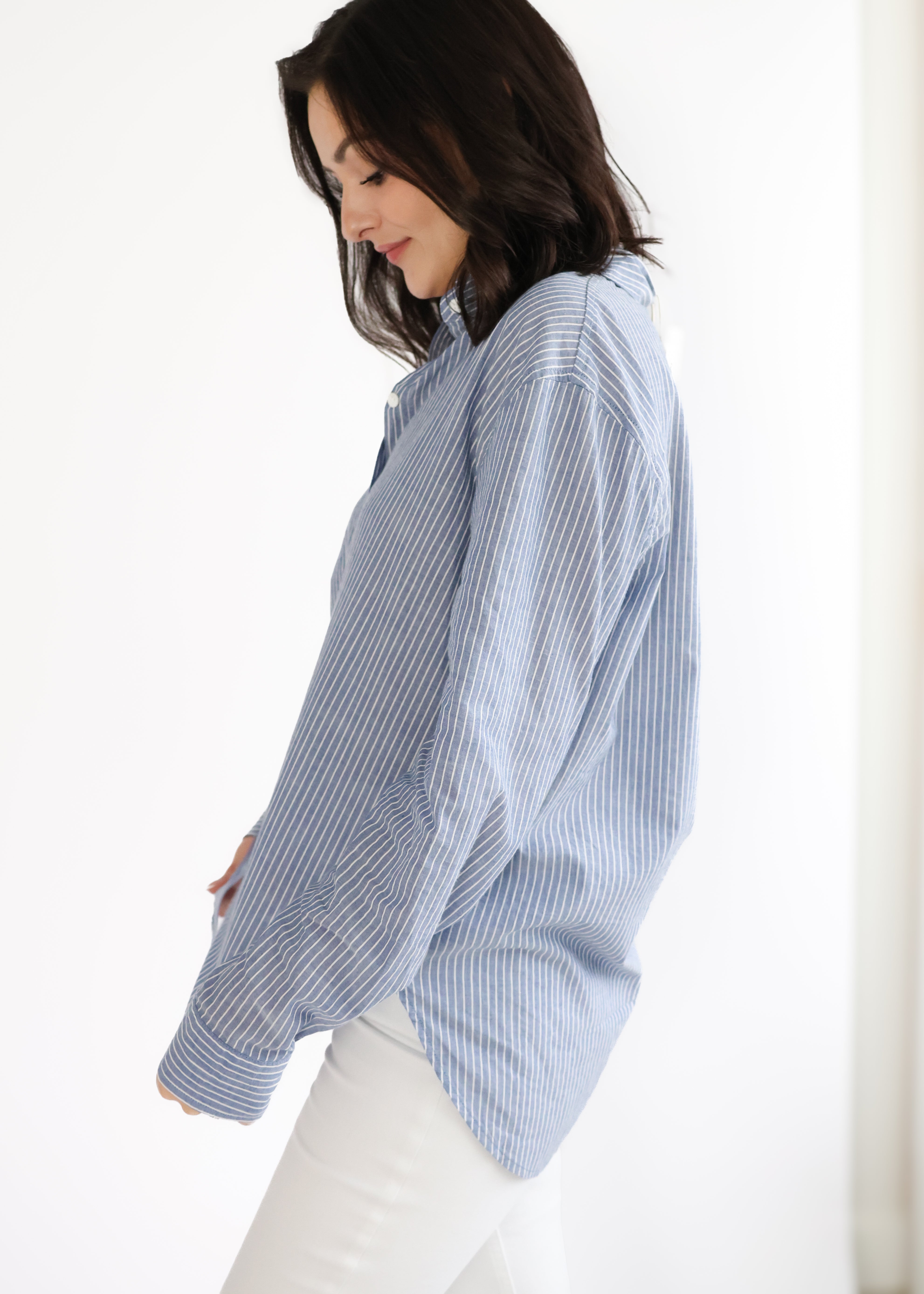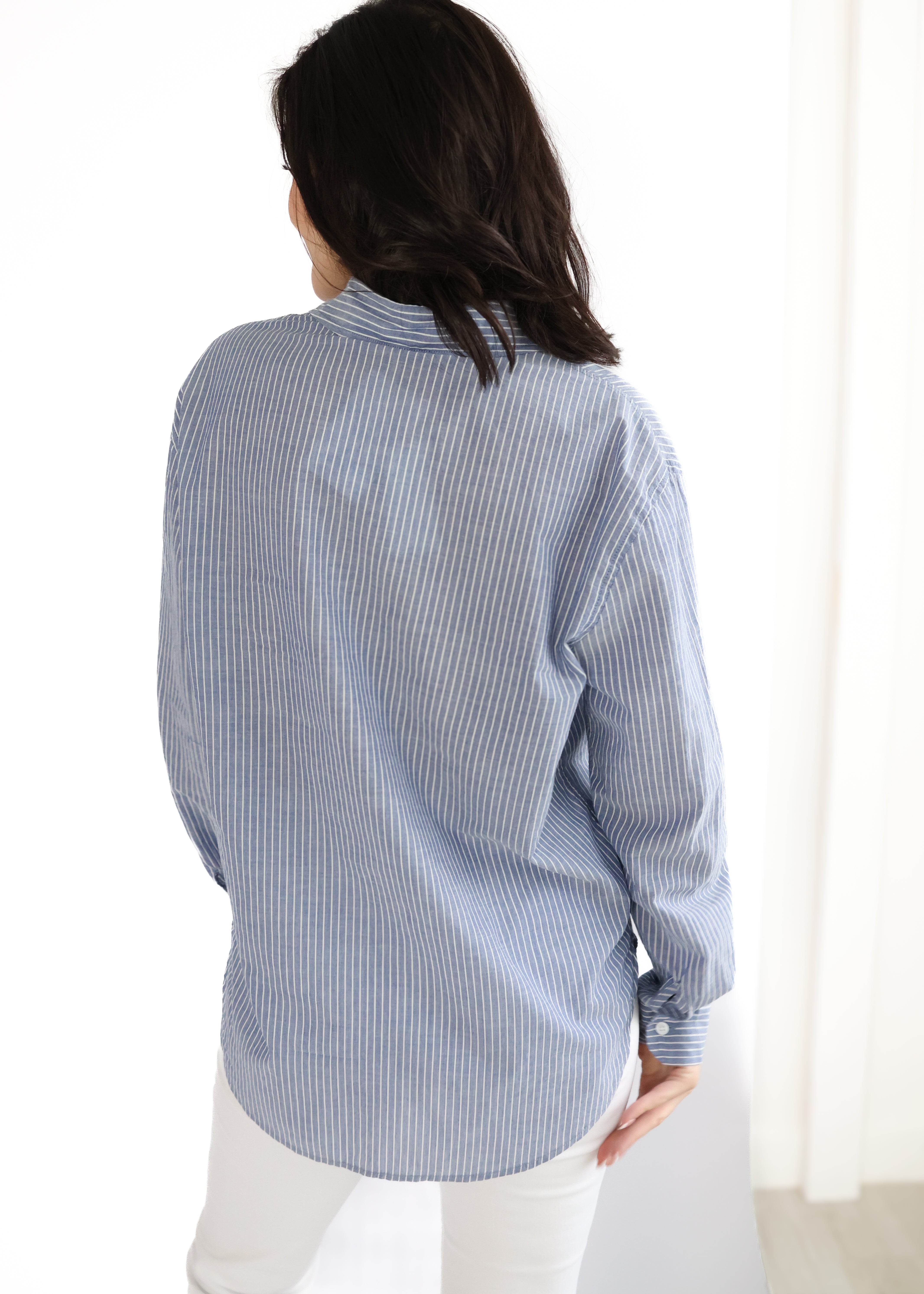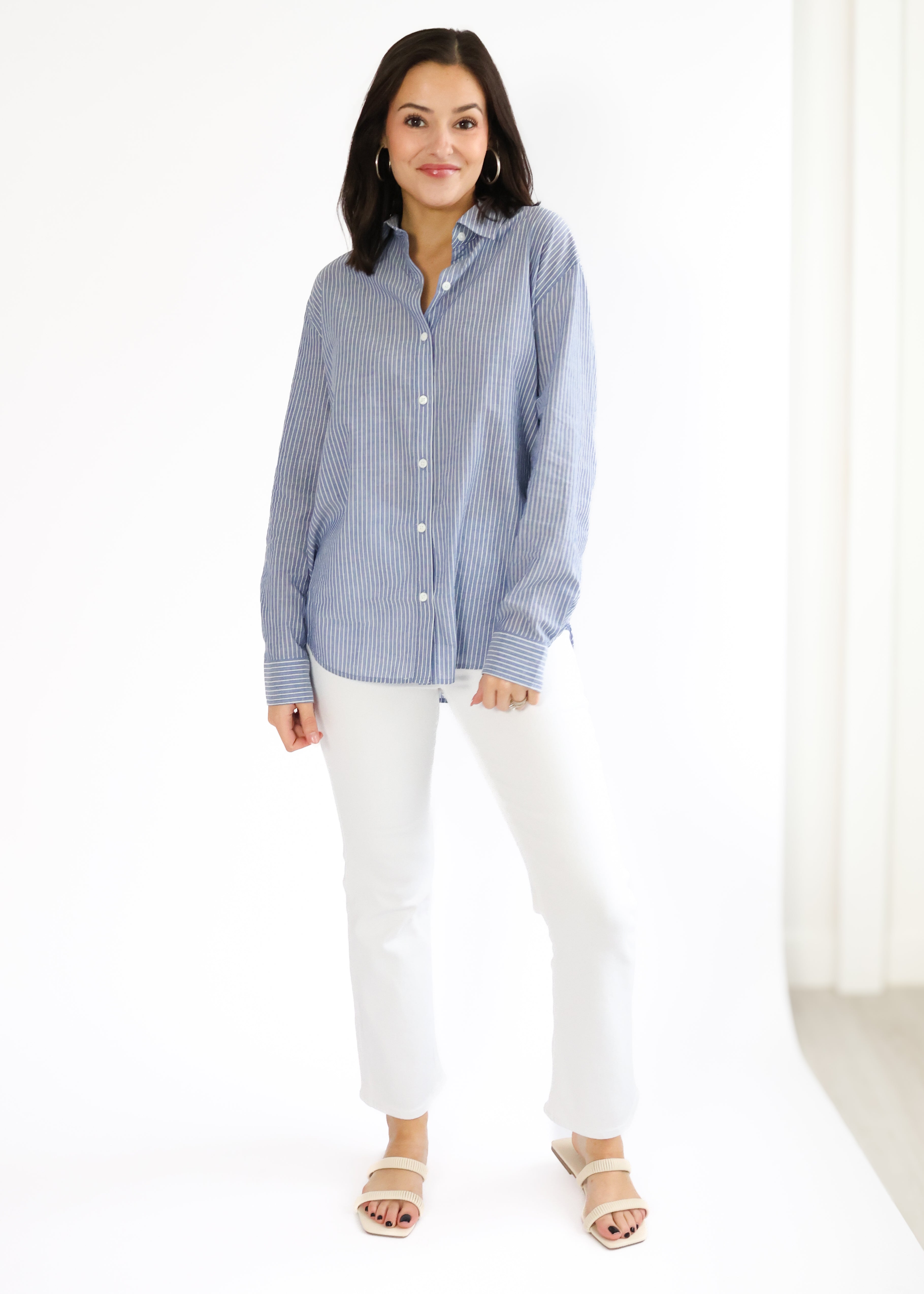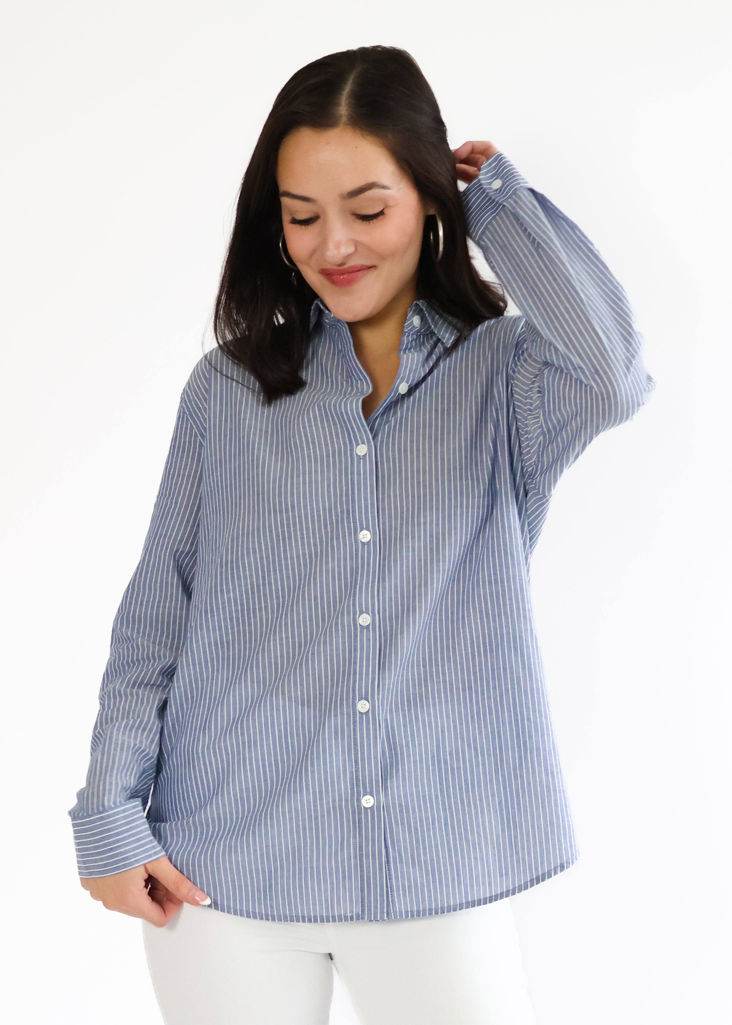 This lightweight navy and white striped button-up, made from breathable cotton voile, is perfect for layering on breezy days. With its relaxed fit and soft drape, it’s a throw-on-and-go piece you can wear anywhere, anytime! Throw it over your swimsuit as a coverup, throw on with your favorite denim cut off shorts or dress up with wedges, the styling options are endless and timeless.