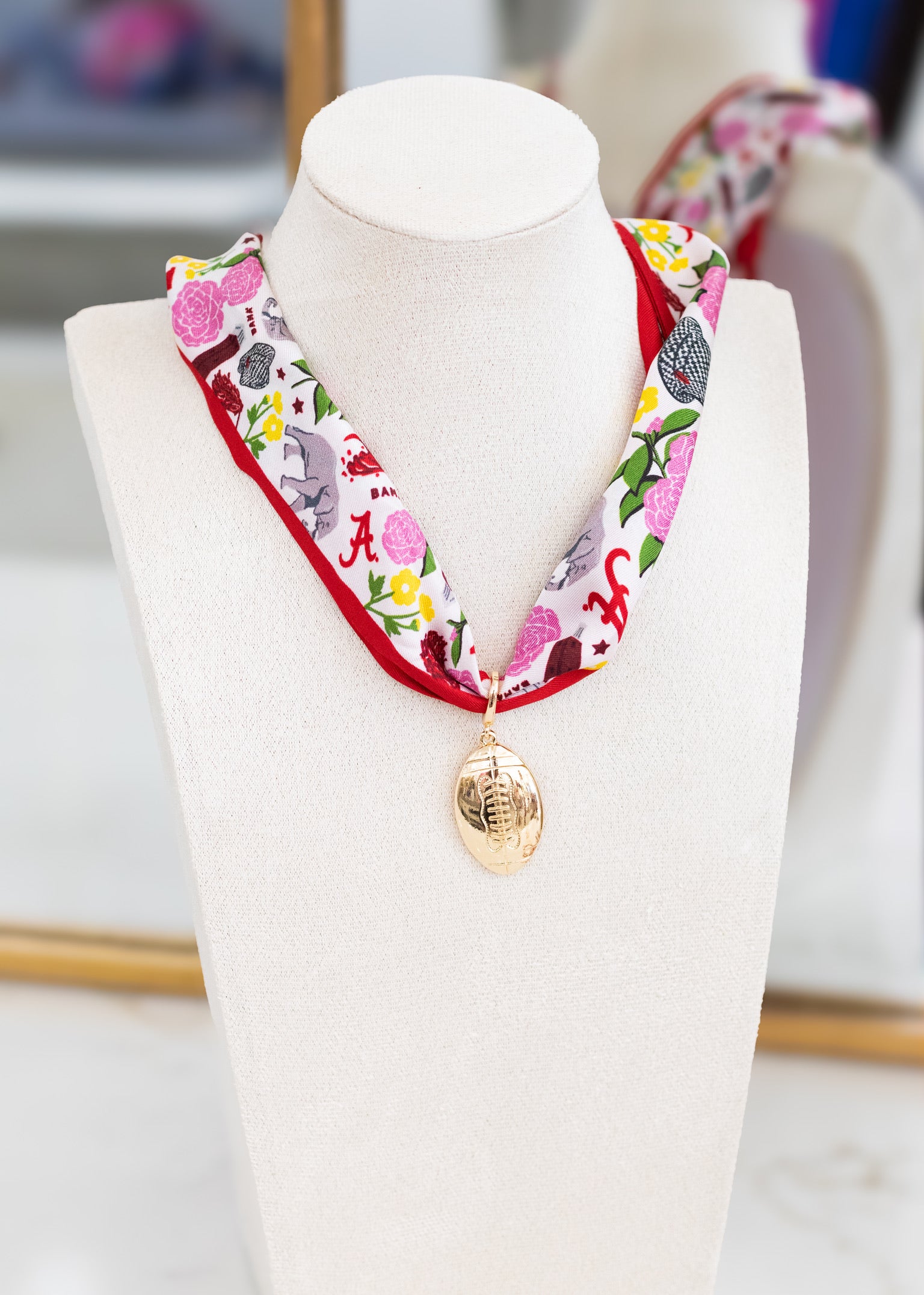 Roll Tide in style with our Alabama Twilly Scarf and Gold Football Pendant Necklace. Crafted from silky crimson-and-white fabric, this chic Twilly adds a polished touch to your game day look. The gold football pendant brings the perfect hint of glam, making it a must-have accessory for tailgates, touchdowns, and cheering on the Tide in style.
