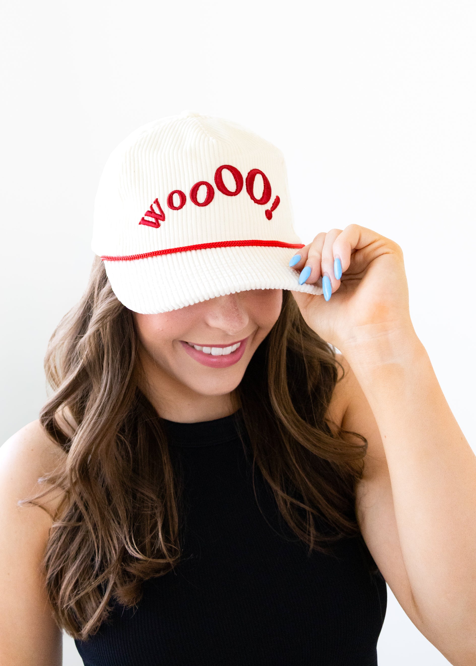 Add a fun twist to your Arkansas gameday outfit with this tan corduroy trucker hat. Featuring a bold red "Wooo!" embroidered on the front, it’s the perfect playful accessory to show your team spirit while staying stylish and comfortable!