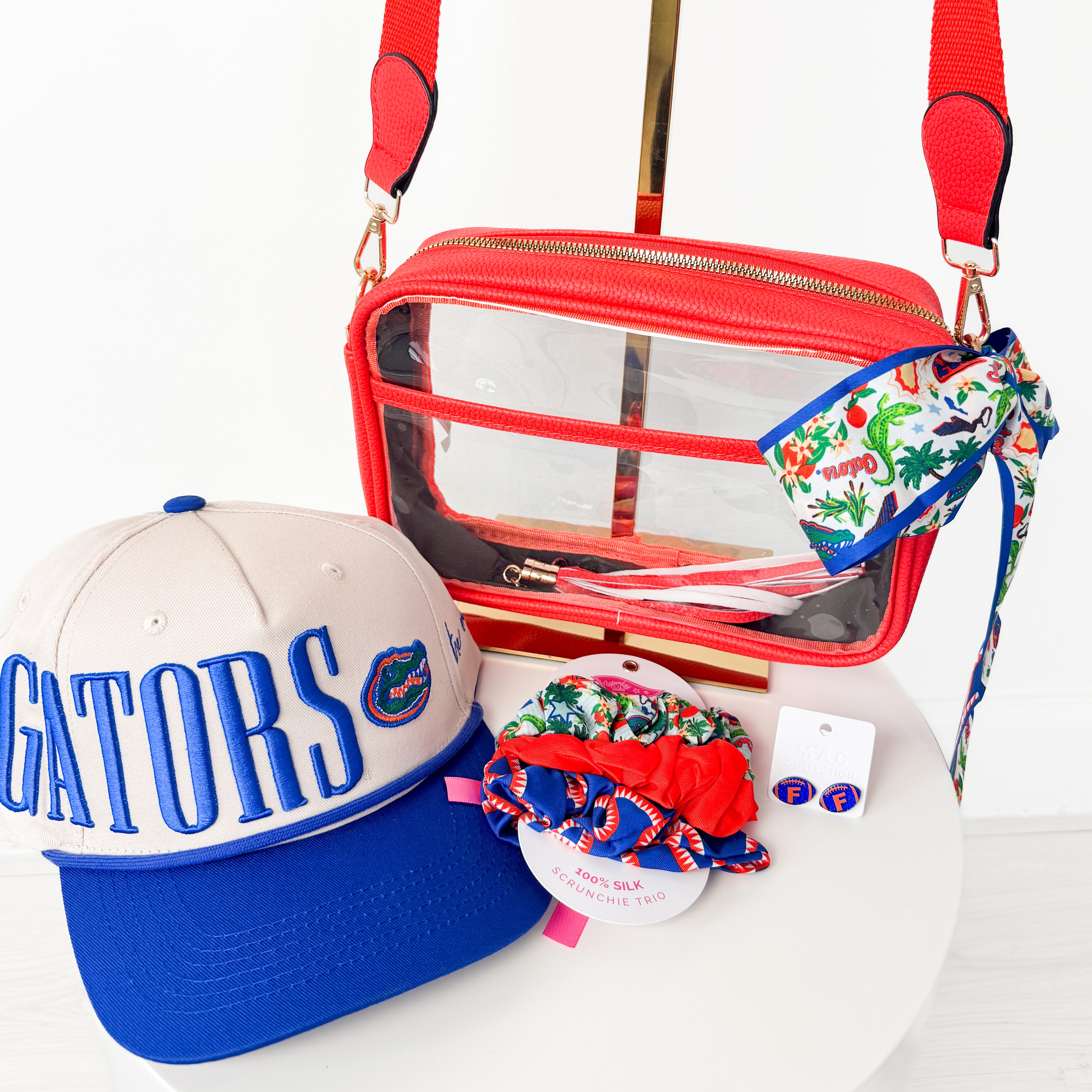 Cheer on the Gators in ultimate style with this all-in-one gameday set! The silky Florida Twilly Scarf, stadium-approved orange clear purse, Florida earrings, Gators snapback hat, and matching Florida scrunchie set make it easy to show your school pride from head to toe. Cute, coordinated, and stadium ready—this bundle has everything you need to look game-day perfect!