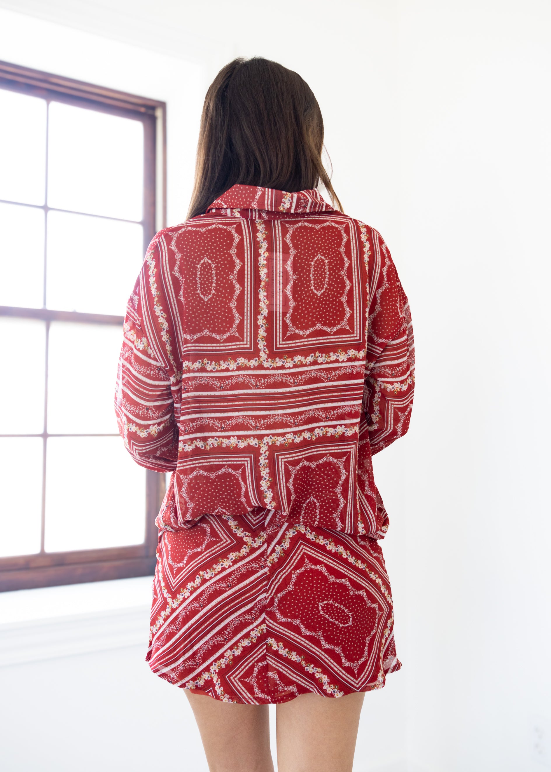 Add a pop of fun to your wardrobe with our Scarlet Thread Button Down. This playful long sleeve button-down top features a charming bandana print that effortlessly pairs with our Scarlet Thread Mini Skirt for a coordinated look. Perfect for mixing and matching, it brings a stylish twist to your everyday outfit.