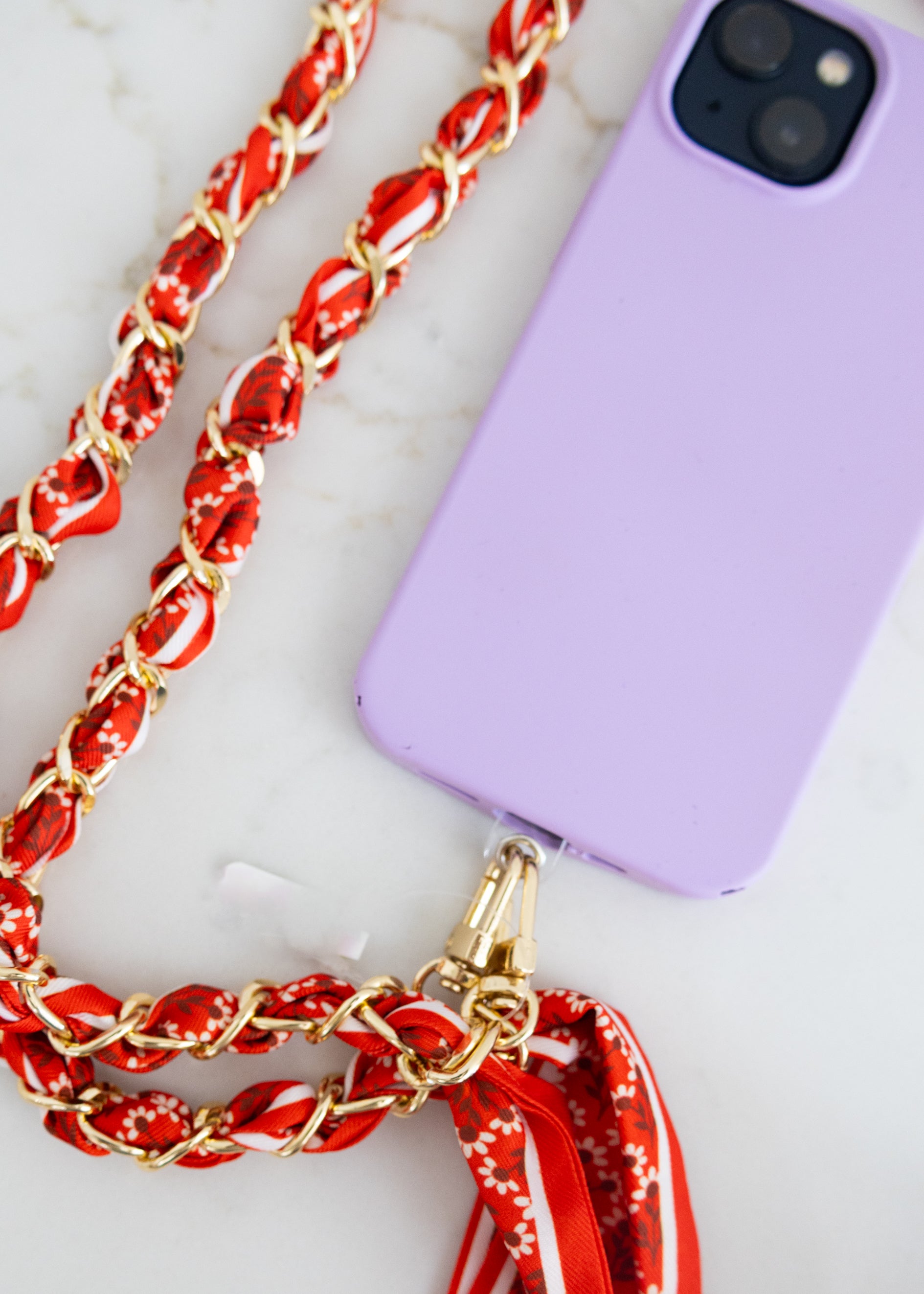 Elevate your bag or phone with the Chain Scarf Strap, a bold accessory that blends fashion and function. Featuring a gold chain interwoven with luxe patterned fabric, this versatile strap adds a touch of gameday glam to any crossbody bag or phone case. Perfect for the stadium, tailgate, or brunch with your girls — it’s the ultimate way to show team spirit while keeping your look chic and elevated.