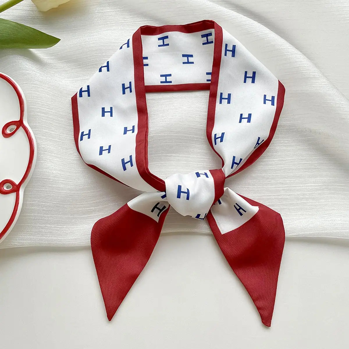 Wrap yourself in charm with the H Twilly Scarf—a playful blend of crisp white fabric, vibrant red lining, and bold navy H patterns. Perfect for adding a pop of personality to any outfit, this lightweight accessory brightens your look while hinting at classic elegance. Whether tied around your neck, wrist, or bag, it’s a fun and versatile way to express your style.