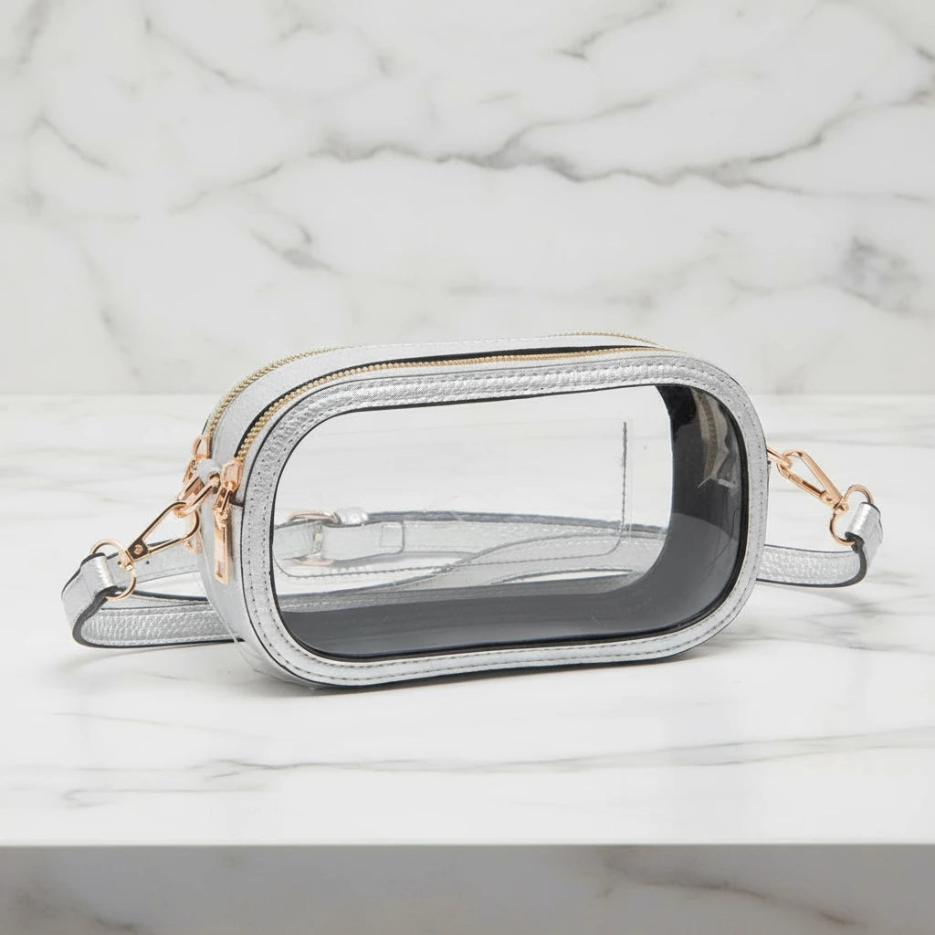 Make game day a breeze with our Clear Game Day Purse in silver! This see-through bag is not only fashionable, but also complies with stadium rules. Wear it over your shoulder or as a crossbody.
